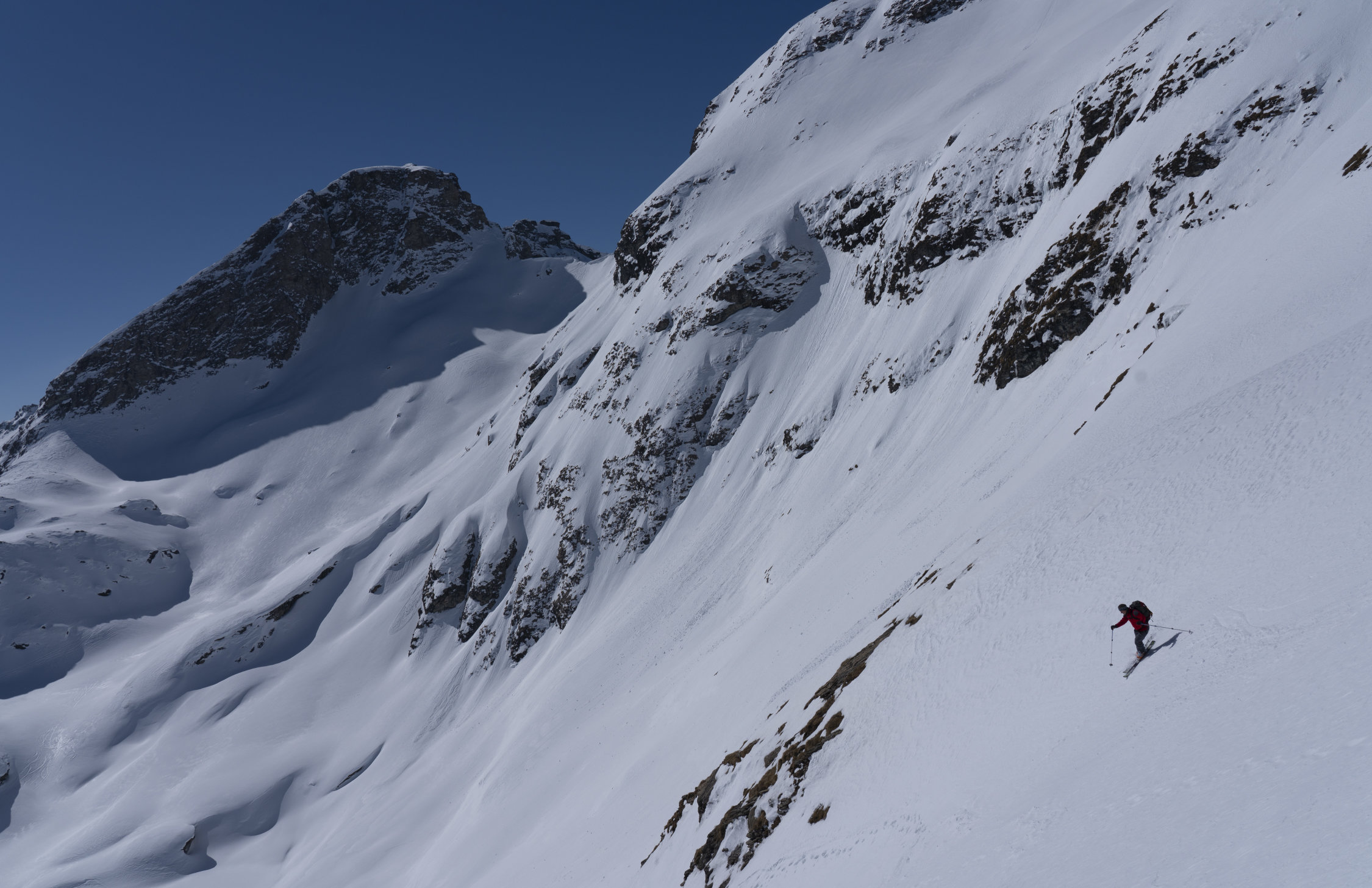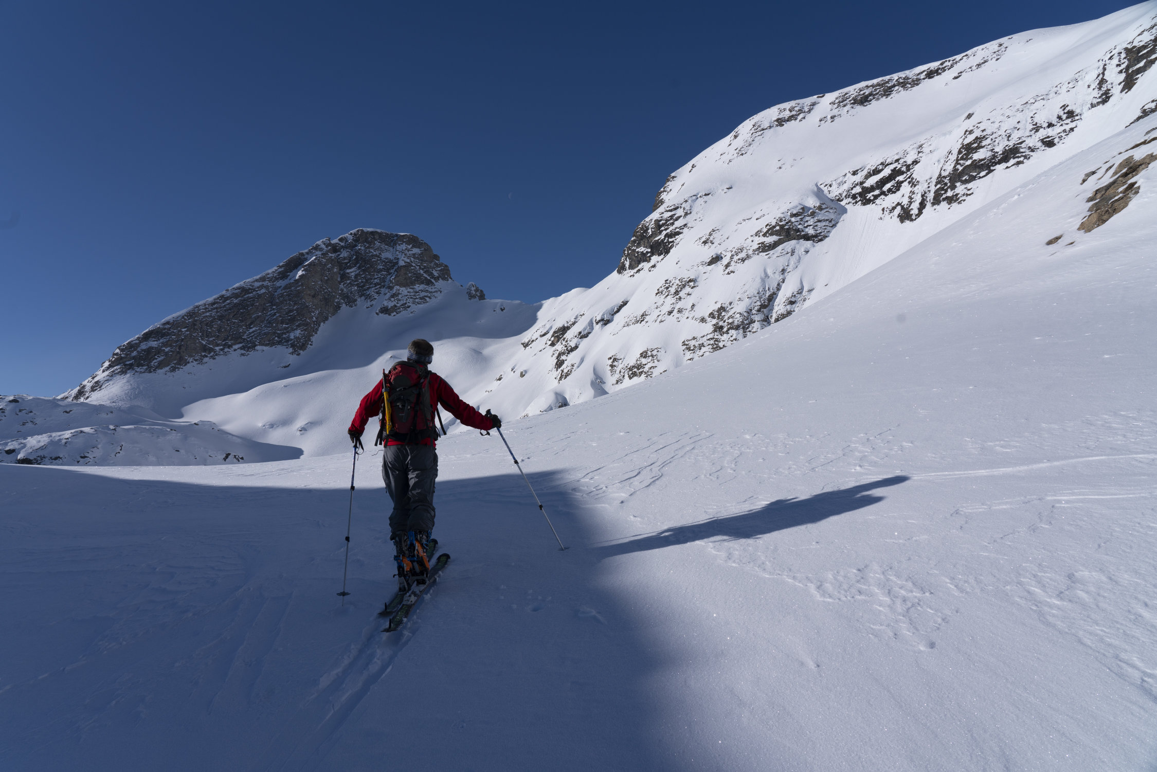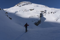 Die Steilstufe, die zum Gipfelgrat führt, konnten wir mit Harscheisen auf Ski überwinden. Es braucht aber eine ausgefeilte Spitzkehren-Technik, vor allem, wenn die Flanke am frühen Morgen noch hartgefroren ist.