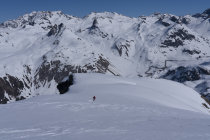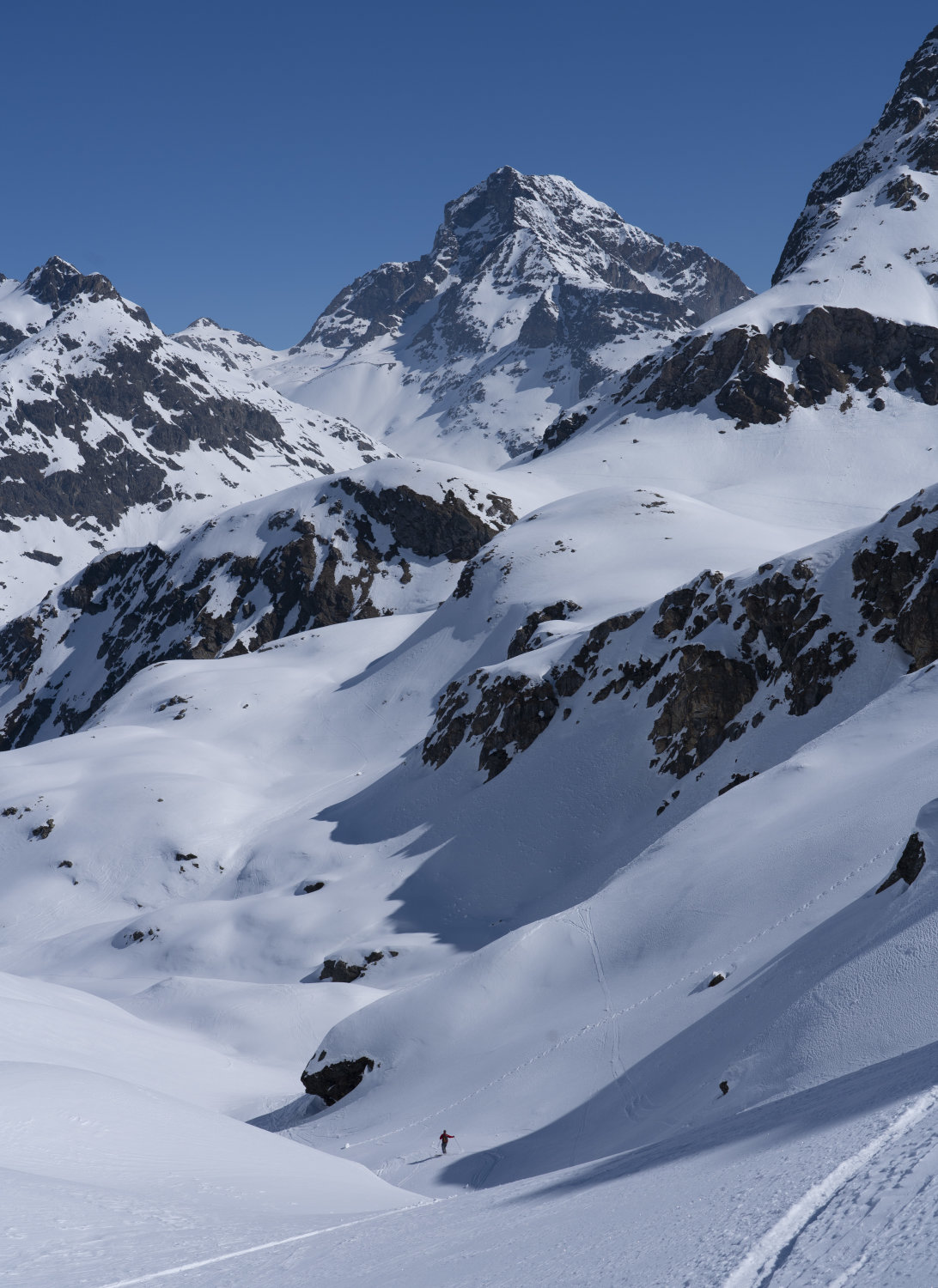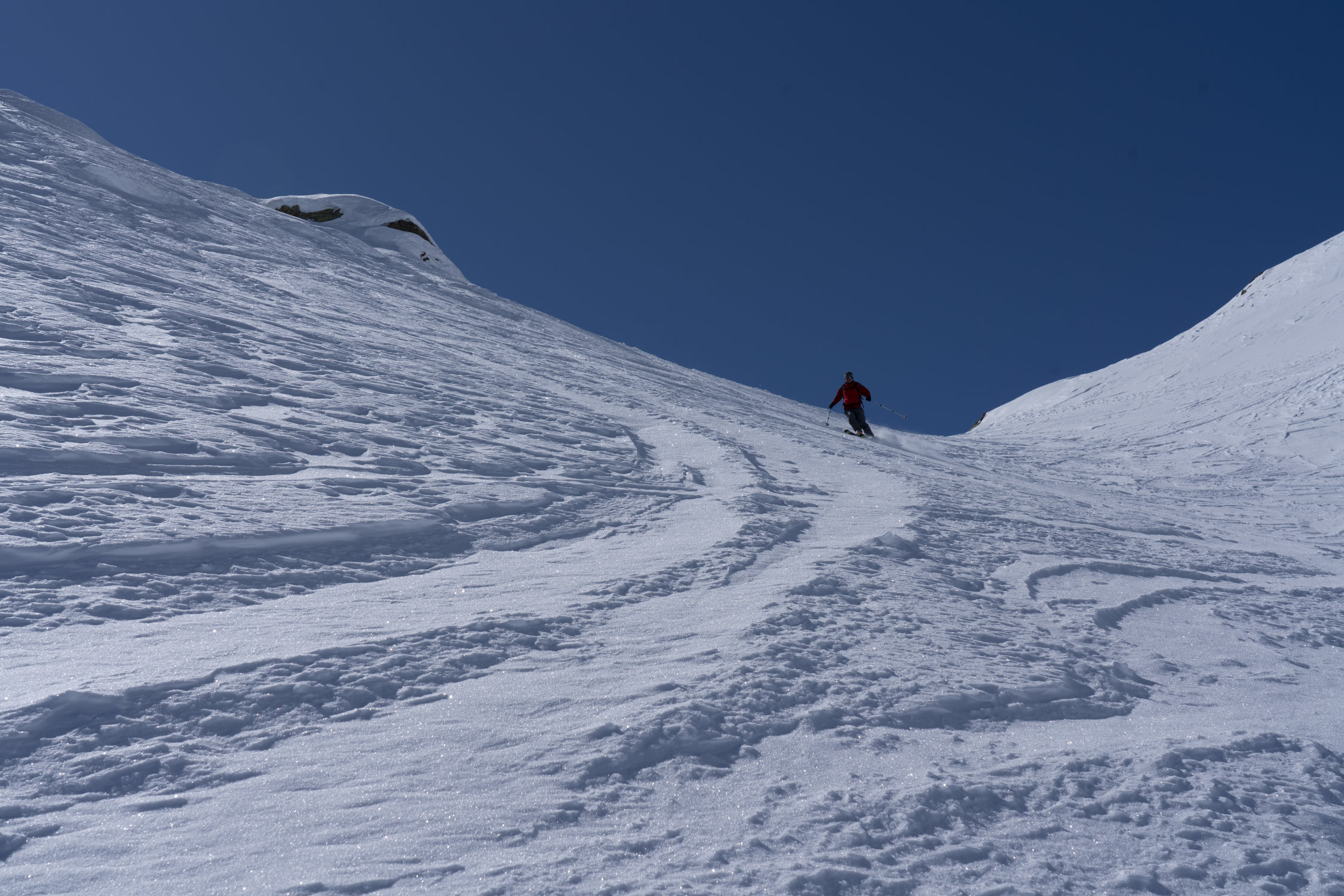 Nachdem wir vor Wochenfrist noch Powder in der Nordflanke des Piz da las Coluonnas vorgefunden hatten, haben wir heute nochmals das Gebiet besucht. Und es hat sich gelohnt. In dieser Woche ist nur sehr wenig Neuschnee gefallen. Dieser wurde vom Winde verweht und hat die alten Spuren zumindest zum Teil zugedeckt. Die oben beschriebene Route, die im Führer nur als Variantenabfahrt aufgeführt ist, kann ich nur empfehlen. Wir haben in der Gipfelflanke Sulz und weiter unten gut fahrbaren (z. T. auch gepressten) Pulverschnee vorgefunden. Entsprechend war die Abfahrt ein Genuss.