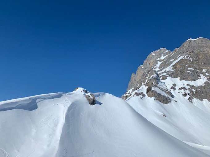 Aufstieg problemlos machbar auch durch den Wald. Ab Grimmifurggi ziemlich warm, dennoch etwas hart. Eine Stunde auf dem Gipfel verbracht (ohne Wind) und die herrliche Bergwelt genossen. Ca. um 11.00 Uhr abgefahren. Von Gipfel rechts gehalten und dann in die Nordseite traversiert. Dort hat es noch Pulver - jedoch heute nicht gefährlich. Dann Richtung Pt. 1808 und über Nidegg zum Parkplatz. Dort wird der Schnee in den nächsten Tagen Mangelware.