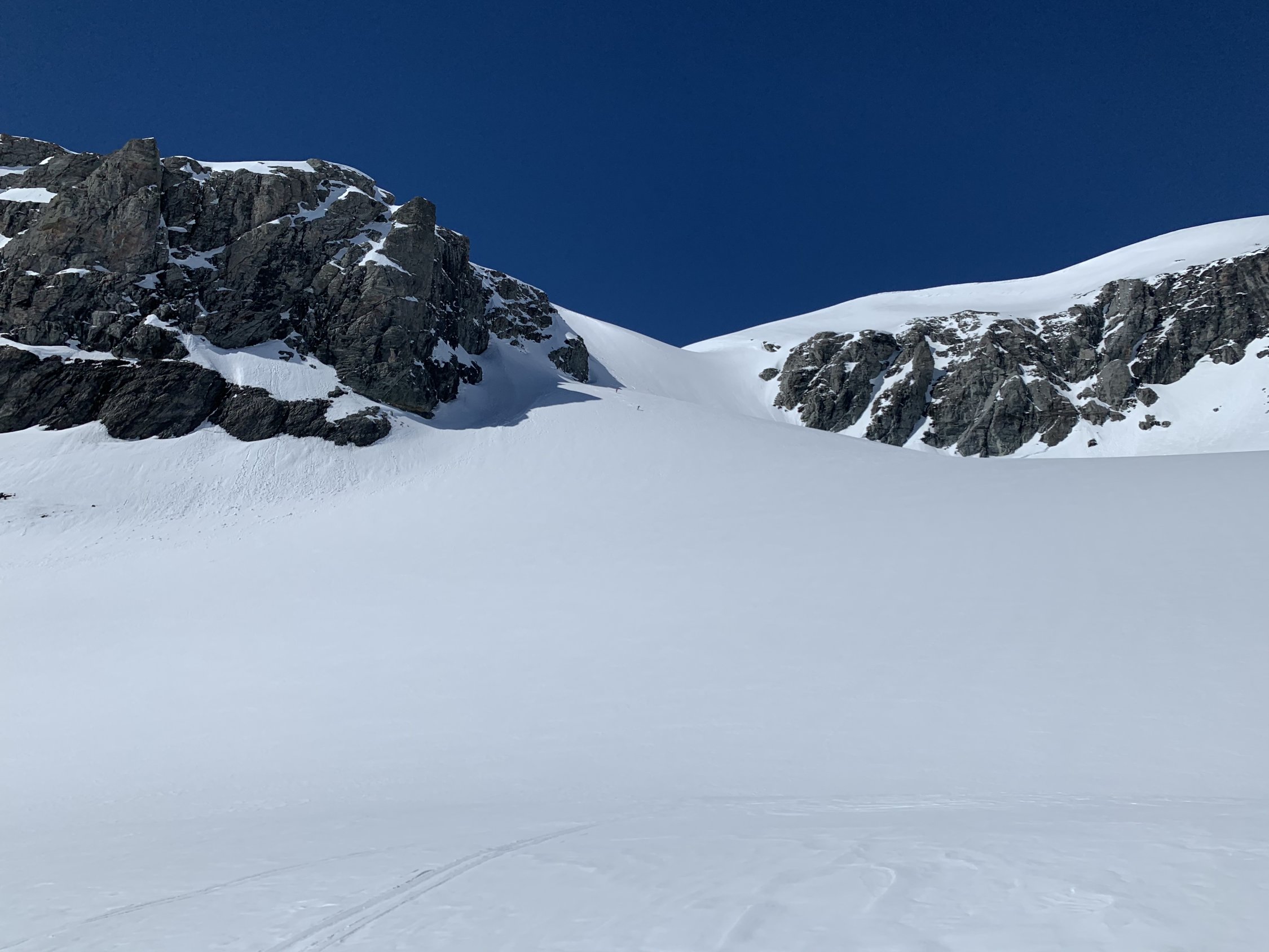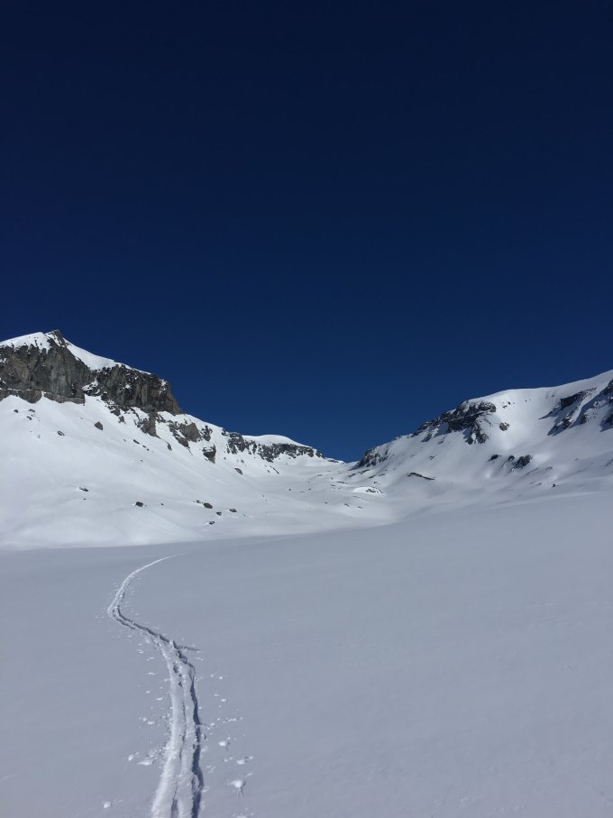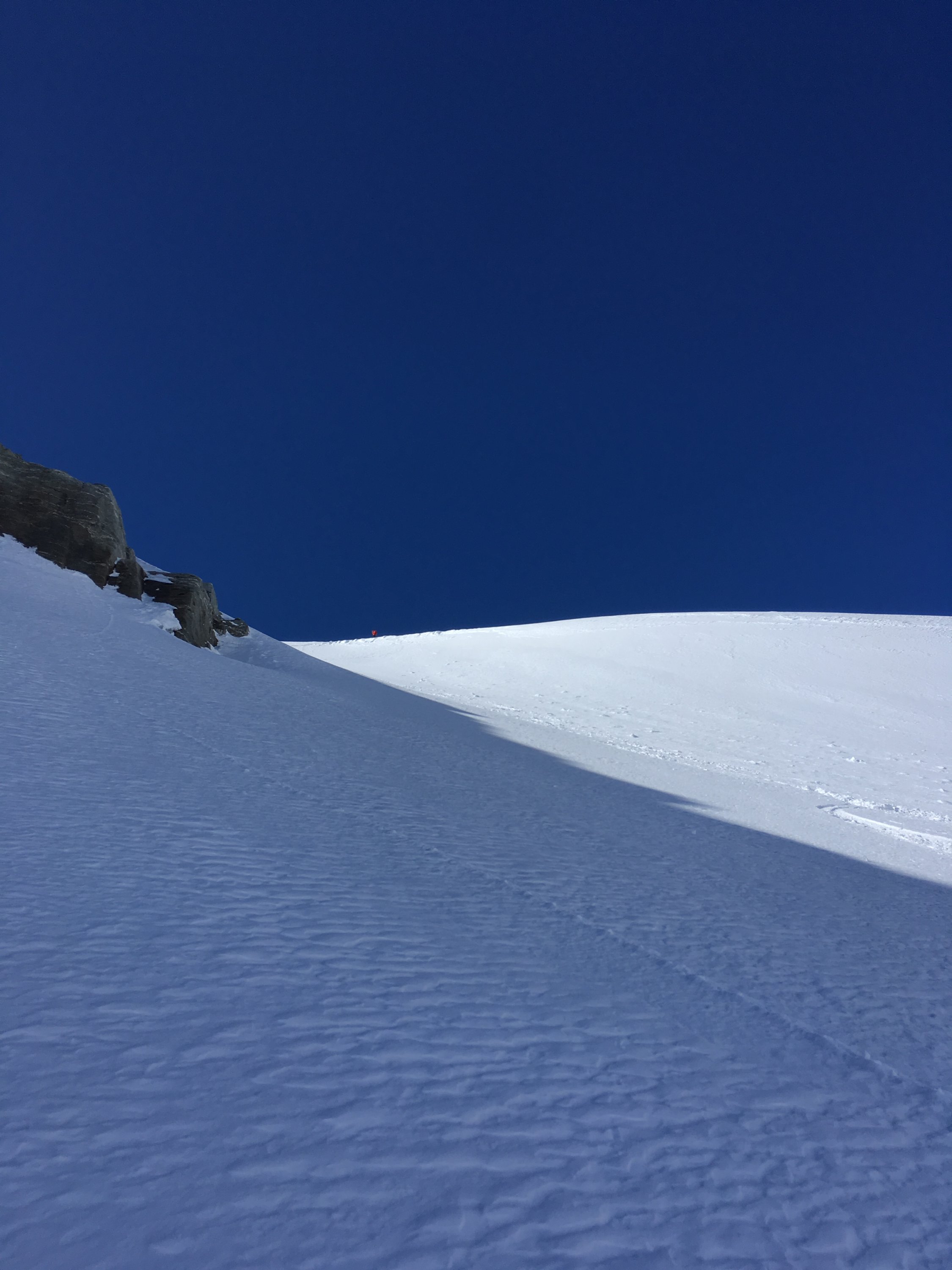 Wir stiegen nicht wie gewohnt über das Surenjoch auf, sondern nahmen das Couloir in nördlicher Richtung. Oben wenig Schnee. Wenn möglich keine Schwünge, den die Steine lassen grüssen.