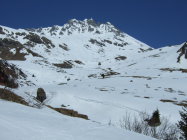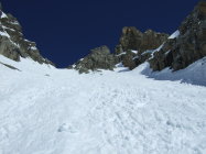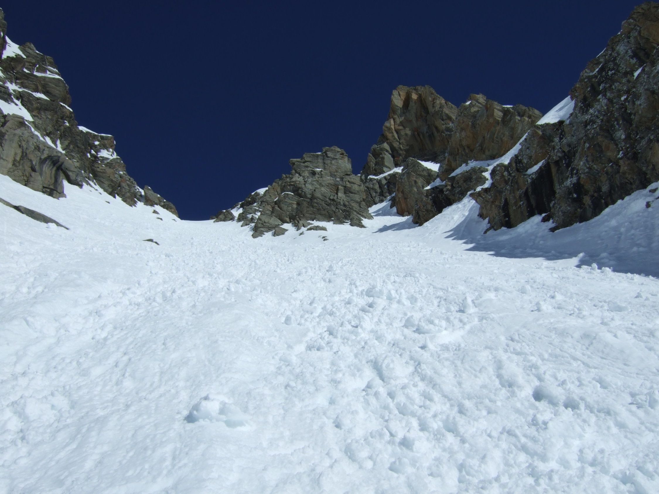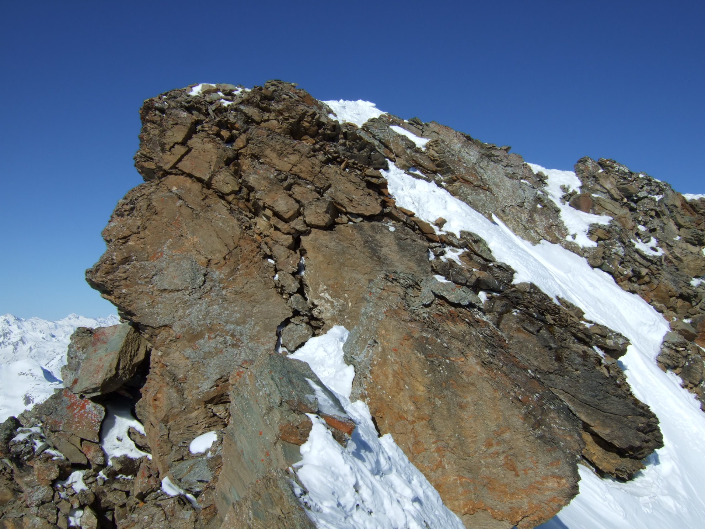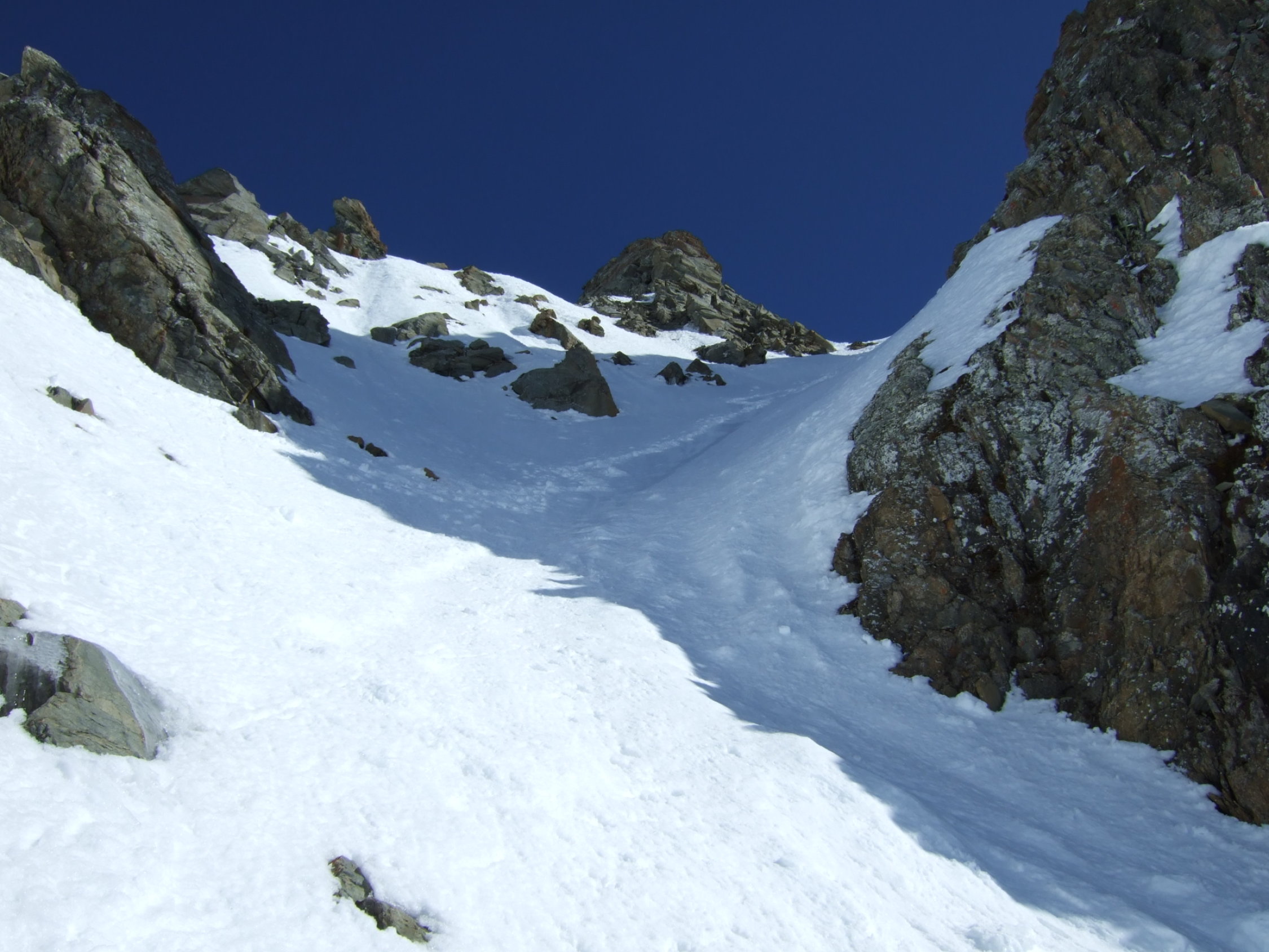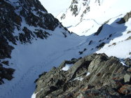 Skidepot beim Einstieg in die Rinne. Gestern wurde durch die linke Rinne bis auf den Grat mit Ski aufgestiegen. Zu Fuß bester Trittschnee ganz hoch. Auch Felsgrat zum Hauptgipfel ging sehr gut. Fixseil im Aufstieg zum Gipfel vorhanden.