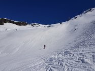 Herrliche Abfahrt! Um ca. 14:00 ist die vereiste Kruste teils aufgeweicht, teils noch nicht. Wir wählten zur Abfahrt den linken steilen Couloir.