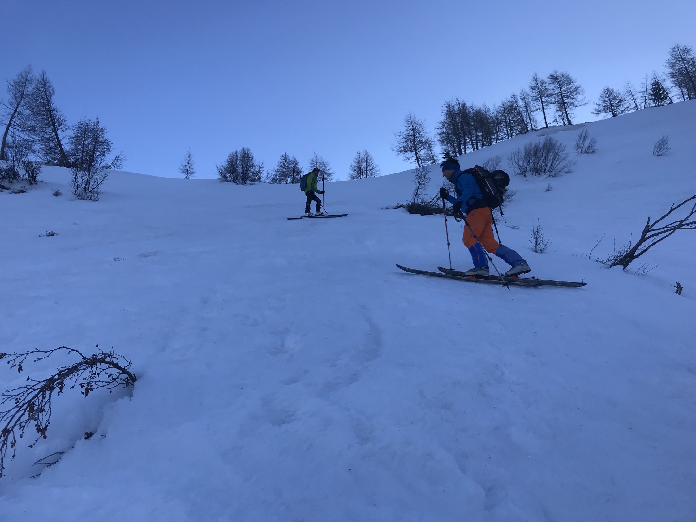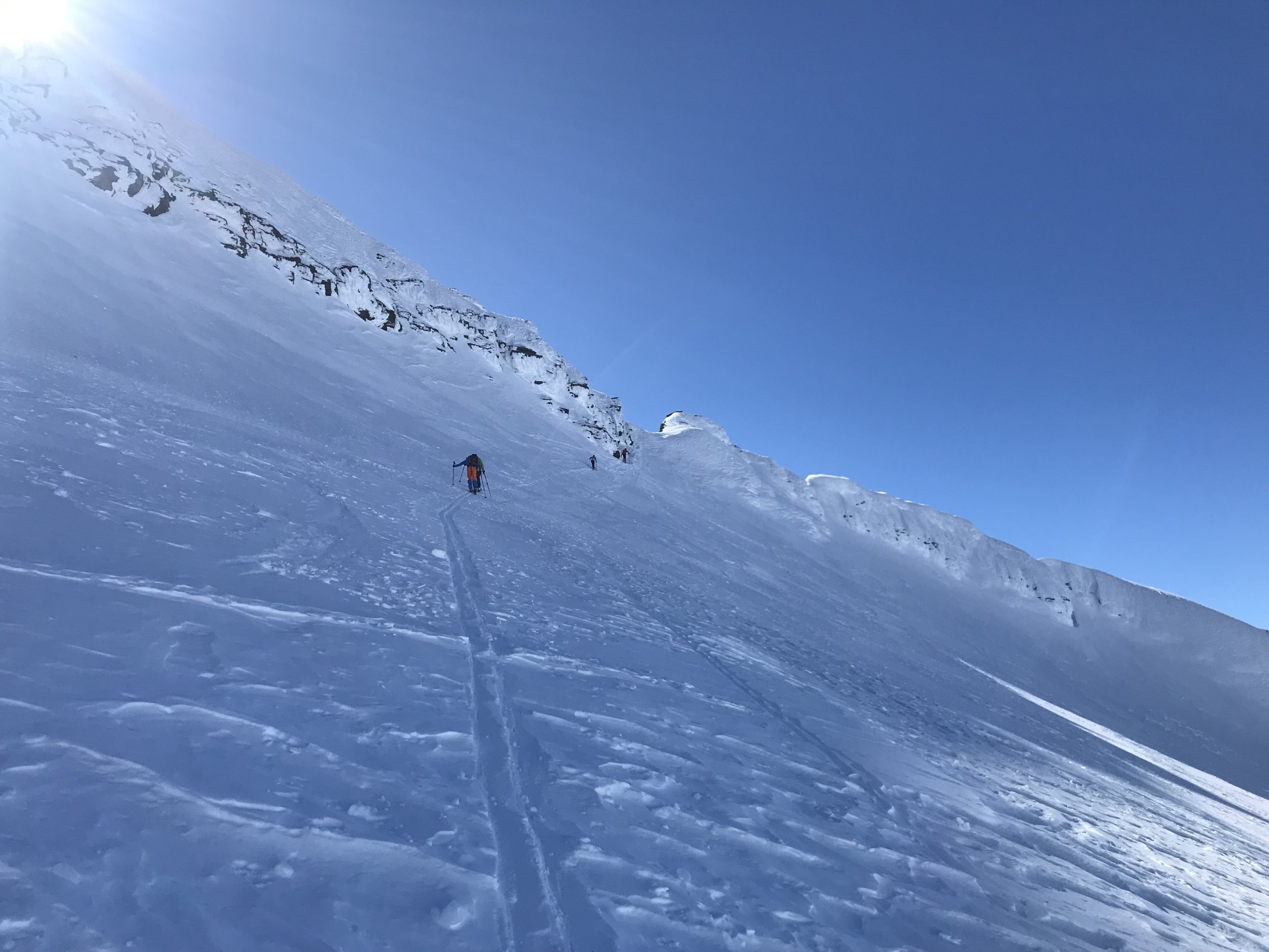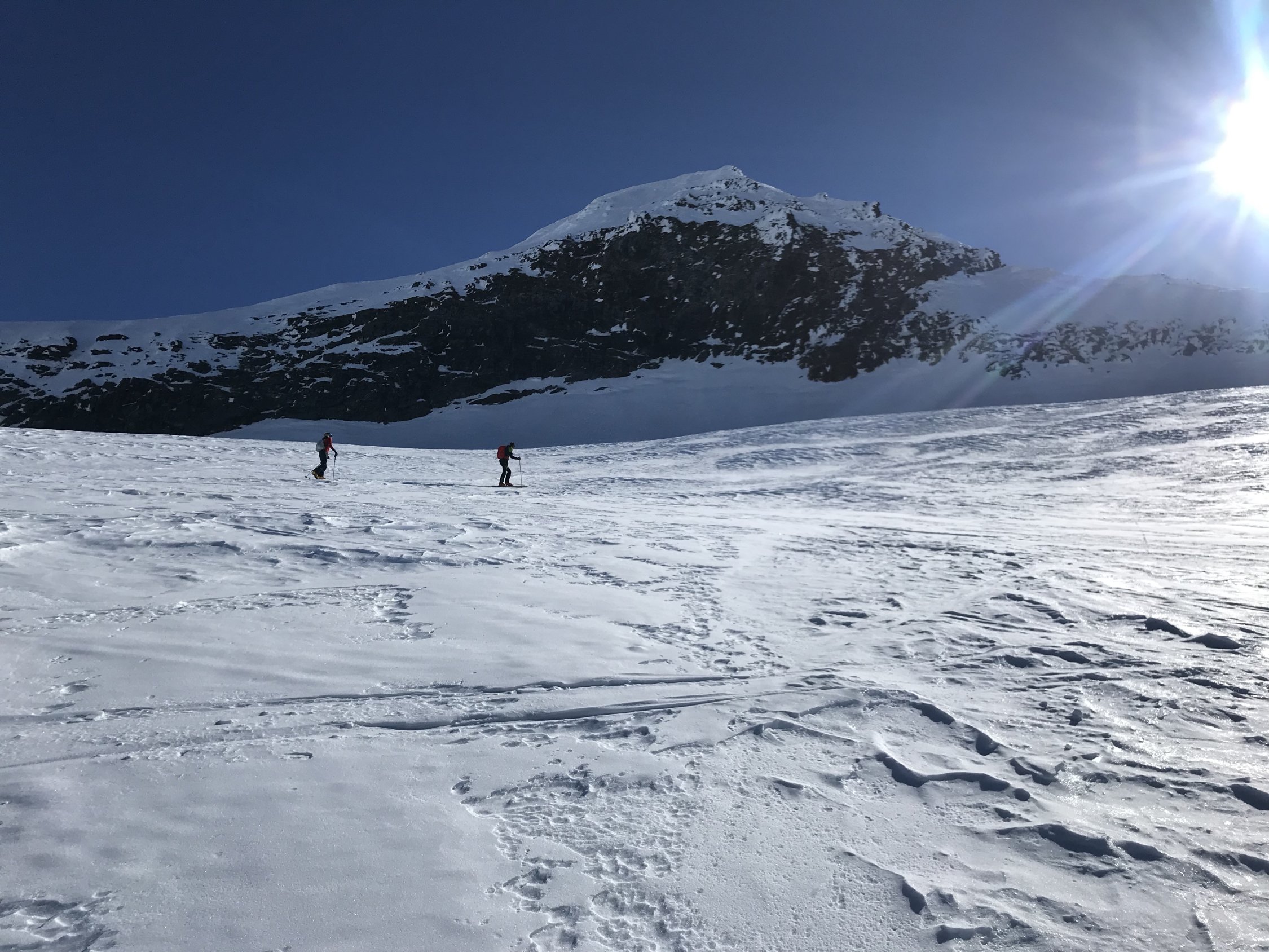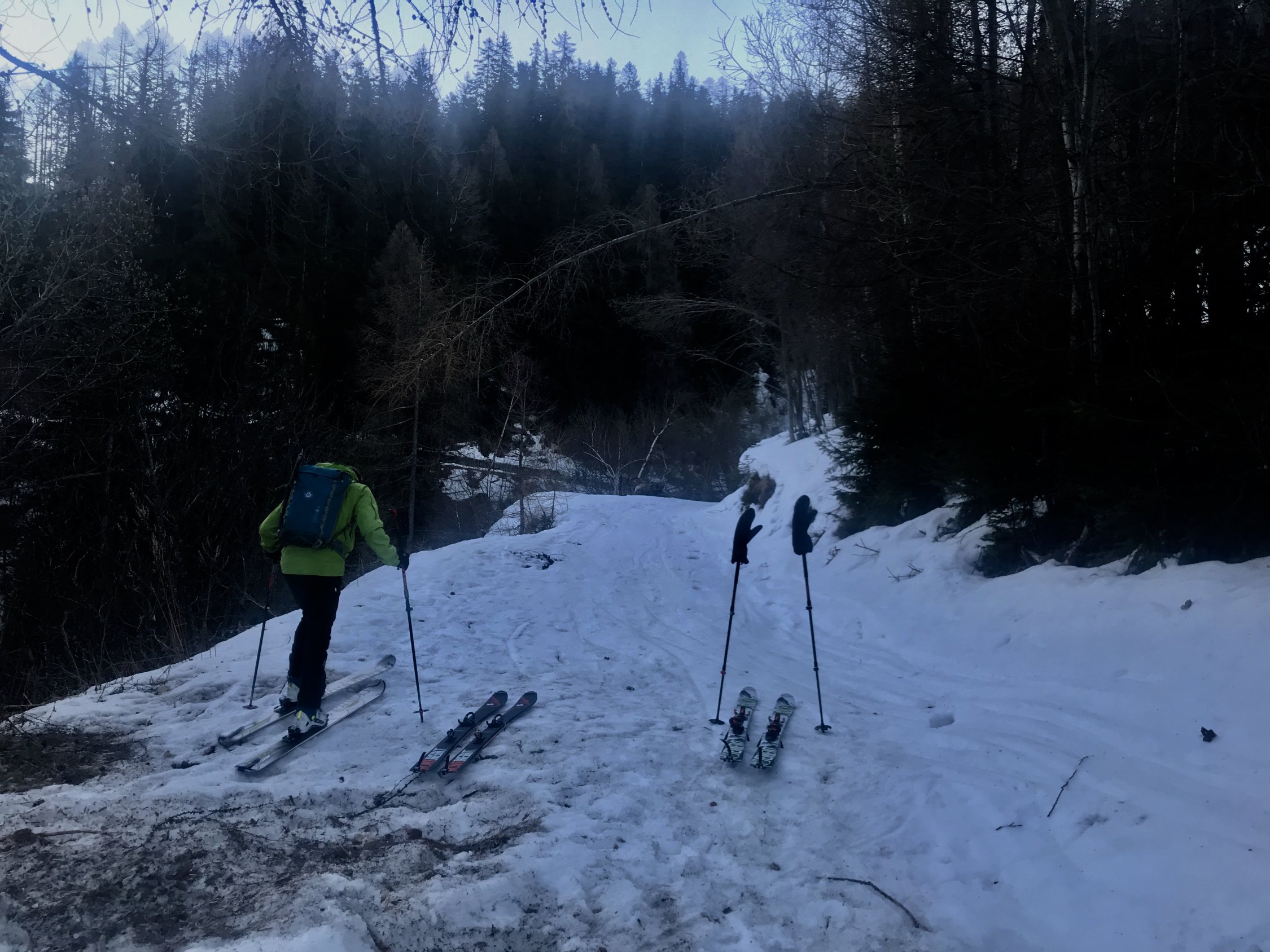 Beim Parkplatz 1'500m bindet man die Ski an und marschiert bis ca. 1'800m. Ab hier muss man sie auf dem Sommerweg ca. 100 Hm tragen, weil es zu wenig Schnee hat. Ab ca. 1'900m sind die Harscheisen zu empfehlen, da die Hänge mit zum Teil 40° zu steil werden und der Bruchharsch nicht immer gut trägt. Hat man mal die Bortelhütten erreicht, kann man theoretisch die Harscheisen einpacken; wir hatten sie bis zur Gratlücke an, weil frühmorgens der Schnee einfach immer noch zu hart ist (Bruchharsch, vereister Schnee etc.)