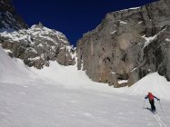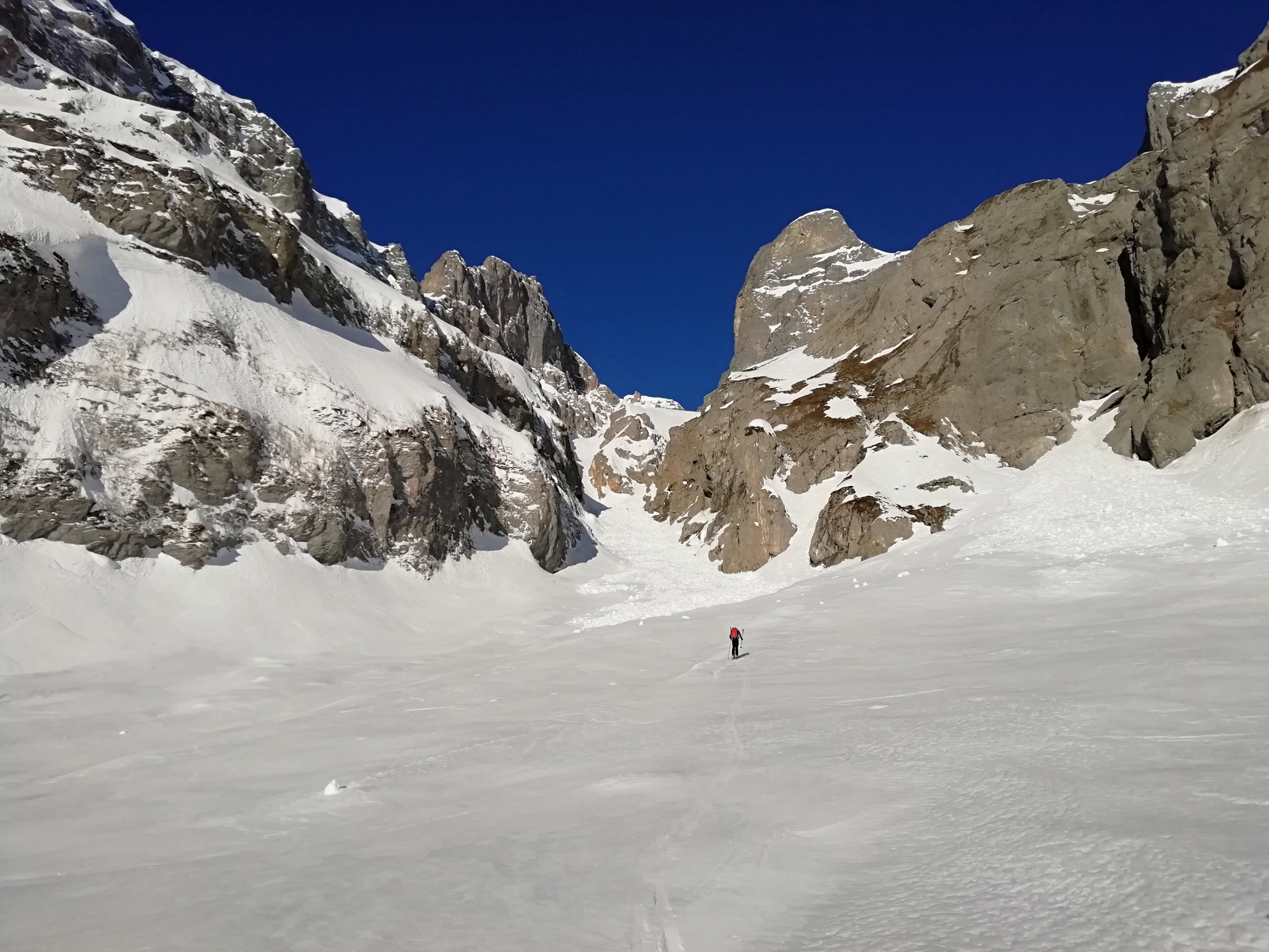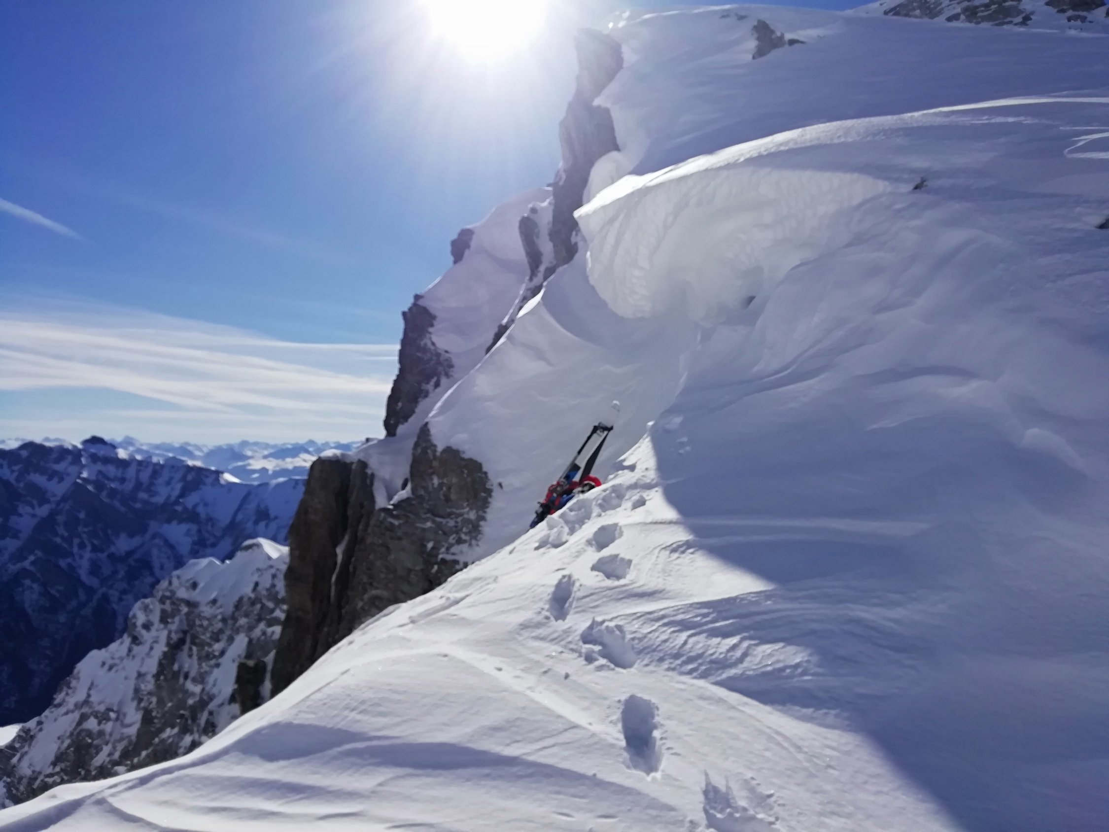 Der Schnee in der Ochsenfurggla wechselhaft, dadurch mühsam aber gut machbar. Ausstieg oben zwischen zwei Wächtenabschnitten gerade so machbar.