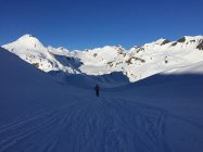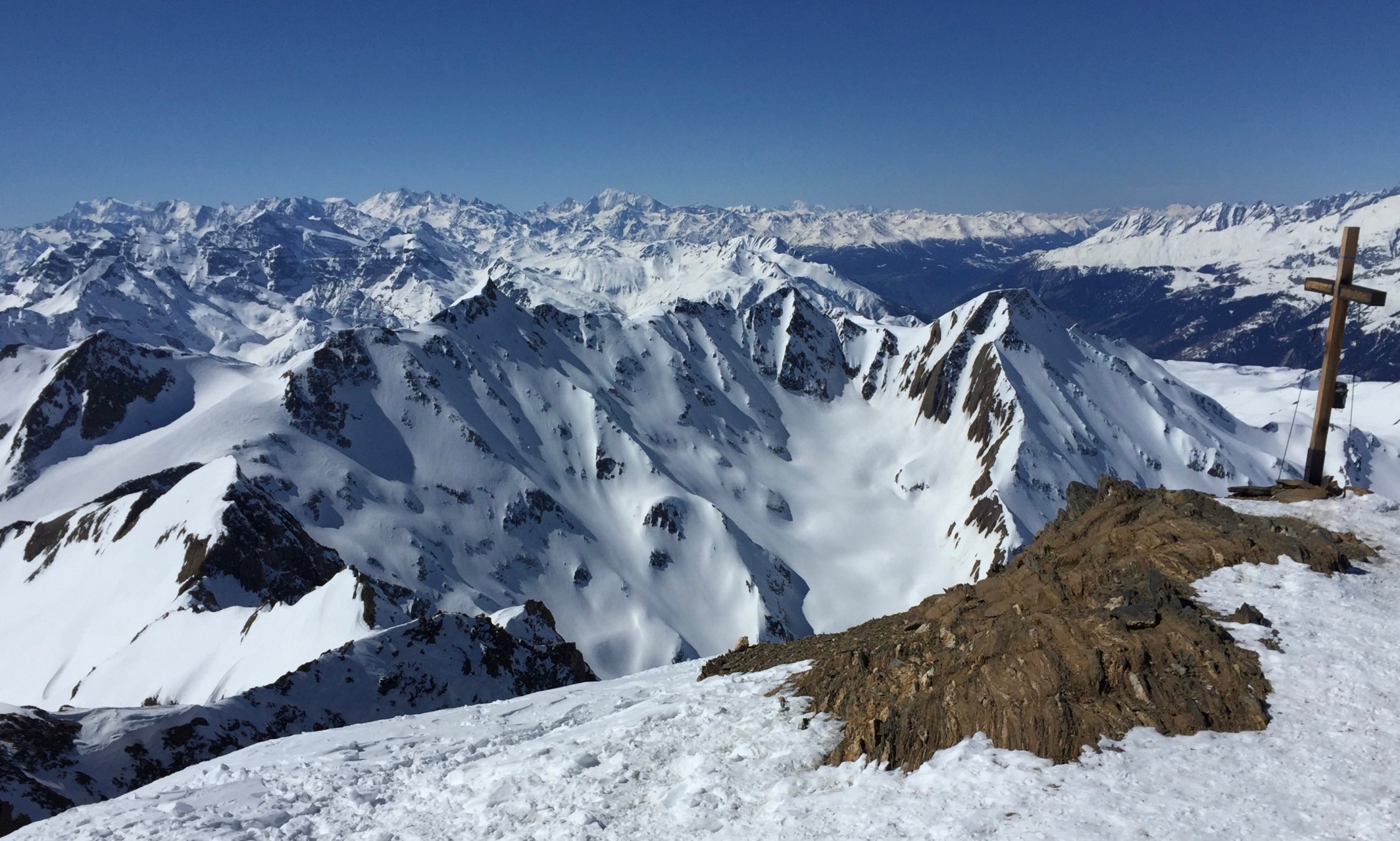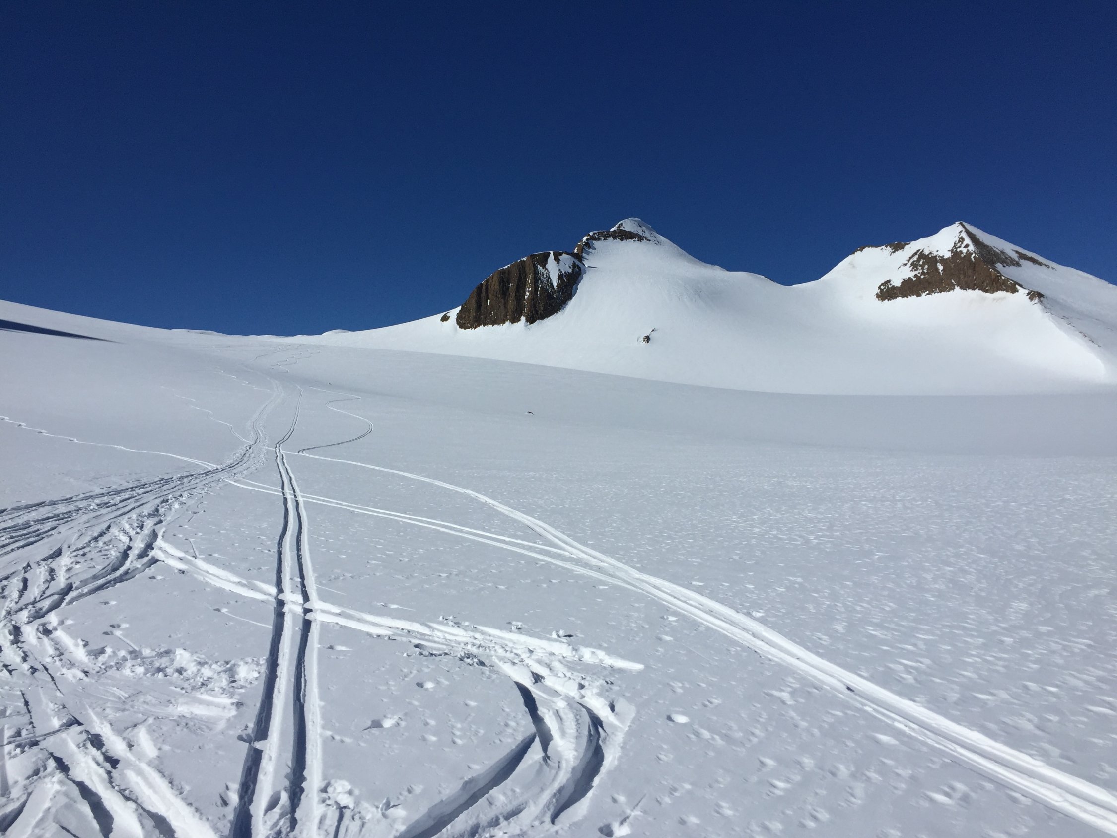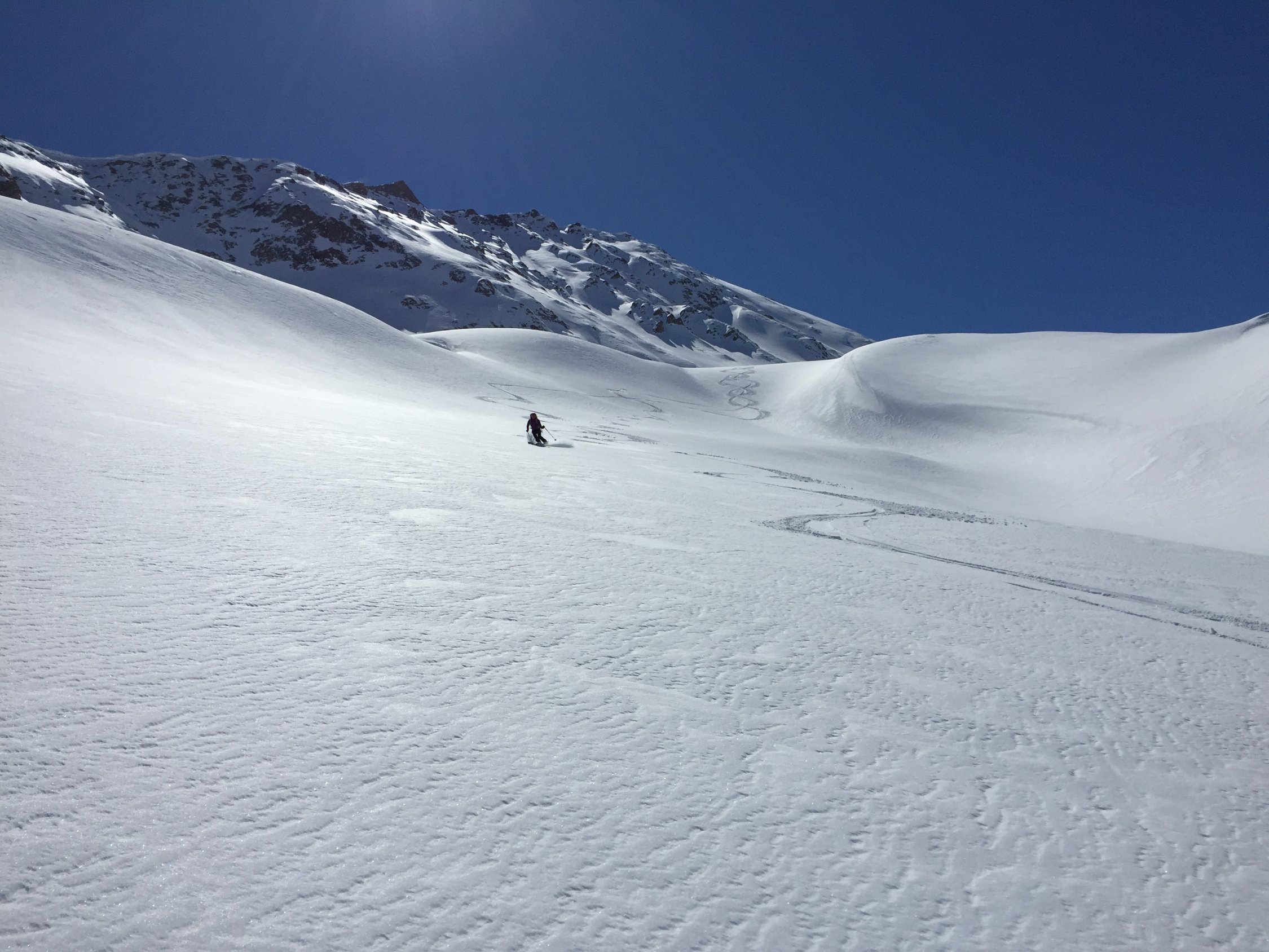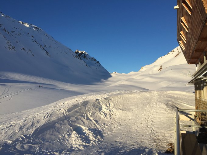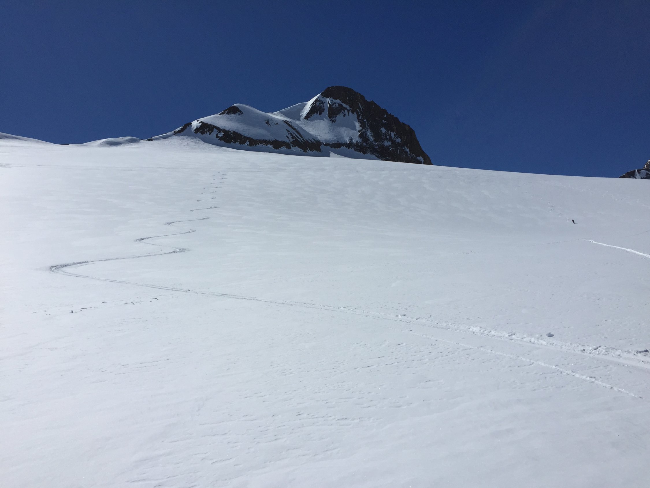 Heute von der Corno Gries Hütte eine schön einsame Tour. Der Gletscher ist gut eingeschneit. Für den Gipfelhang sind Harscheisen hilfreich, für den Gipfelaufstieg ab Skidepot die Steigeisen nicht notwendig. Für die Abfahrt auf dem Gletscher perfekte Schneeverhältnisse: pulvrig und Schnee wie Seide.