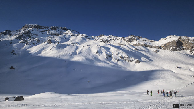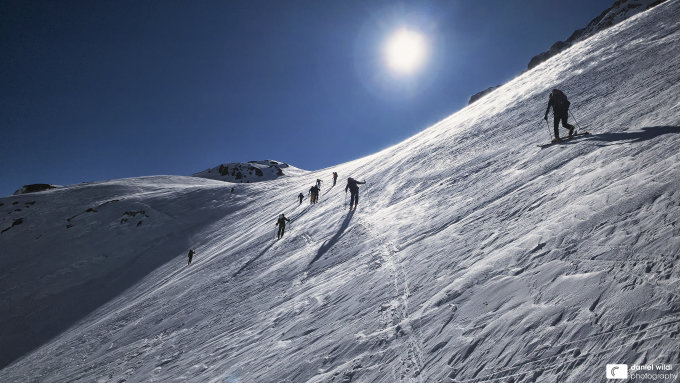 Problemloser Aufstieg, Frühstücksplatz gut gespurt und griffig. Für mich dennoch eine mentale Herausforderung ;-)
