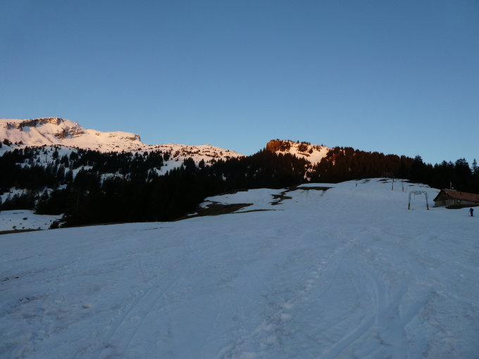 Im Aufstieg nach Obersäss liegt noch knapp genug Schnee. In der Querung am Hanenspil kurze Passage schneefrei, weiter oben noch beste Schneeverhältnisse.