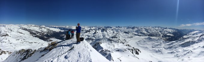 Aufstieg auf guter Spur entlang der auf der Skiroutenkarte eingezeichneten Route zum Skidepot. Aufstieg zu Fuss zum Gipfel - Steigeisen und Pickel trotz guter Spur empfehlenswert, insbesondere die letzten 50m sind etwas ausgesetzt (zwei Borhaken wären für eine Sicherung vorhanden).