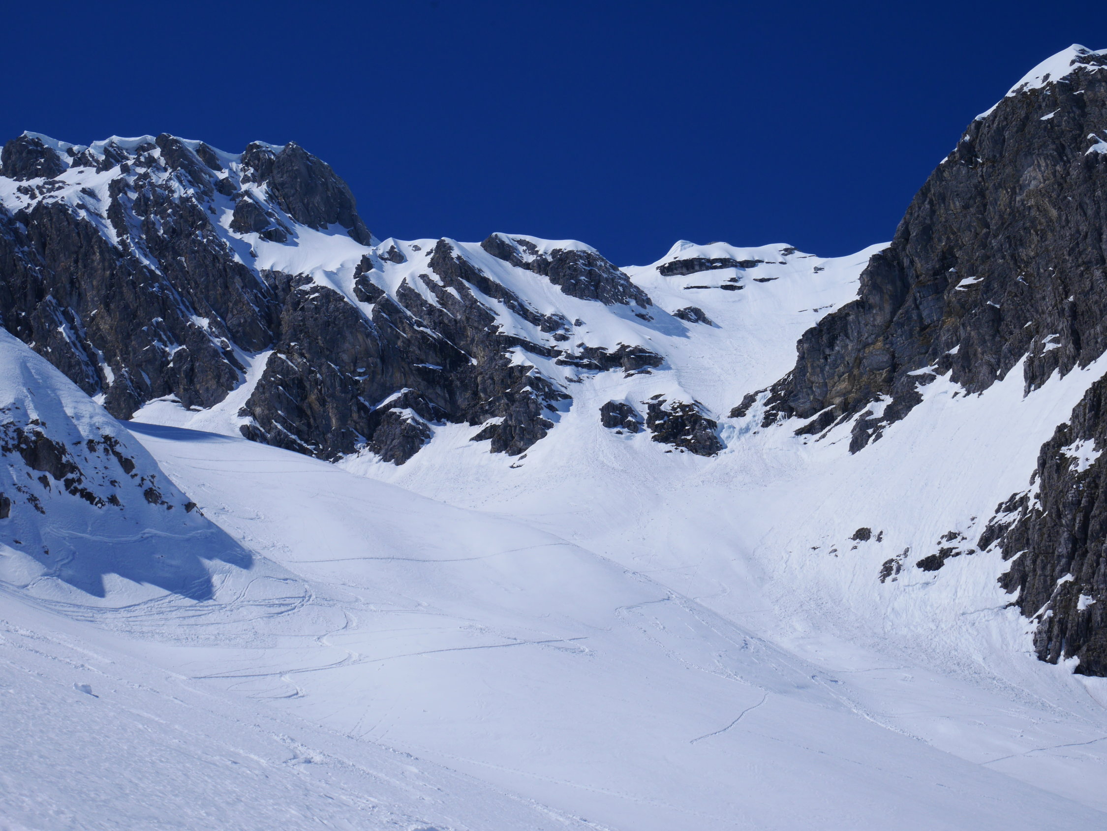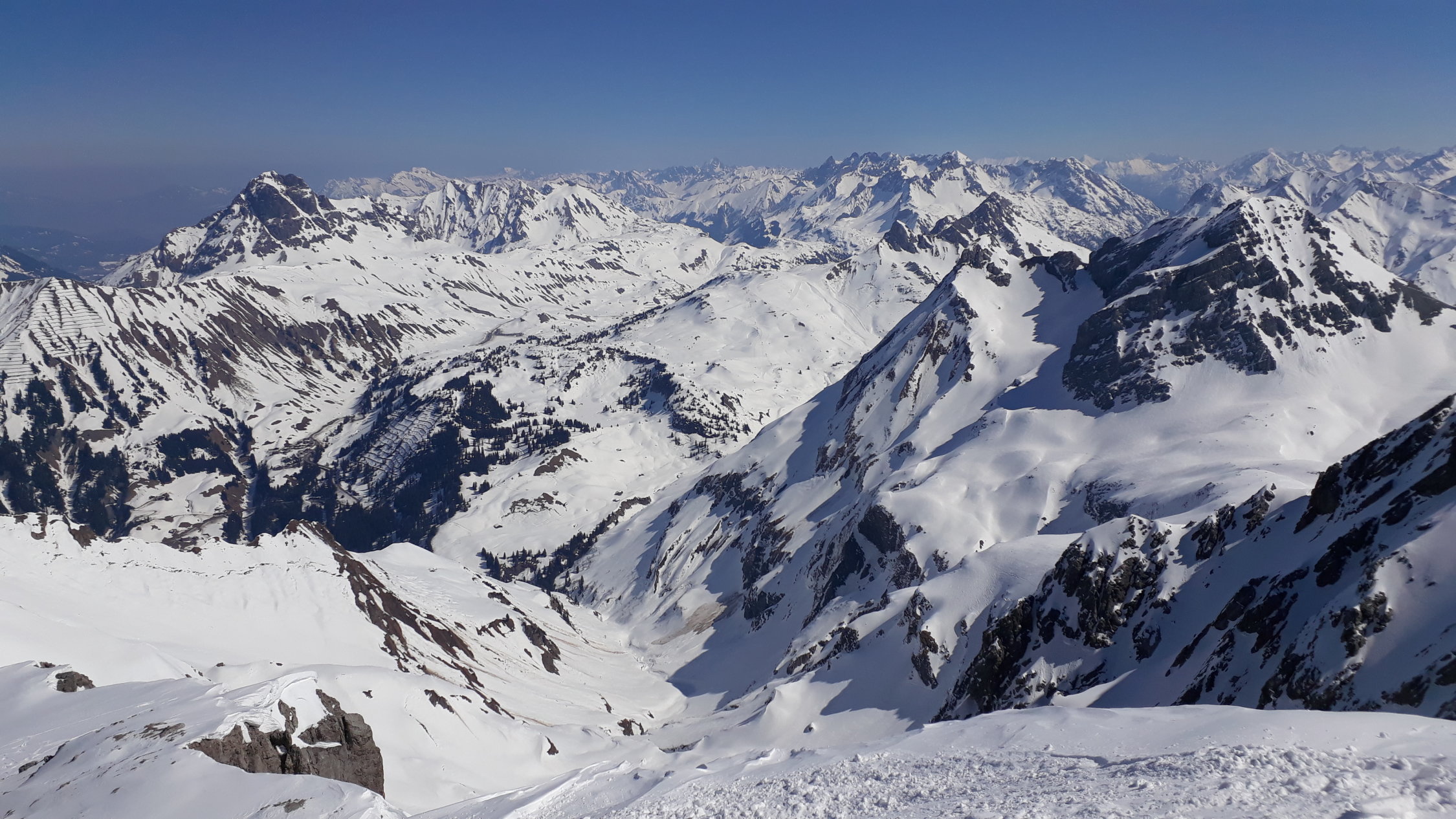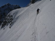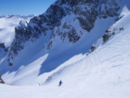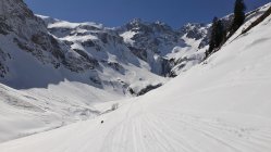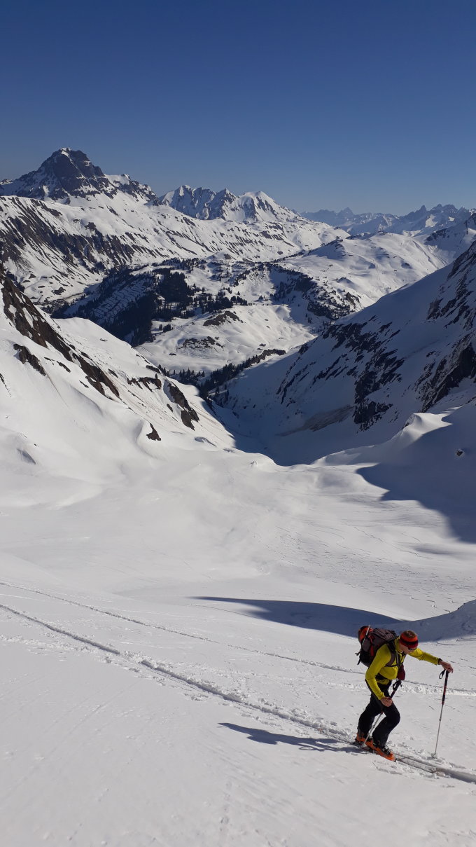 Wir sind um 7Uhr nach der neuen Zeit (Sommerzeit) in Schröcken losgegangen. Zunächst in hartem Schnee mit Harscheisen das kleine Bachtal hinein. An der Steilstufe nach rechts hoch, kurz die Ski getragen. Am oberen Ende wurde der Schnee bereits weicher, was im Aufstieg sehr angenehm war. Dann oben das große Kar anfangs flach, dann steiler werdend hoch. Hier zunehmend Pulverschnee! An der Steilstufe neben dem kleinen Wasserfall an der rechten Begrenzung des Kars war der Schnee durch die südöstliche Ausrichtung bereits ziemlich weich, was den Aufstieg erleichterte. Kurz die Ski getragen, denn nach der Rechtsquerung in den großen Steilhang wieder in Aufstiegsstellung in einer guten Spur nach oben. Der Schnee war hier entsprechend der Hangausrichtung tragend weich. Nach dem Steilhang in einer Art Gipfelrampe noch 200 HM bis zum Gipfel. Herrliches Panorama in jede Richtung. Sehr gute Abfahrtsbedingungen, auf der Gipfelrampe Pulverschnee, im Steilhang gut fahrbarer Weichschnee, im großen Kar Pulverschnee, ganz unten dann Sulzschnee. Abfahrt vom Gipfel bis zum Talort.