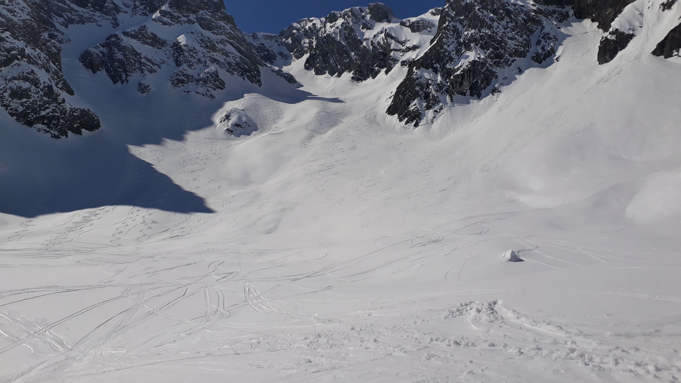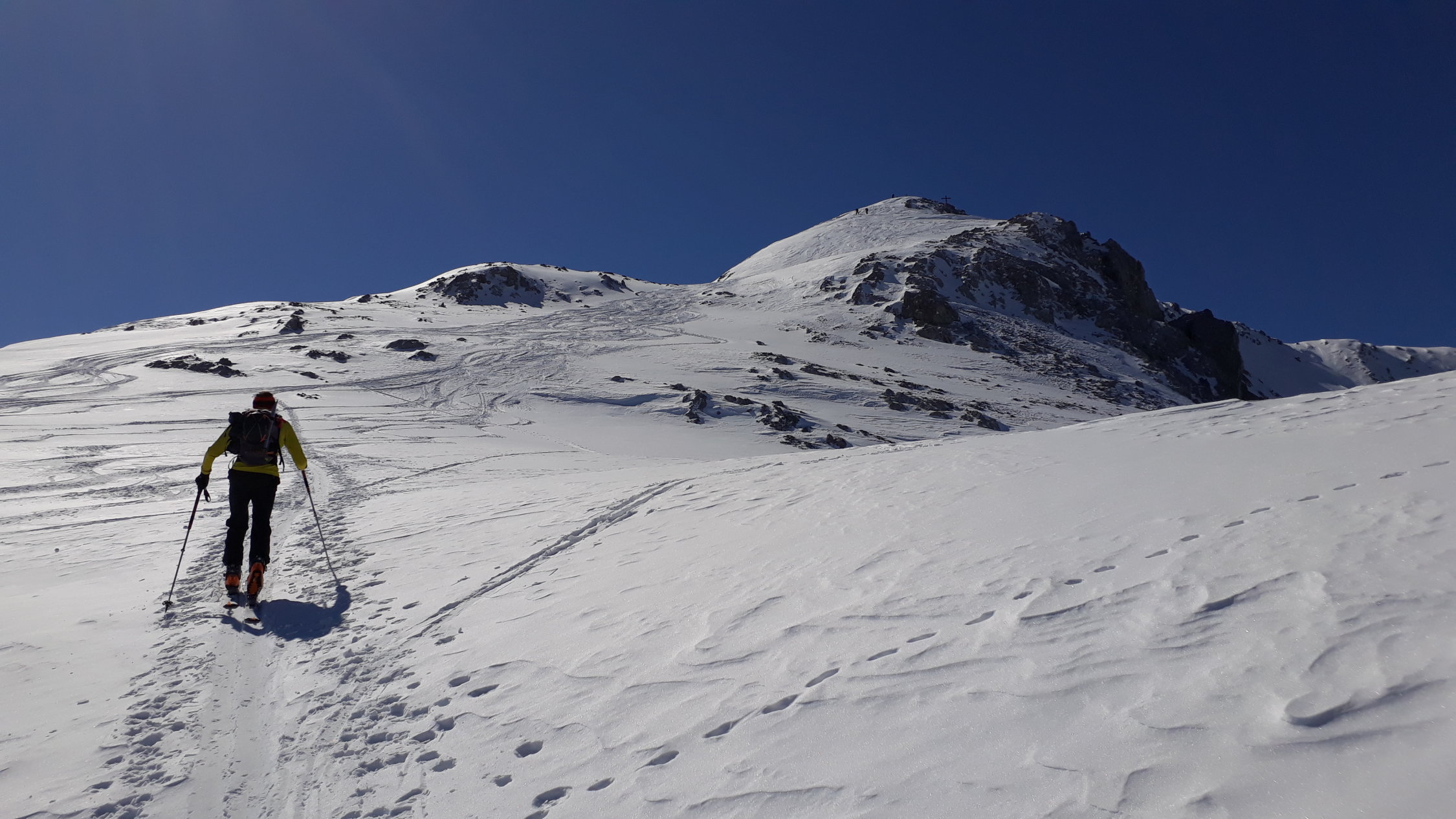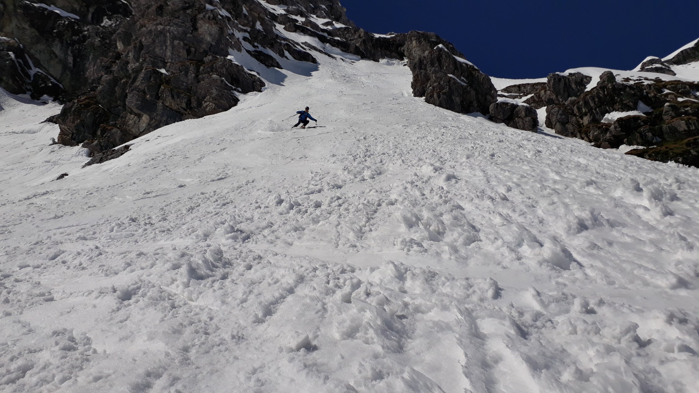 Wir sind um 7Uhr nach der neuen Zeit (Sommerzeit) in Schröcken losgegangen. Zunächst in hartem Schnee mit Harscheisen das kleine Bachtal hinein. An der Steilstufe nach rechts hoch, kurz die Ski getragen. Am oberen Ende wurde der Schnee bereits weicher, was im Aufstieg sehr angenehm war. Dann oben das große Kar anfangs flach, dann steiler werdend hoch. Hier zunehmend Pulverschnee! An der Steilstufe neben dem kleinen Wasserfall an der rechten Begrenzung des Kars war der Schnee durch die südöstliche Ausrichtung bereits ziemlich weich, was den Aufstieg erleichterte. Kurz die Ski getragen, denn nach der Rechtsquerung in den großen Steilhang wieder in Aufstiegsstellung in einer guten Spur nach oben. Der Schnee war hier entsprechend der Hangausrichtung tragend weich. Nach dem Steilhang in einer Art Gipfelrampe noch 200 HM bis zum Gipfel. Herrliches Panorama in jede Richtung. Sehr gute Abfahrtsbedingungen, auf der Gipfelrampe Pulverschnee, im Steilhang gut fahrbarer Weichschnee, im großen Kar Pulverschnee, ganz unten dann Sulzschnee. Abfahrt vom Gipfel bis zum Talort.