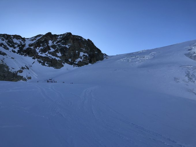 Gletscher noch gut eingeschneit, praktisch alle sind ohne Seil gelaufen.