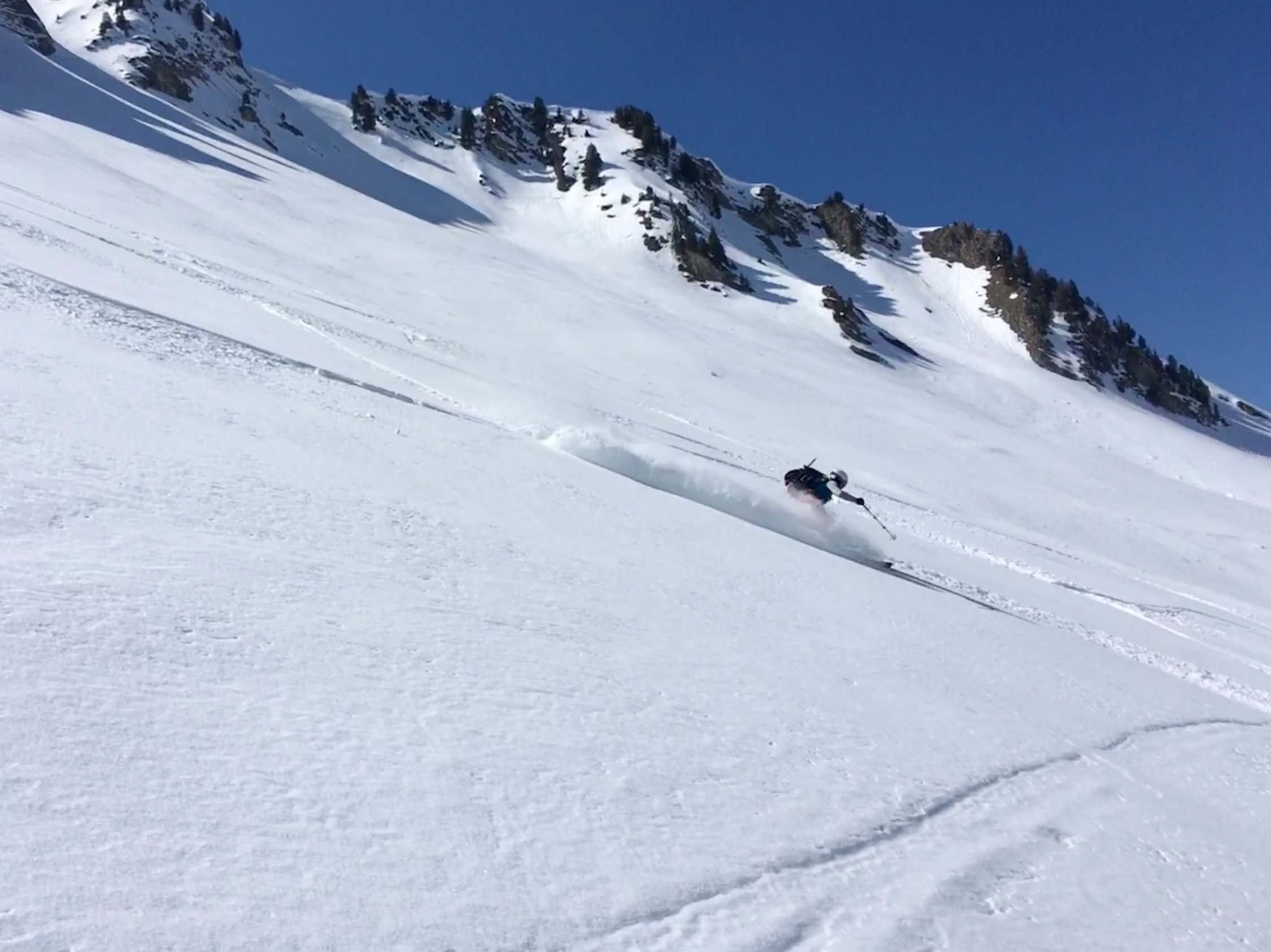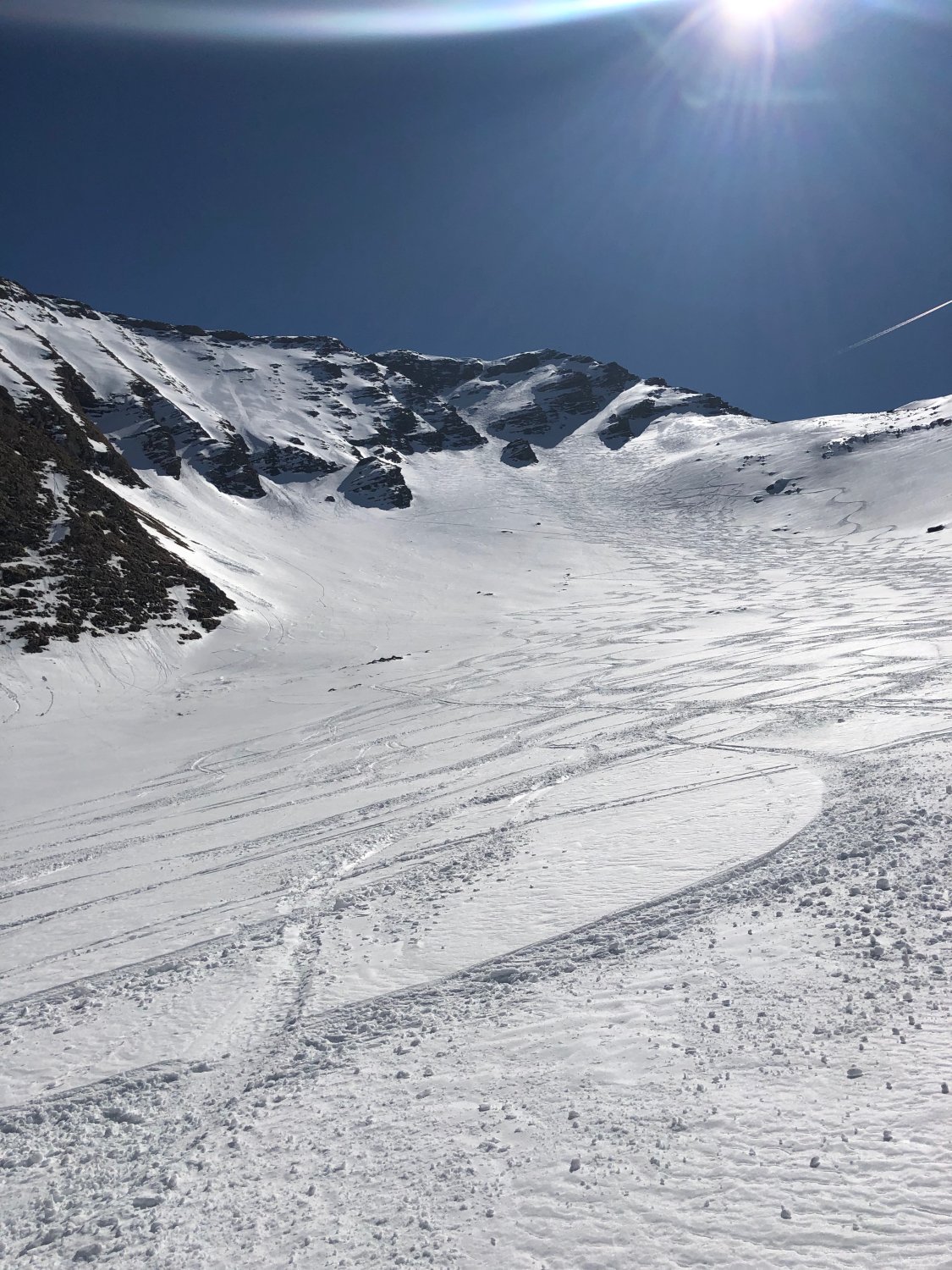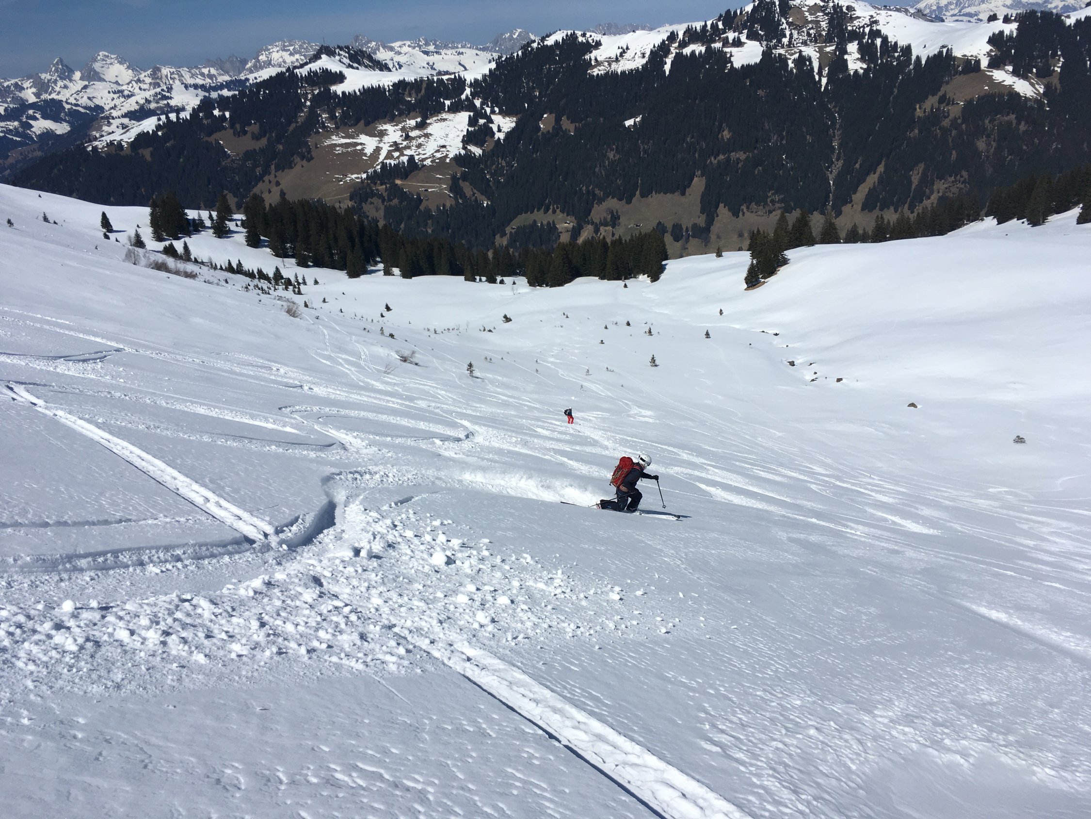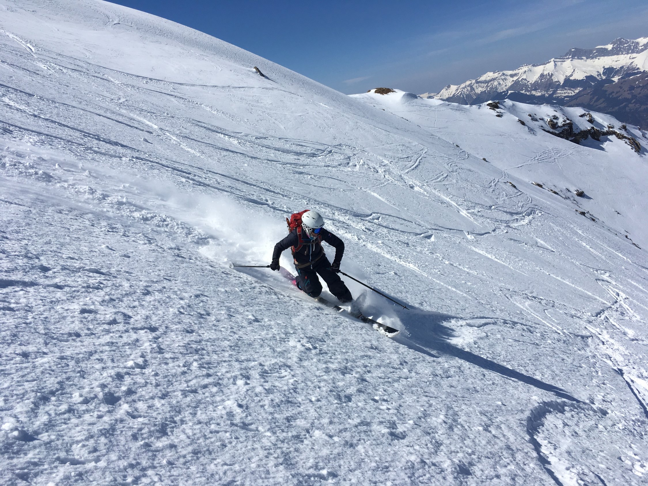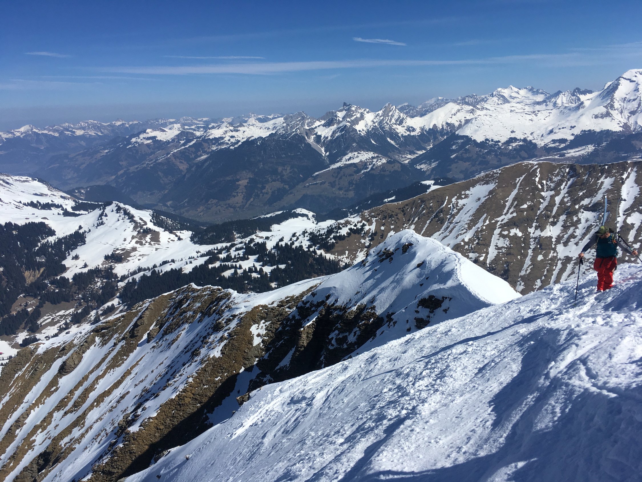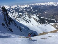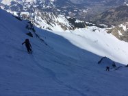 Couloir-Ausstieg und Gipfelgrat zu Fuss. Abstieg ein paar Meter über den NW-Grat. Ab dort ist die Einfahrt in den Nordhang problemlos.