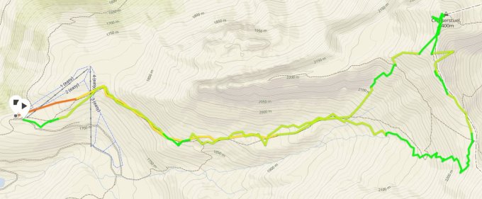Bei der Querung vom Schonegg zum Gipfel müssen die Ski kurz abgeschnallt werden. Skidepot ca. 40m unterhalb Gipfel.