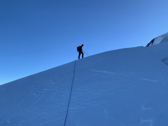Aufstieg zum Morgenhorn bis ca 3250 m problemlos. Auf ca 3300 muss man ein Lawinenfeld (Eisabbruch) queren. Aufstieg bis ca 3400 m mit Ski möglich. Skidepot auf 3450 m und direkter Aufstieg zum Morgenhorn mit Steigeisen, zwei Eispickeln und einem (min) 30 m Seil. Die letzten 200 Hm sind s hart /o gar blank. Waren an dem Tag und allenfalls(?) seit vielen Wochen die ersten und einzigen auf dem Morgenhorn. Im Aufstieg zum Gipfel ist meinem Kollegen ein Steigeisen gebrochen, was mich jedoch nicht davon abgehalten hat die Tour zu einem 'Guten Ende' zu bringen... :-)