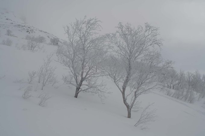 Wunderbare Pulverschneeverhältnisse. In Hamnnes ca. 30cm Neuschnee, oberhalb der Waldgrenze windbedingt weniger, aber immer noch pulvrig. Zurzeit liegt im Gebiet Lyngenfjord/Lyngenalpene viel Neuschnee.