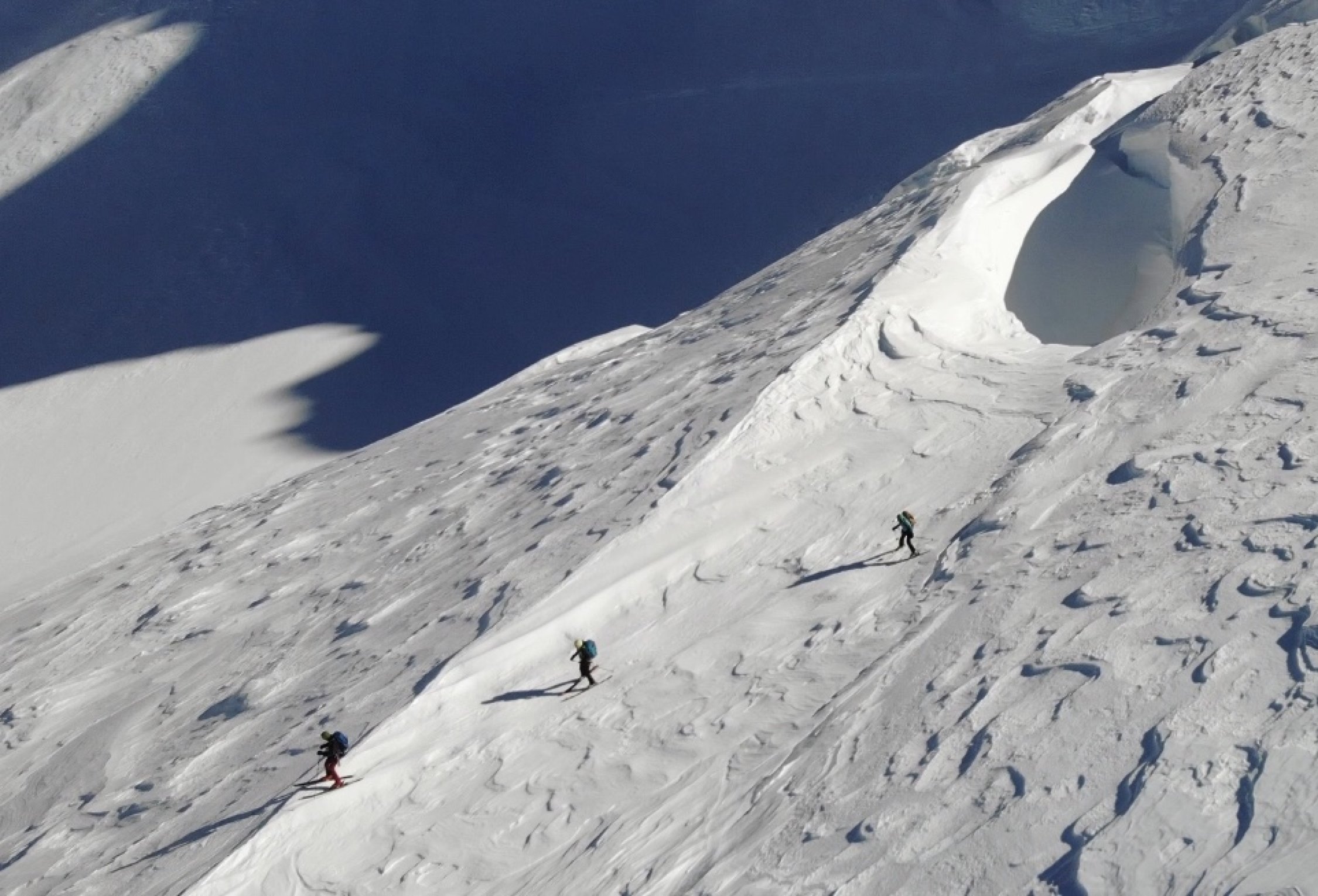 Die Überschreitung ist machbar, auf der westlichen Seite bereits blankes Eis, das man über Steinaufschwung umgehen kann. Auf der östlichen Seite ist ein Bergschrund vorhanden, der (noch) überwunden werden kann.
