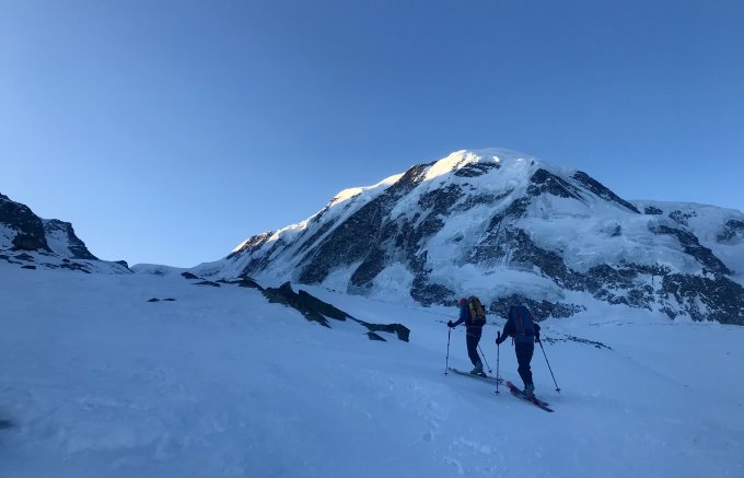 Auf der ganzen Tour ist eine gute Spur vorhanden. Teilweise durch den hartgepressten Schnee nur durch den Einsatz von Harscheisen zu sehen :-). Beim ersten Serac bei ca 3500Hm ist bereits vorsicht geboten, es hat bereits einige Spalten, die nur ganz leicht offen sind, kaum sehbar. Bei ca 3950Hm kommen zwei grosse Spalten, die mit einem S umgehen werden können. Ca 80Hm vor dem Gipfel ist der Schnee so hart, das man mit Steigeisen aufsteigt, es hat eine sehr gute Spur!