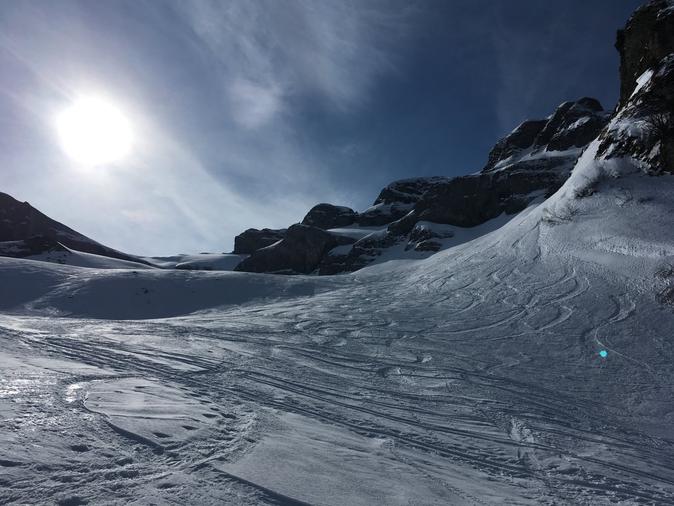 Ca. 12 Uhr vom Gipfel abgefahren. In der Abfahrt überraschend lange schönen Pulverschnee vorgefunden, dann nahtloser Übergang zu tragender, leicht aufgesulzter Unterlage, das bis zum PP.