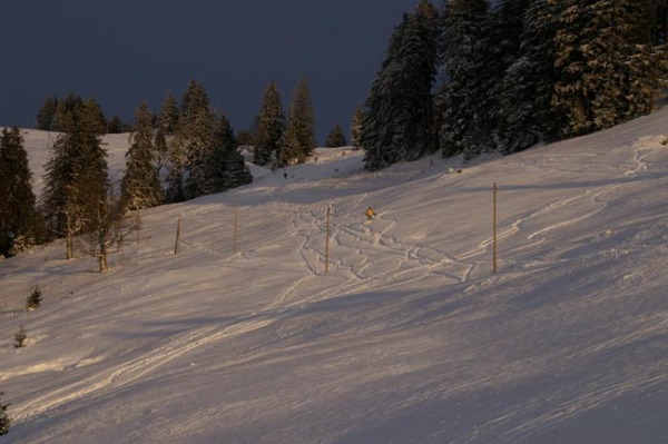Ca. 30 cm Pulverschnee, in den Löchern teilweise über 1 m. Da keine Unterlage vorhanden ist kommt nach den Schwüngen teilweise die Grasnarbe zum Vorschein