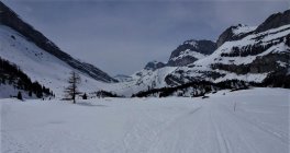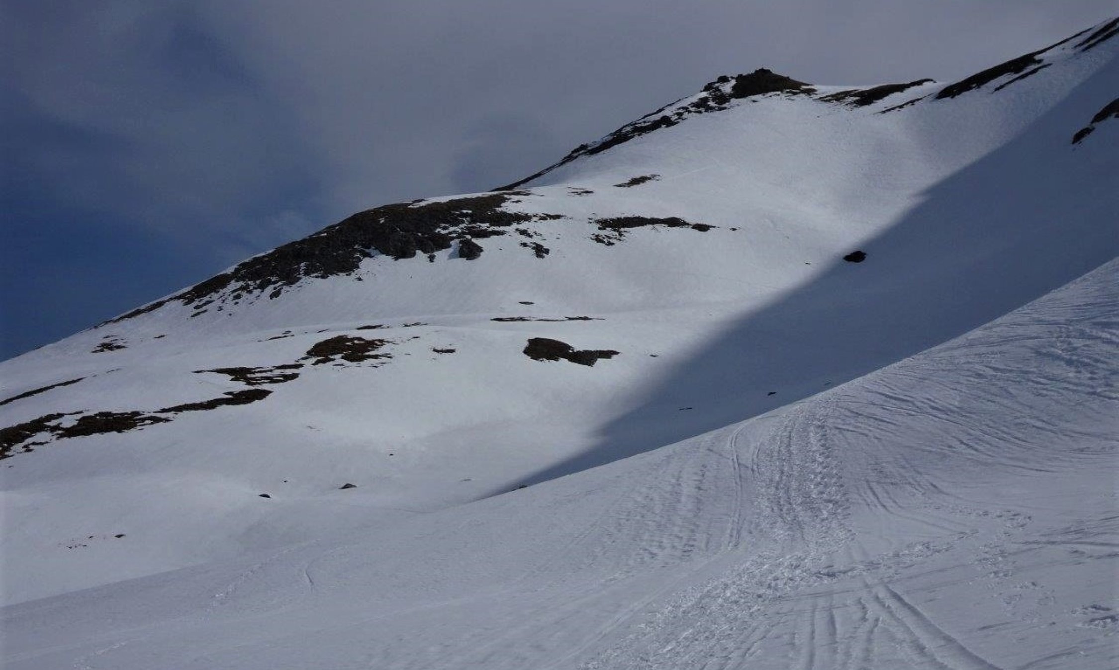 die ganze Route gut gesetzt und hart gefroren. Der recht zügige und kalte Wind, vor allem auf dem Gipfel, und die milchigen Schleierwolken verhinderten ein aufsulzen der Schneedecke. Nur an wenigen Zonen leicht firnig. Insgesamt aber gut griffig zum Abfahren um 12 Uhr bis auf die Spittelmatte.