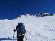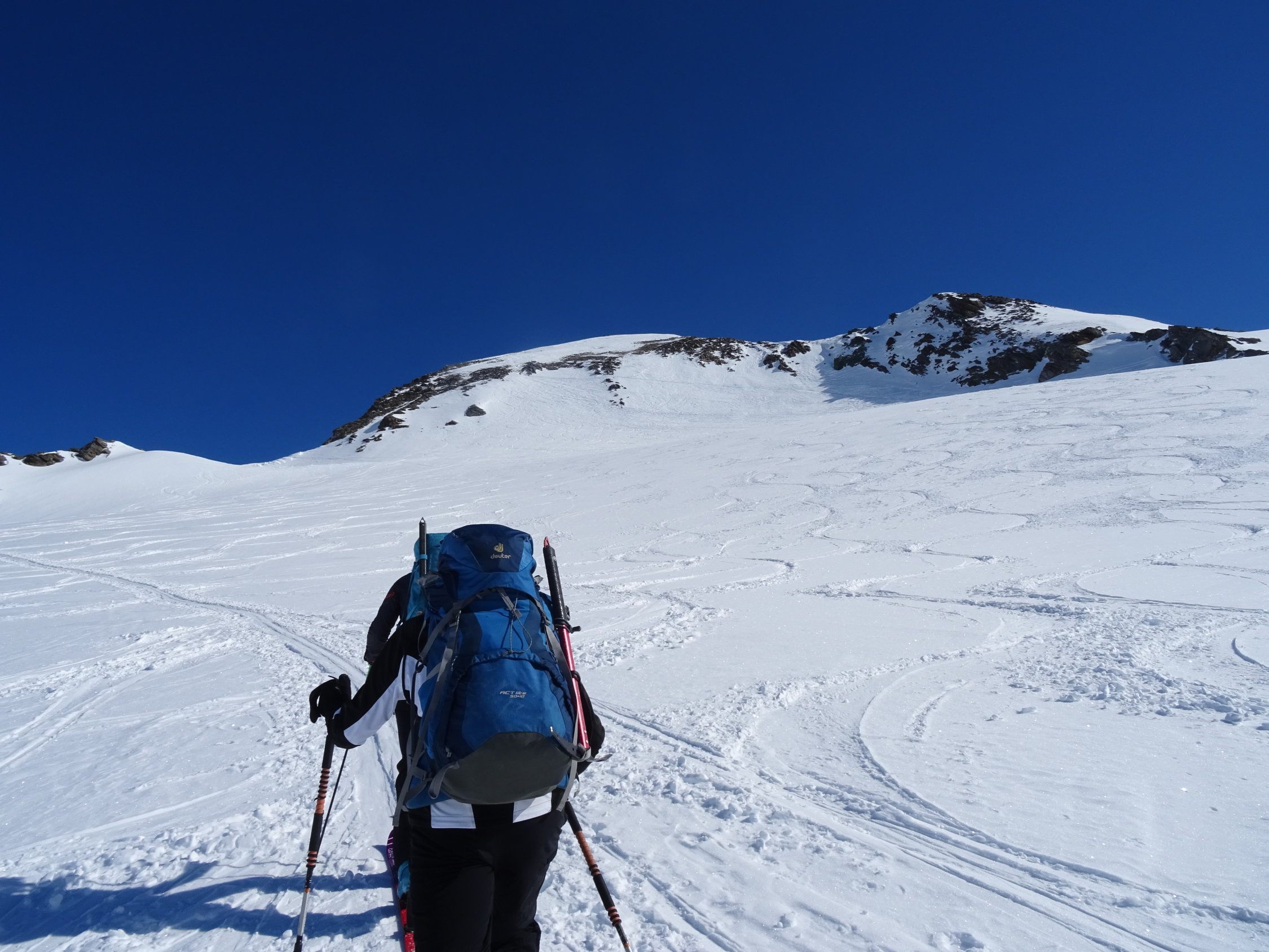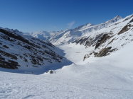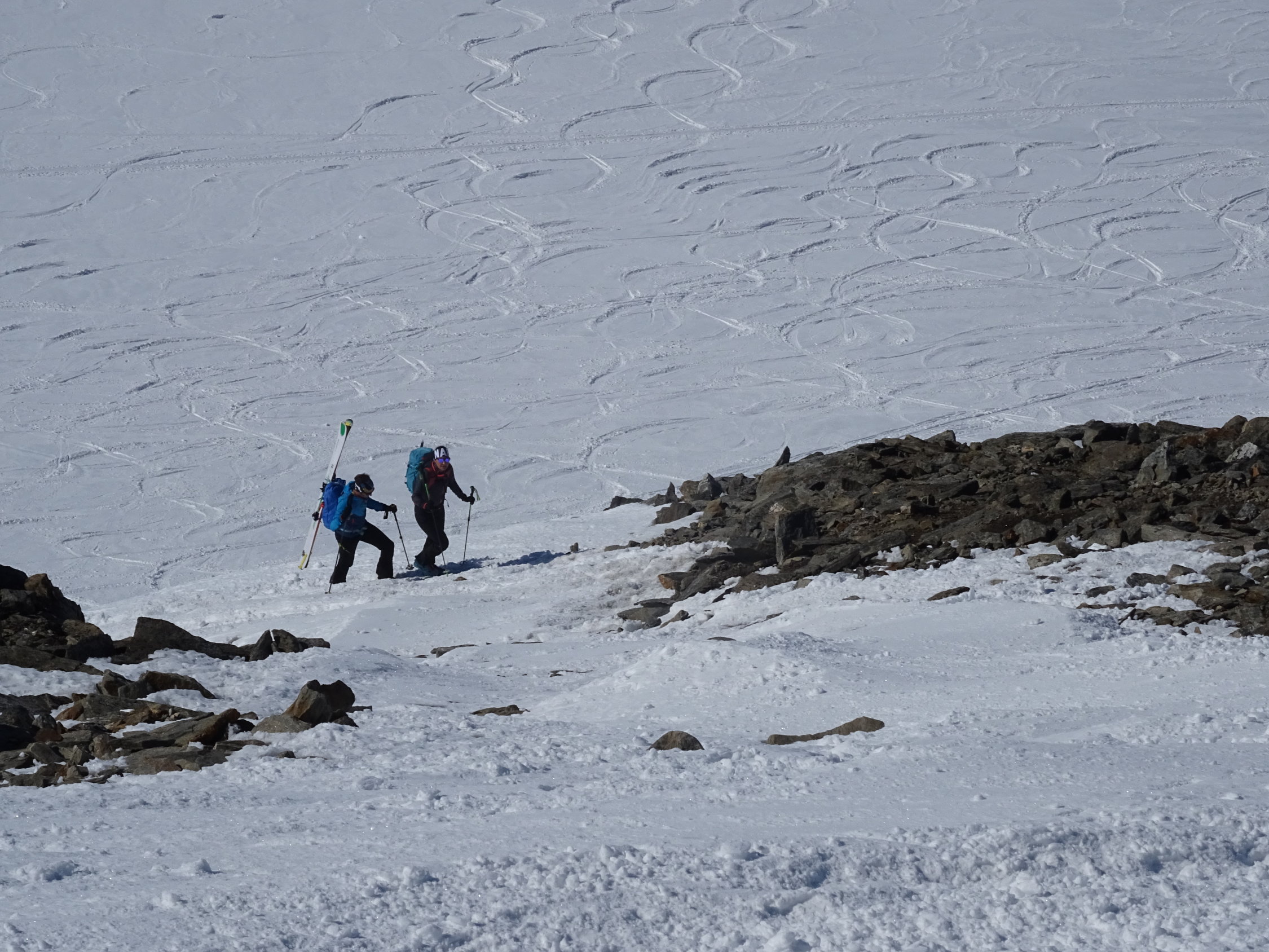 Abfahrt oben noch nicht firnig und zerfahren, allerdings besser als gedacht; weiter unten immer besser; dann lang zu Hütte am linken Talhang zurückqueren;