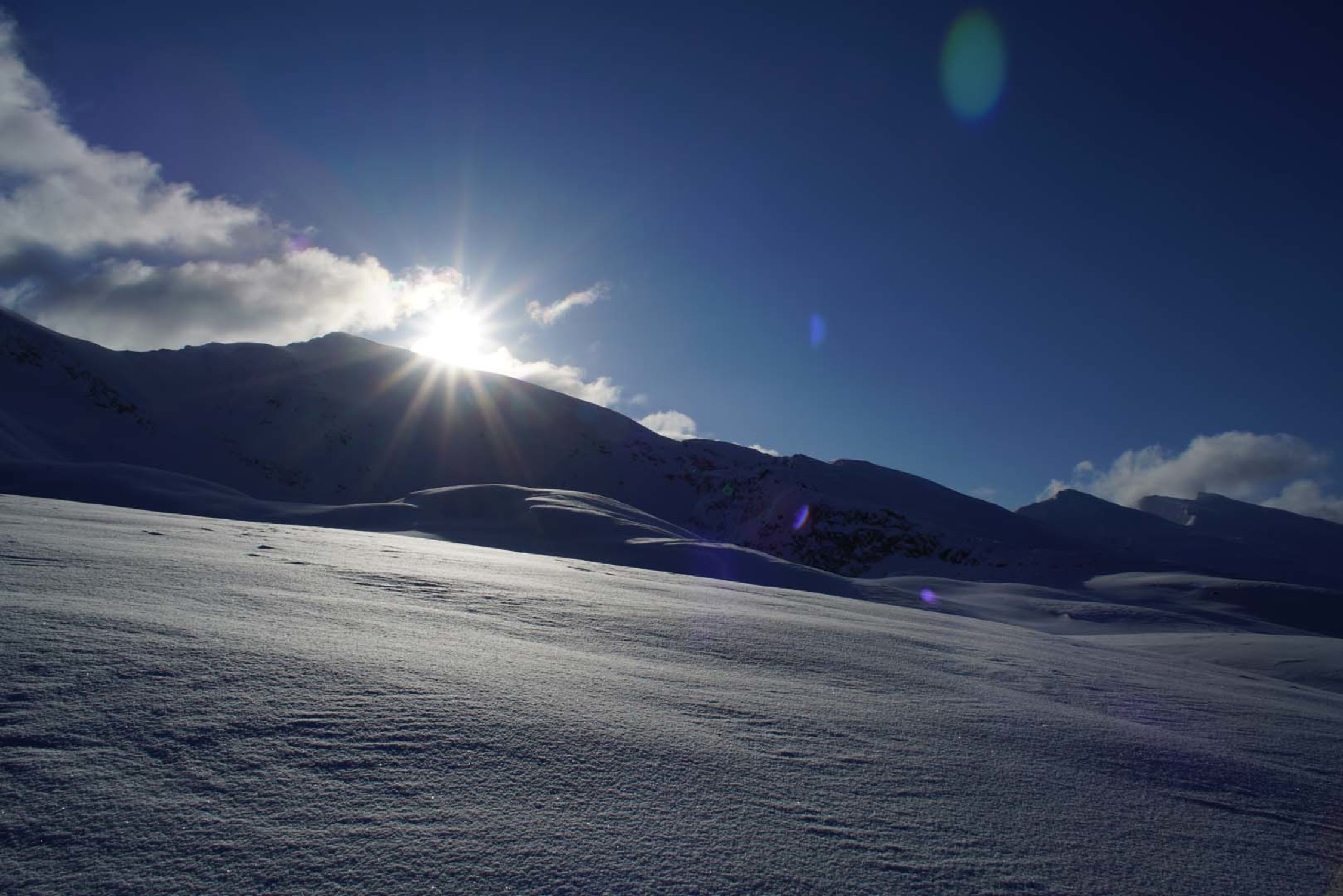 Ganze Route sehr gut eingeschneit und durchgehend mit Skis, Snowboard, Schneeschuhn begeh-/befahrbar. Schneehöhe >70cm. Unterste 250Hm leichter Bruchharsch, darüber wunderbarer Pulverschnee!