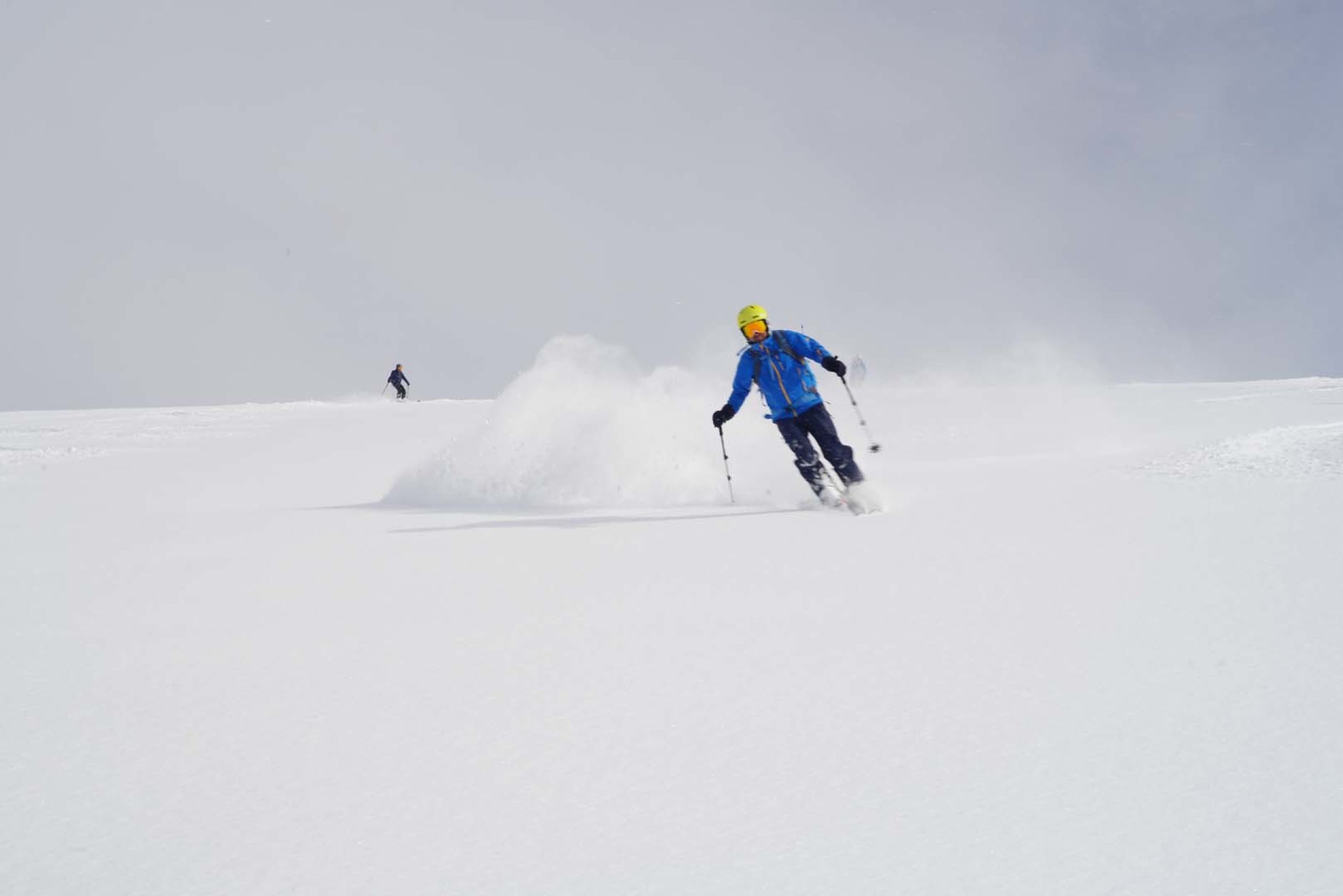Alle riesigen Hänge heute morgen unverspurt/unverfahren. Traumhafte Erstabfahrt. Weil's so schön war von oberhalb Waldgrenze nochmals aufgestiegen = total 1700Hm.
