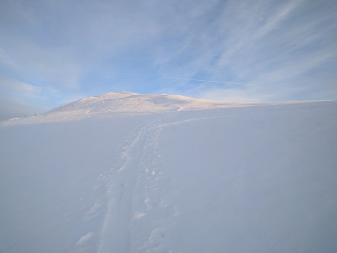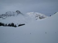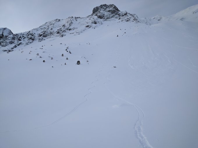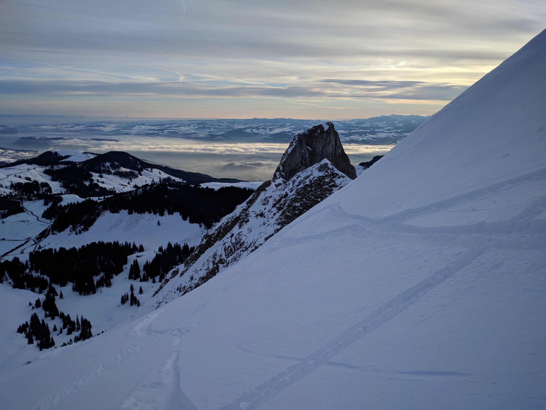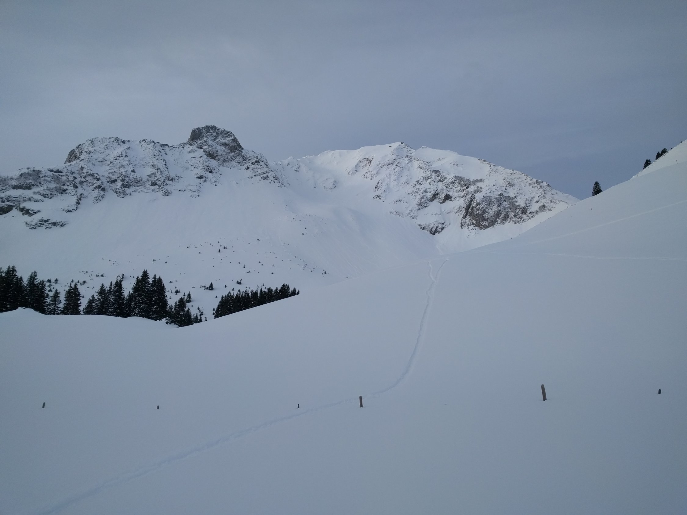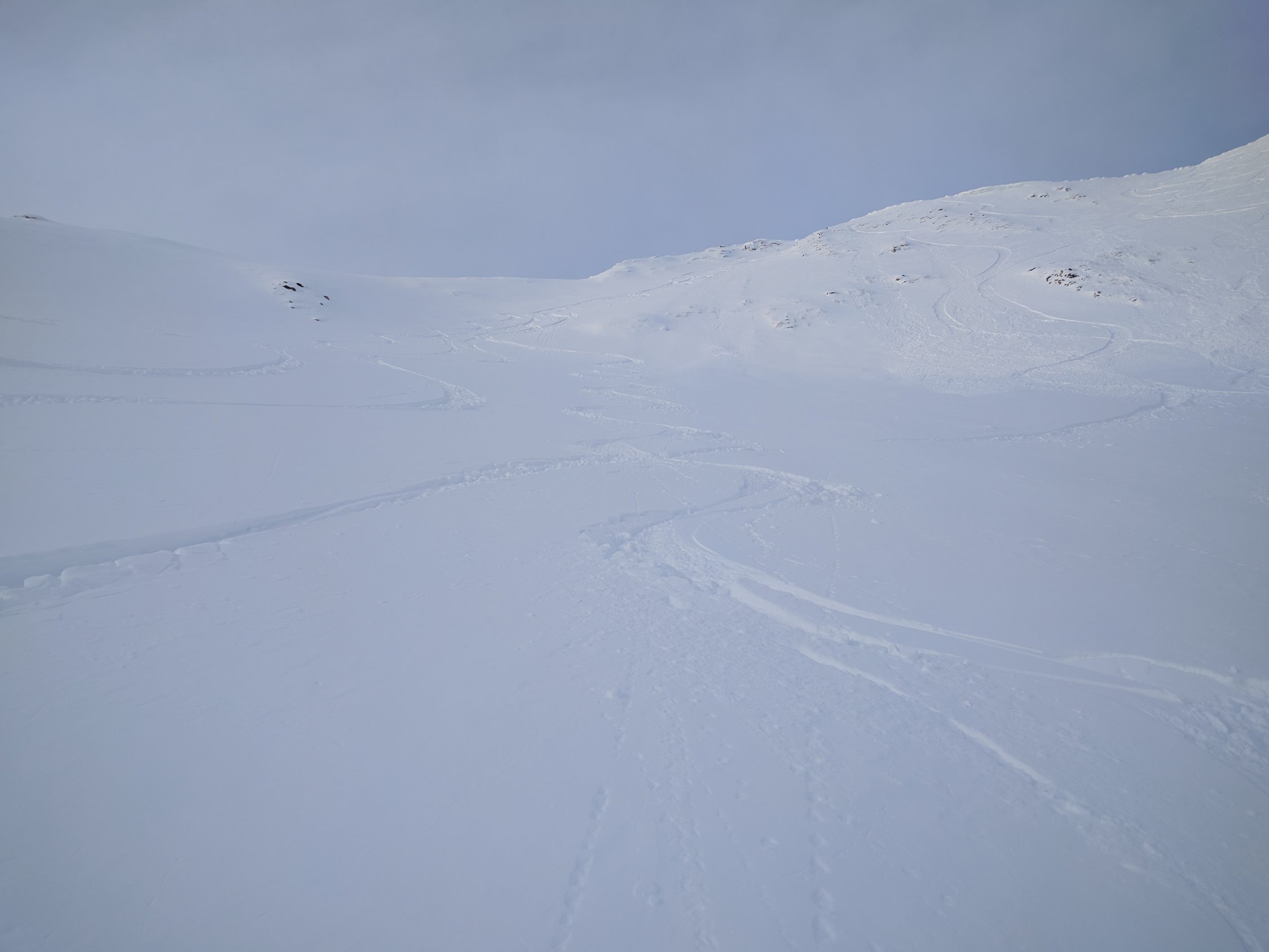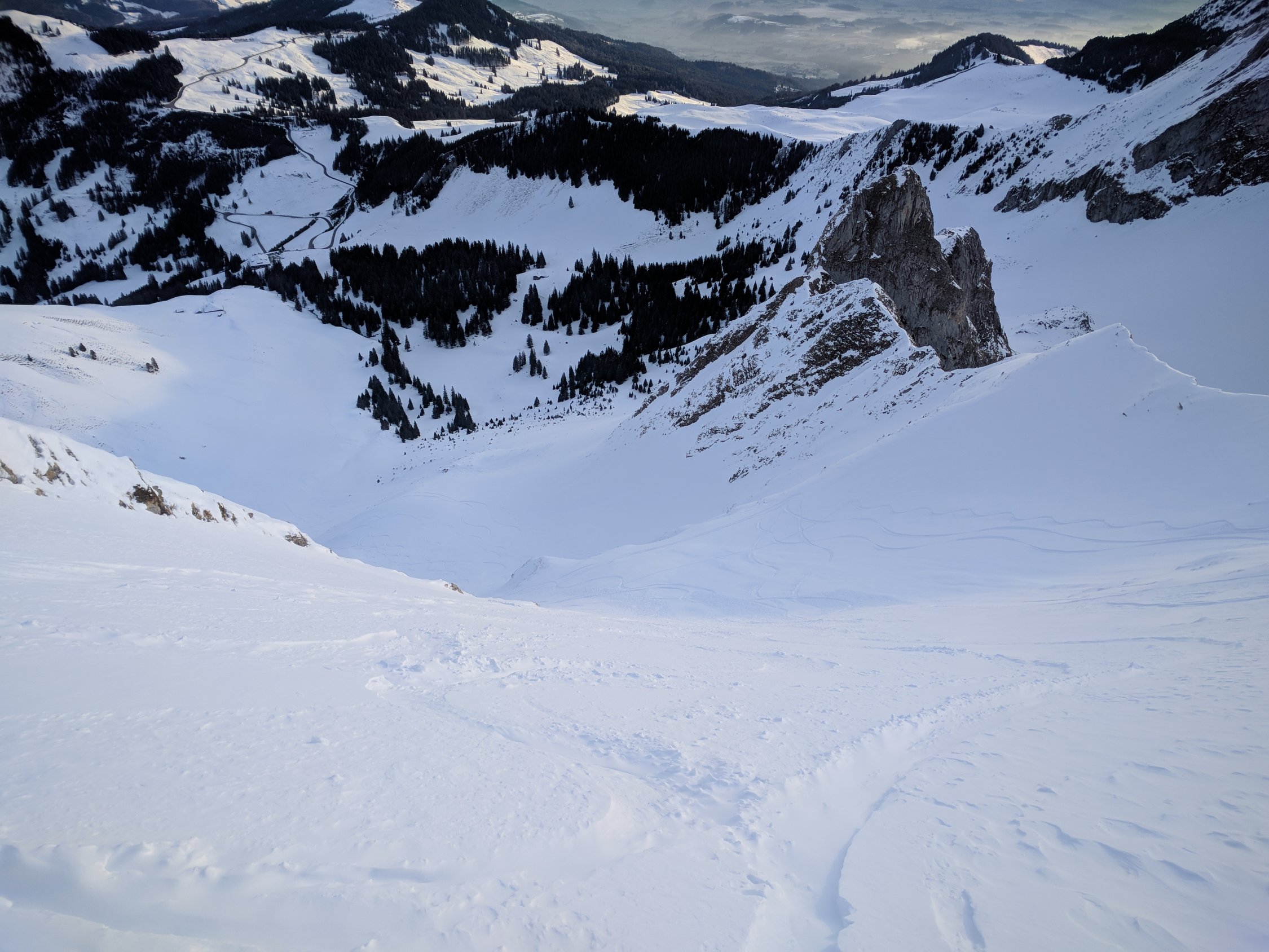 40 Zentimeter Pulver in der Nordflanke bei mässiger Lawinengefahr. Unten ziemlich mühsamer Deckel, da wo halt zuviel Sonne hinkommt.