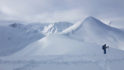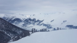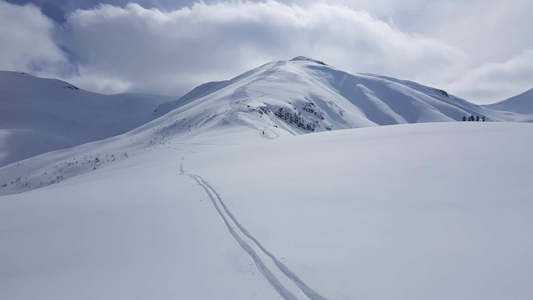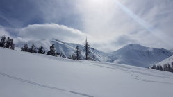 Mit etwas würgen konnten ein paar Bogen gefahren werden. Ab einer Höhe von ca. 2630 sind wir dann direkt nach Norden runter gefahren, da war der Schnee etwas besser. Wir mussten dann weiter unten wieder nach links queren, um nicht in die Wildruehzone zu gelangen. Ab Plaund d'Arpschellas war der Schnee dann schon so aufgeweicht, dass er recht gut fahrbar war. Je weiter man nach unten kam, umso schwieriger war es, noch unverfahrenen Schnee zu finden. Mit den vielen Leuten, welche noch aufgestiegen sind wird es auch nicht besser.