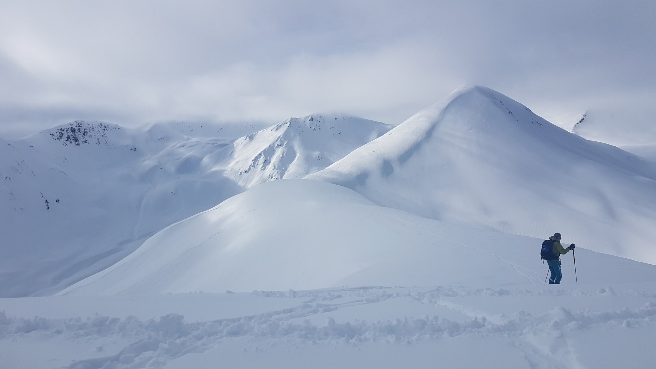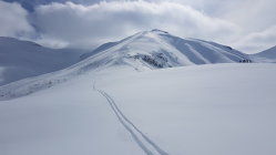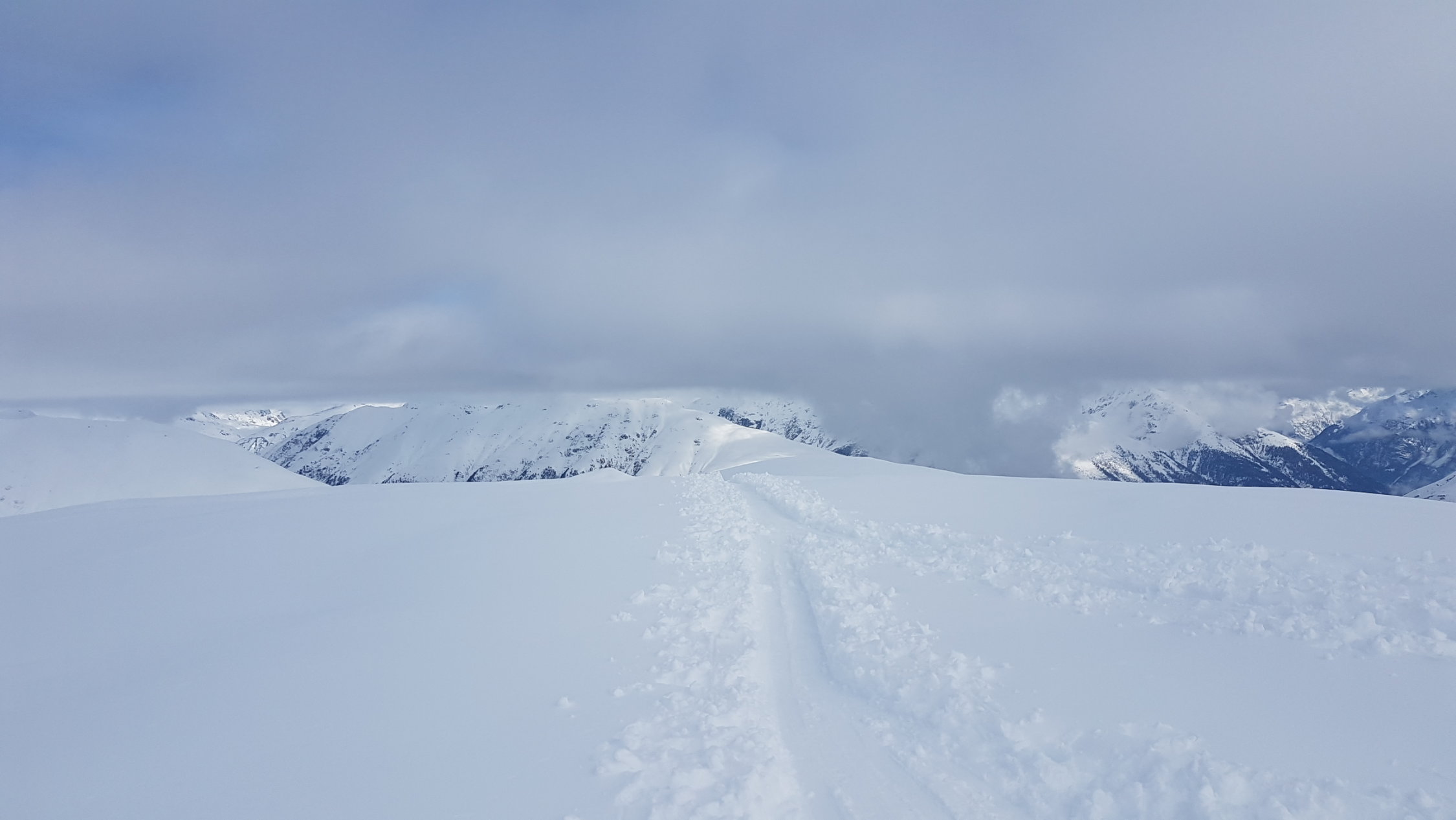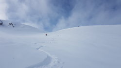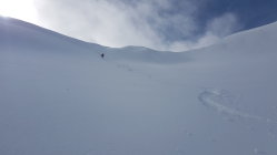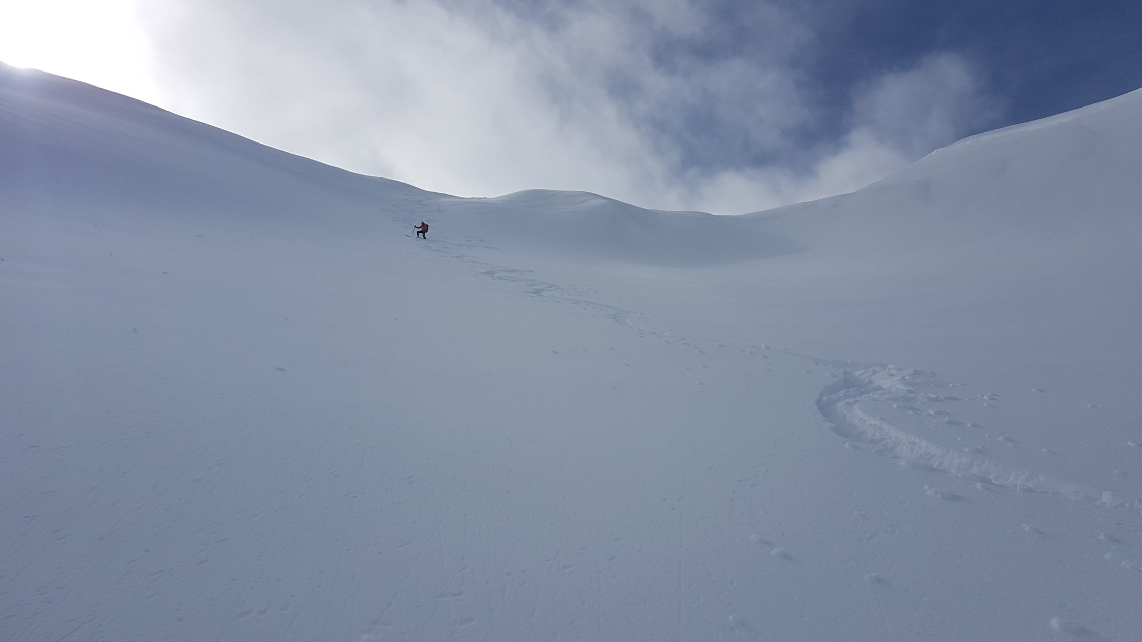 Start um 7 Uhr ab PP Resgia. Es waren schon einige Spuren vom Vortag vorhanden. Wir haben den Aufstieg unten durch die Schneise hoch gewählt, mein Kollege hat die Spurarbeit übernommen, weiter oben dann in der vorhandenen Spur. Schnee war von unten bis oben gedeckelt, das lies keine besonders schöne Abfahrt erwarten.