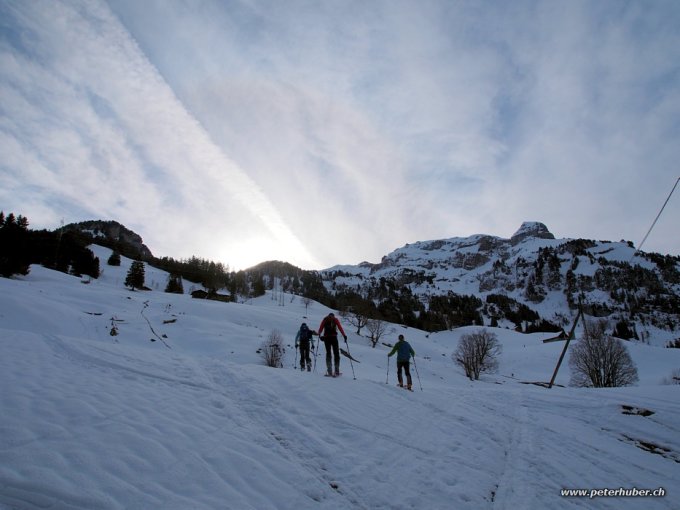 Zirka 20 cm fast hart gefrorener Schnee vom letzten Schneefall. Bis 1300 m wenig Unterlage darunter. Dann ausreichend Schnee. Recht sonnig, einige hohe Wolken. Von Süden drückten Wolken über die Tschingelhörner und Hausstock, zum Glück nicht weiter.