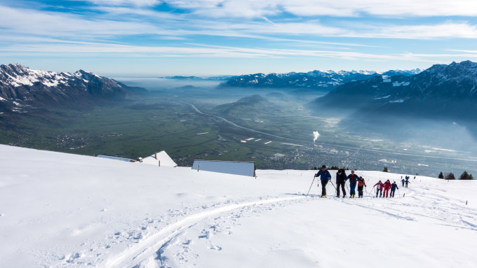 Start beim Berghaus Malbun um 8 Uhr, Parkplatz bereits gut besetzt. Heute viel los im ganzen Gebiet. Wetter: sonnig mit Schleierwolken und zeitweise starker Föhn. Wir sind vom Gipfel über Isisiz zur Alp Isisizsess abgefahren. Hier noch einige sehr schöne, unberührte Pulverhänge, teilw. windgepresst. Ab hier Wiederaufstieg zum Isisizgrat und Traverse zur Glannahütte, von dort über den kleinen Felskopf Glännli den steilen noch unverspurten Nordhang hinunter. Auch hier Mischung aus schönem Pulver und teilw. windgepresst. Unten im Wald schwerer Nassschnee.