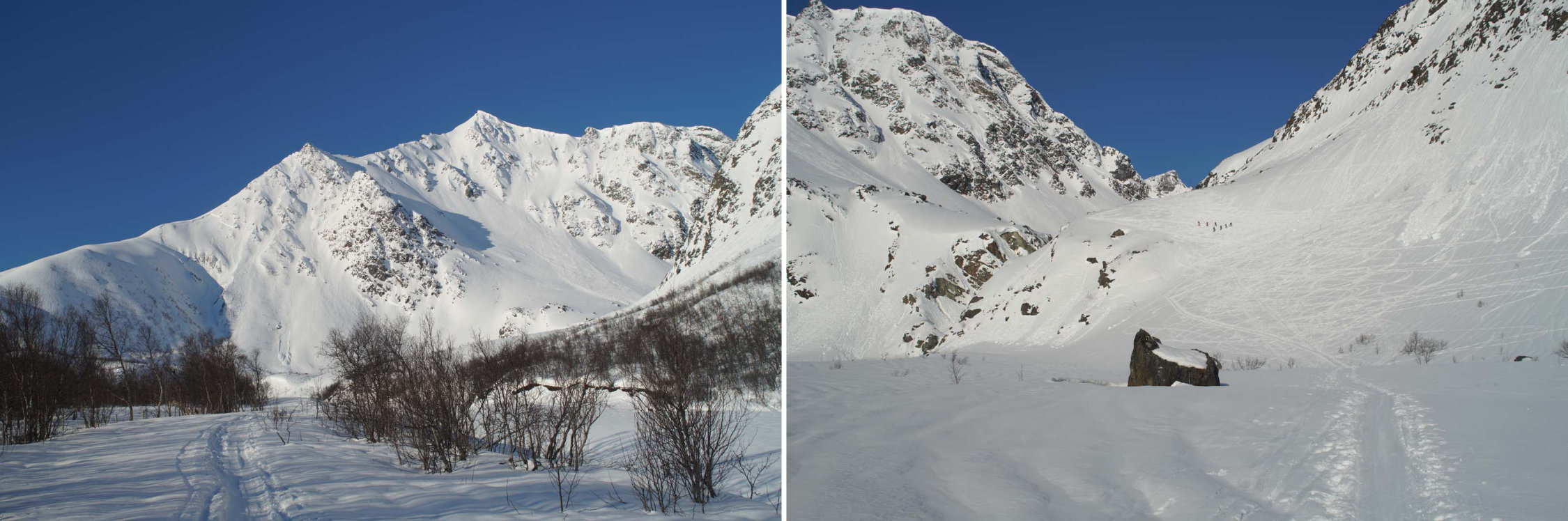 Lawinensituation: Gefahrenstufe 2 mässig. Einige z.T. grosse Schneebretter wohl am Vortag aus Steilgelände abgegangen, entsprechend dem Lawinenbulletin auf yr.no. 1 frischer Abgang tagsüber im unteren Koppangsdalen, ansonsten keine Alarmzeichen wahrgenommen.