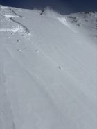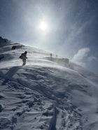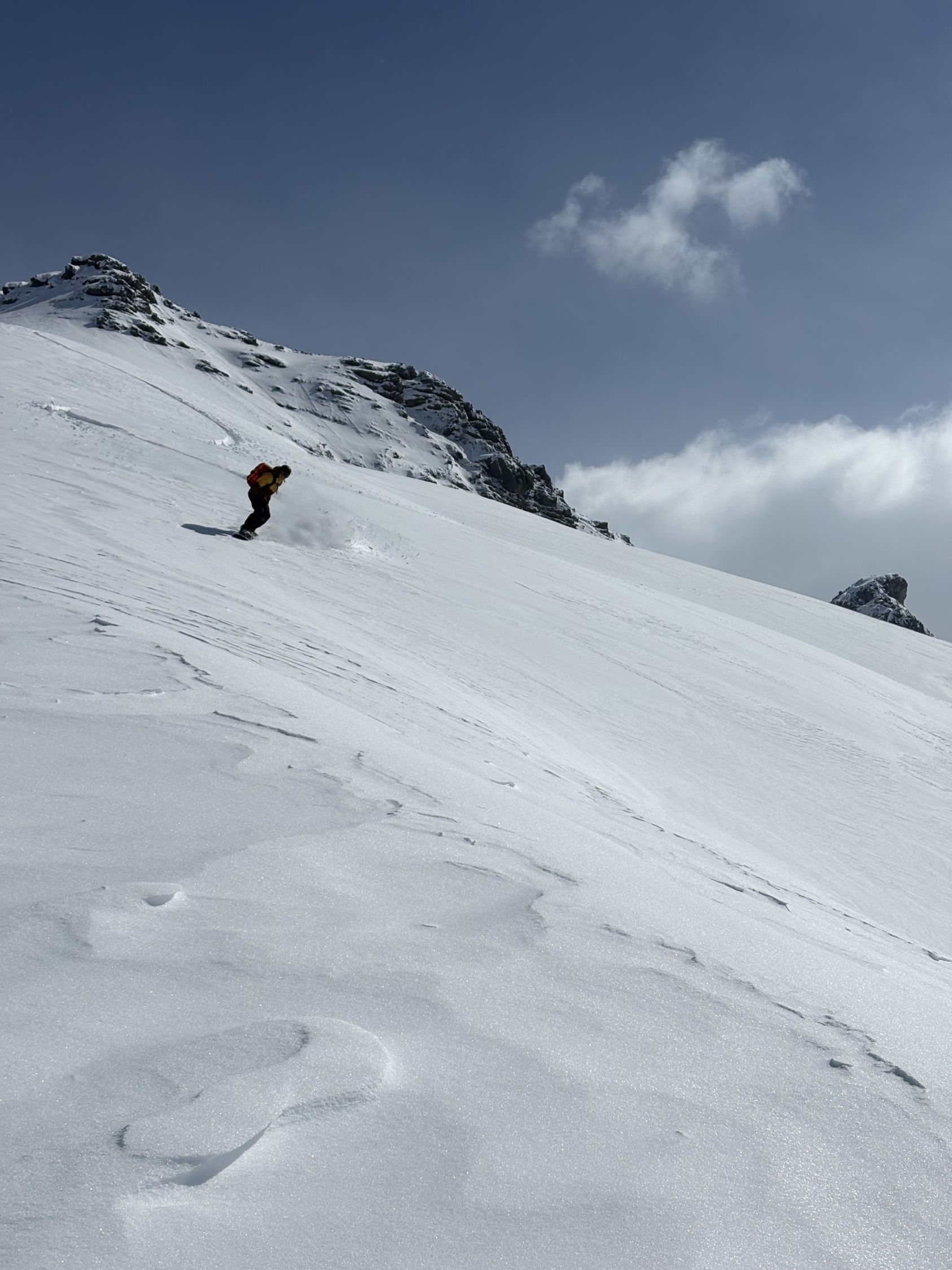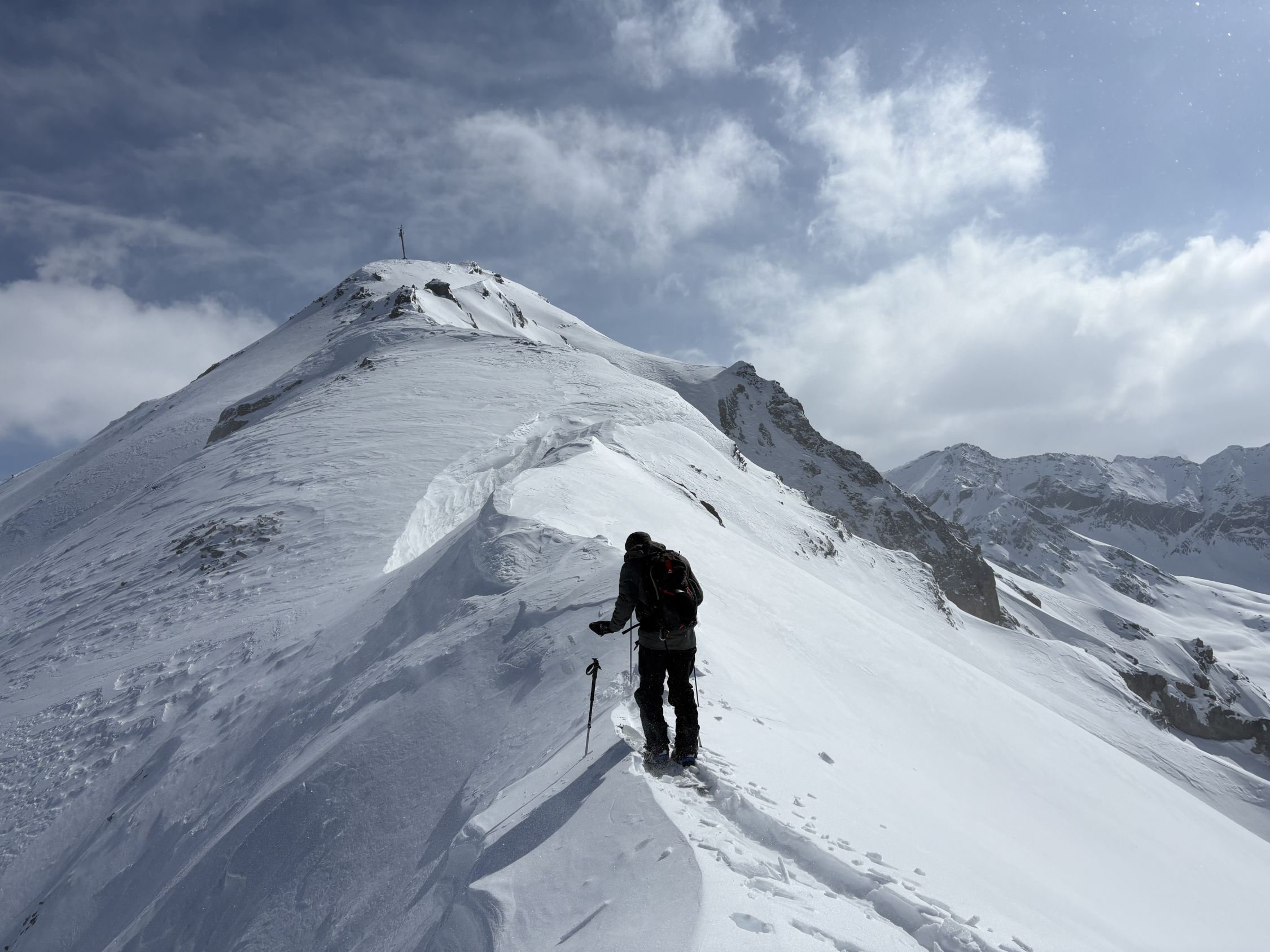 Nordseitig Pulver und im oberen Teil Wind. Somit auch Triebschneefelder. 1x Wummgeräusch und 2x Setzungsgeräusche. Alles was etwas steiler als 33 Grad ist, sahen wir eher als heikel an. Die grössere Gruppe kehrte auf 2578m. Südseitig einen leichten Deckel. Abfahrt nahmen wir via Chrachetobel auf dem ausgeprägten Rücken.