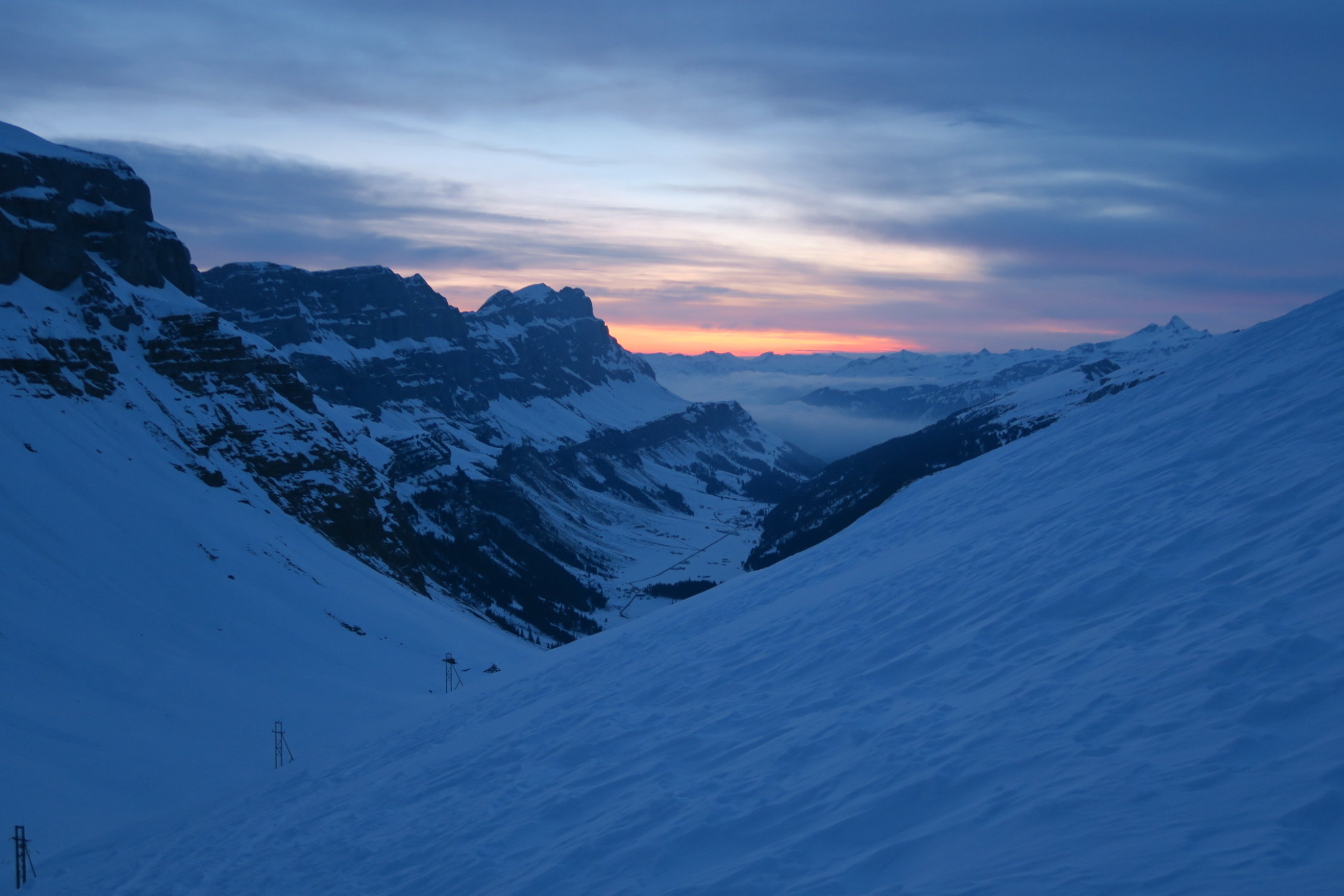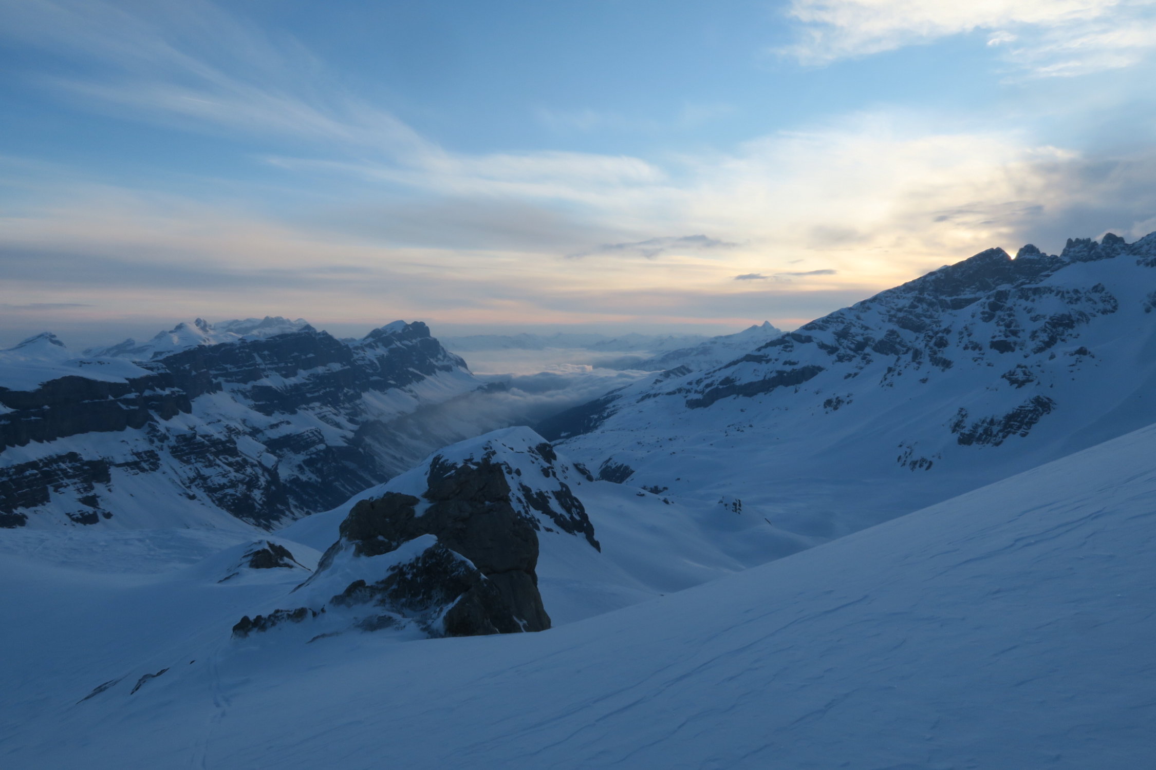Roten Nossen noch etwas Pulver, dann viel Bruchharst. Nach dem Chlustrittli noch etwas tragender Firn.