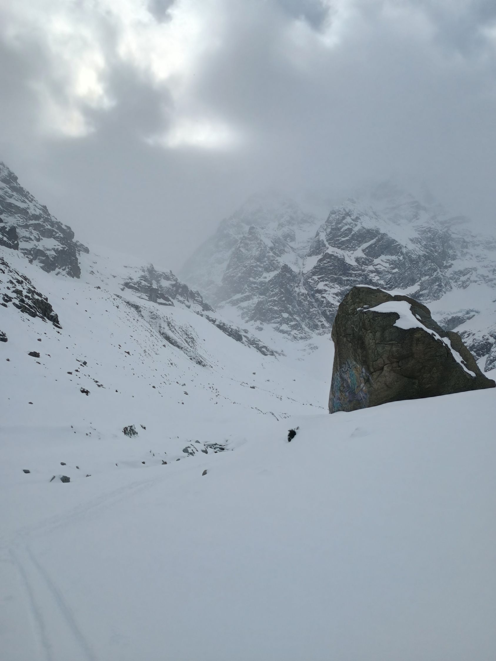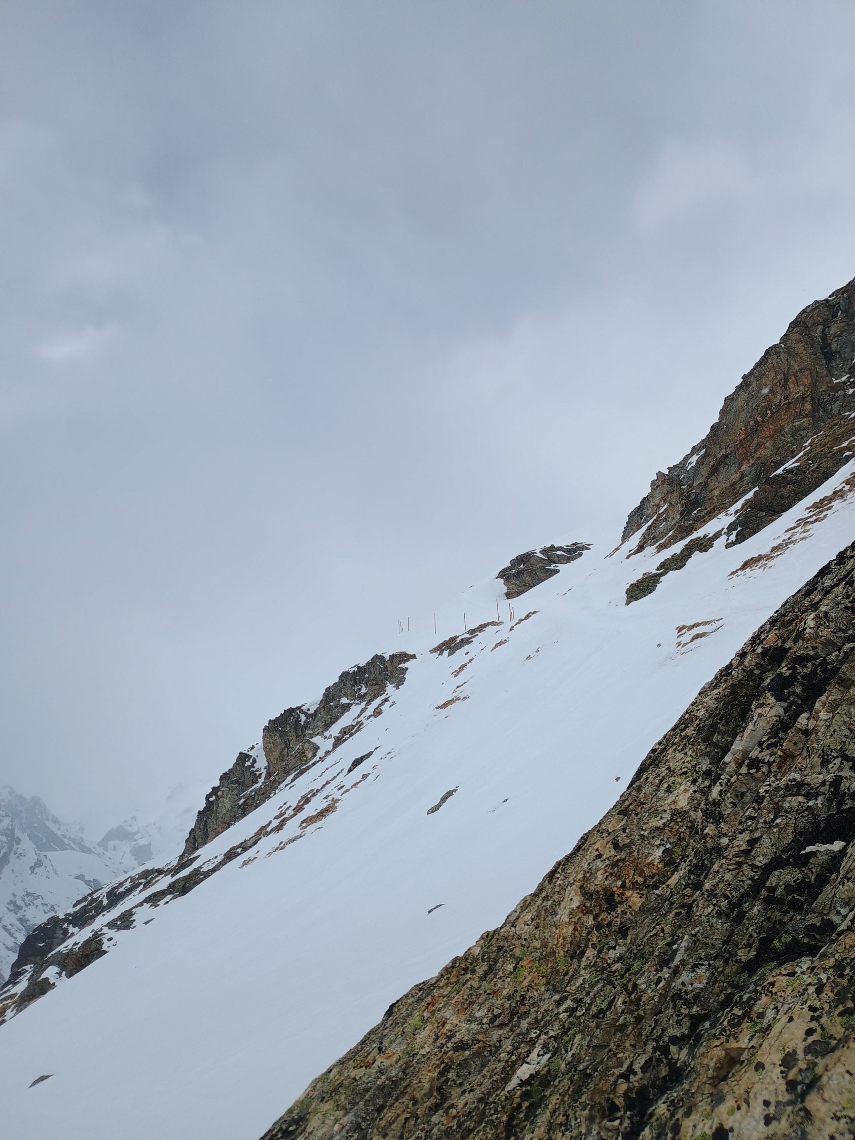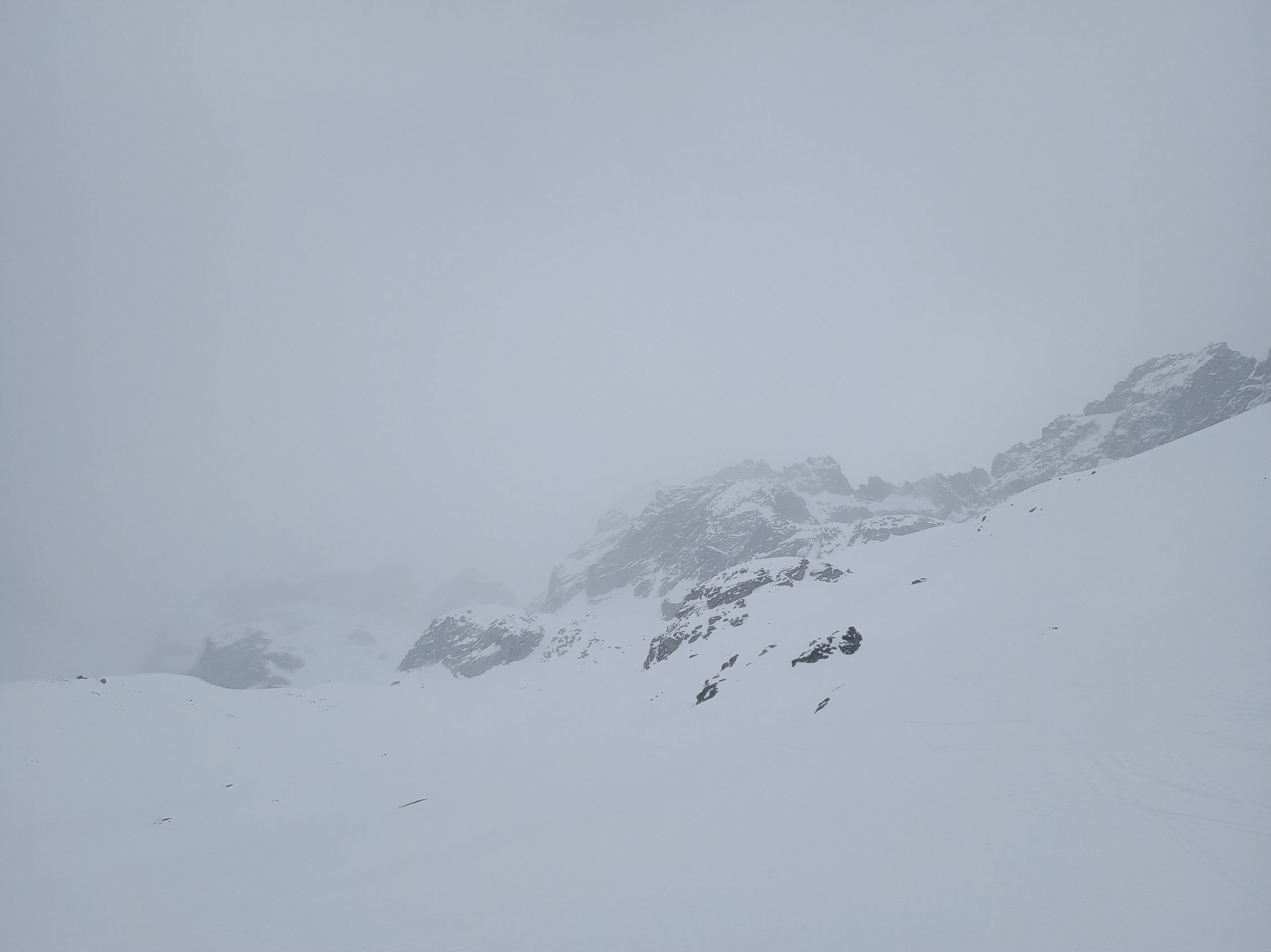 Aufstieg teils gespurt, aber durch den sehr starken Wind oft zerblasen. Querung unterhalb von Plan Bertol sehr gut mit Stangen markiert. Vielen Dank an das Team der Bertolhütte - das ist sehr vorbildlich gelöst und es gibt kein Missverständnis, wo man durch muss. Die Querung selbst ist aber zerfahren und der Schnee vom Wind bearbeitet, selbst mit Harscheisen ist es anspruchsvoll. Wir, und auch andere, sind mit Steigeisen und aufgebundenen Skis durch. Danach oberhalb Plan Bertol viel Triebschnee, unangenehm zum Spuren.