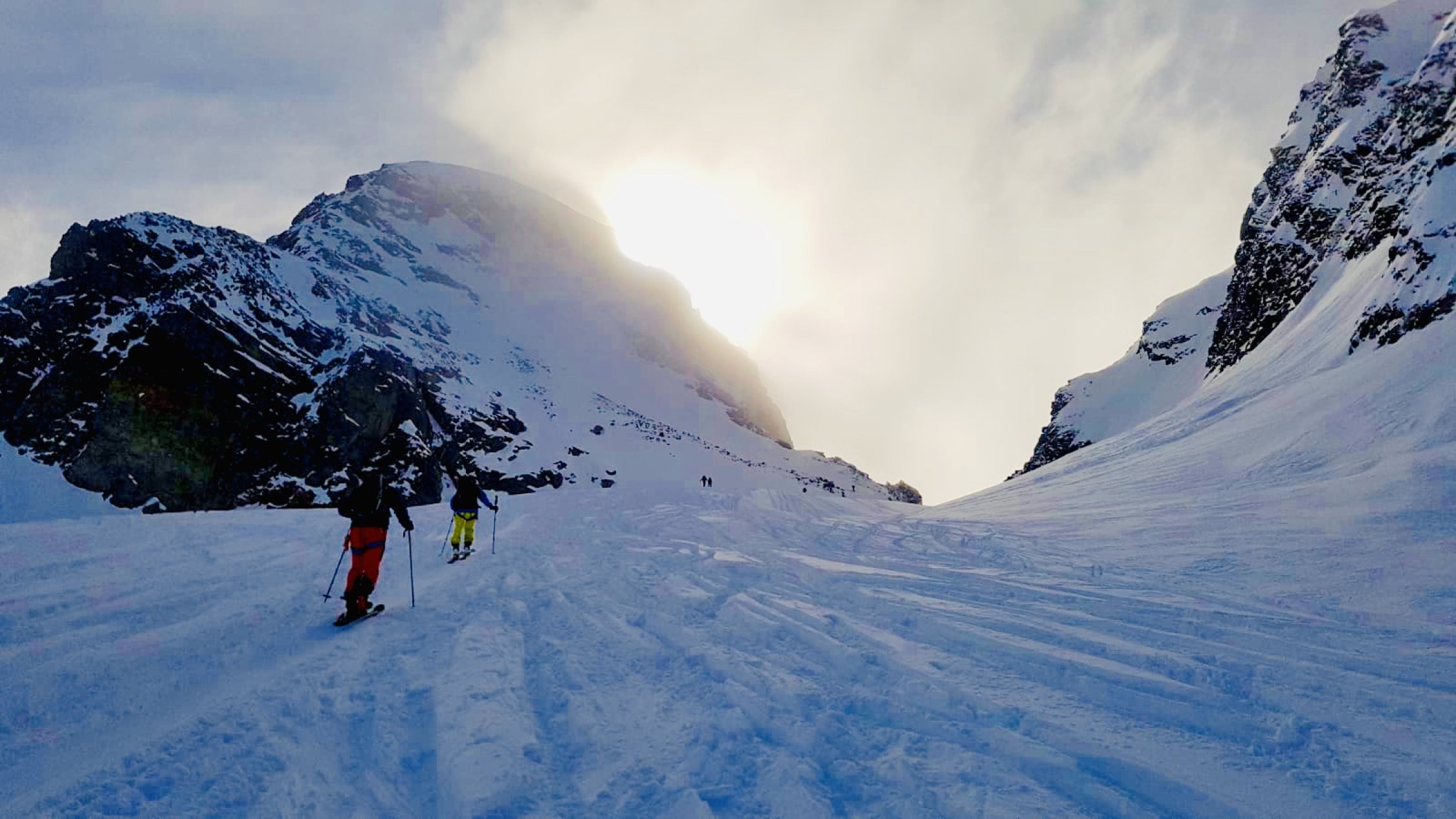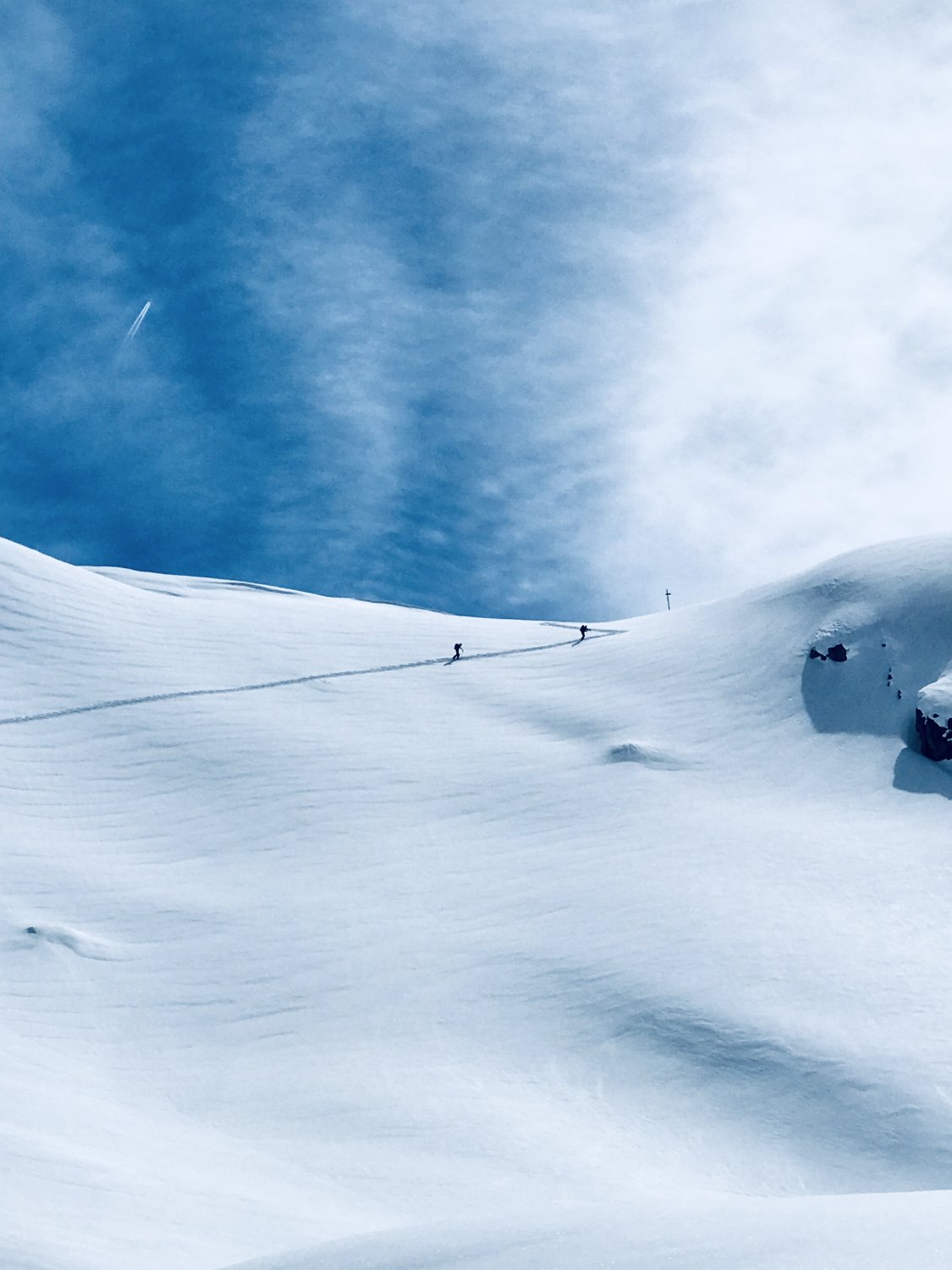 Sind in 3,5 h von der vollen Silvrettahütte problemlos über den Silvrettagletscher zum gleichnamigen Pass und die Fuorcla Cunfin, wo wir dann auf die ersten Gruppen von der Tuoihütte stiessen. Auf dem Ochsentalergletscher dann Zusammenschluss mit der Wiesbadenermeute. Wir legten einen Zahn zu, um zügiger voranzukommen, was uns im Abstieg genau zugute kam. Am Gipfel waren trotz dem Nebel (der Buin war nur kurz frei) sehr viele Gruppen unterwegs, was wohl dem Wochenende zuzuschreiben war. Wetter war morgens sehr wechselhaft aber ganz okay. Nach Mittag dann Bewölkungszunahme und oft diffuses Licht. Zurück über die Fuorcla Cunfin und Abfahrt via Verstanclator/Verstanclagletscher nach Monbiel. Landschaftlich sehr schön aber vom Schnee her nur Mittelteil noch Pulver. Viele Lawinenkegel auf beiden Talseiten, ältere und neuere! Unten bei Sardasca (1600m, ca. 100cm Schnee) dann Nassschnee bis Alp Garfiun (ca. 50-70 cm, im Wald natürlich weniger)!