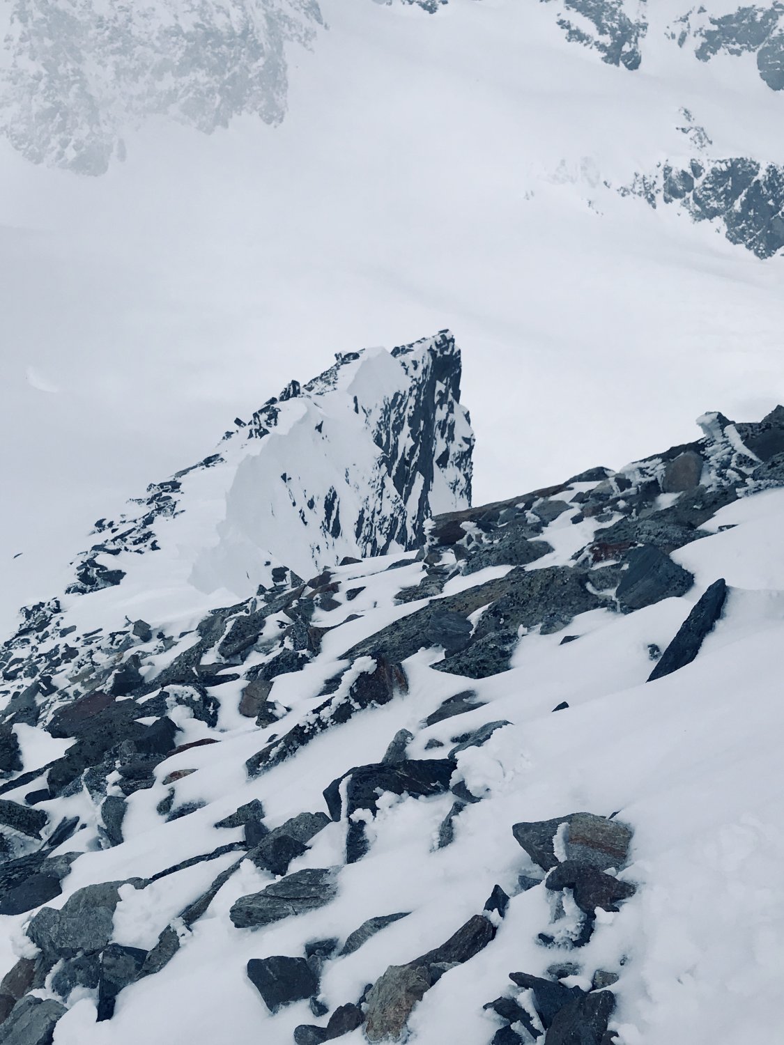 Schneearten haben wir alle angetroffen - von Presspulver über Pulver, gedeckelter Schnee, Bruchharsch, Sulz und Nassschnee. Firn- Hartschnee nur kurz an Graten und Übergängen.