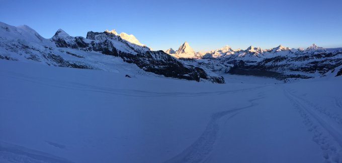 Nach den Schneefällen vom Wochenende wurden die Touren im Gebiet am Montag und Dienstag neu eingespurt. Signalkuppe und Zumsteinspitze wurden mit Steigeisen bzw. Eisausrüstung angegangen. Wir sind am Skidepot (4480 m) aufgrund von abfahrtstaktischen Überlegungen umgekehrt ;-). Auf dem Grenzgletscher schöne Pulverschneeverhältnisse. Wie schon im Bericht von P.P erwähnt ist nach wie vor Vorsicht bei den Querspalten auf ca. 4'000m geboten. Die Weiterfahrt nach Zermatt über den Gornergletscher, durch die Gletscherschlucht und über das Pistengebiet ist immer noch gut möglich.