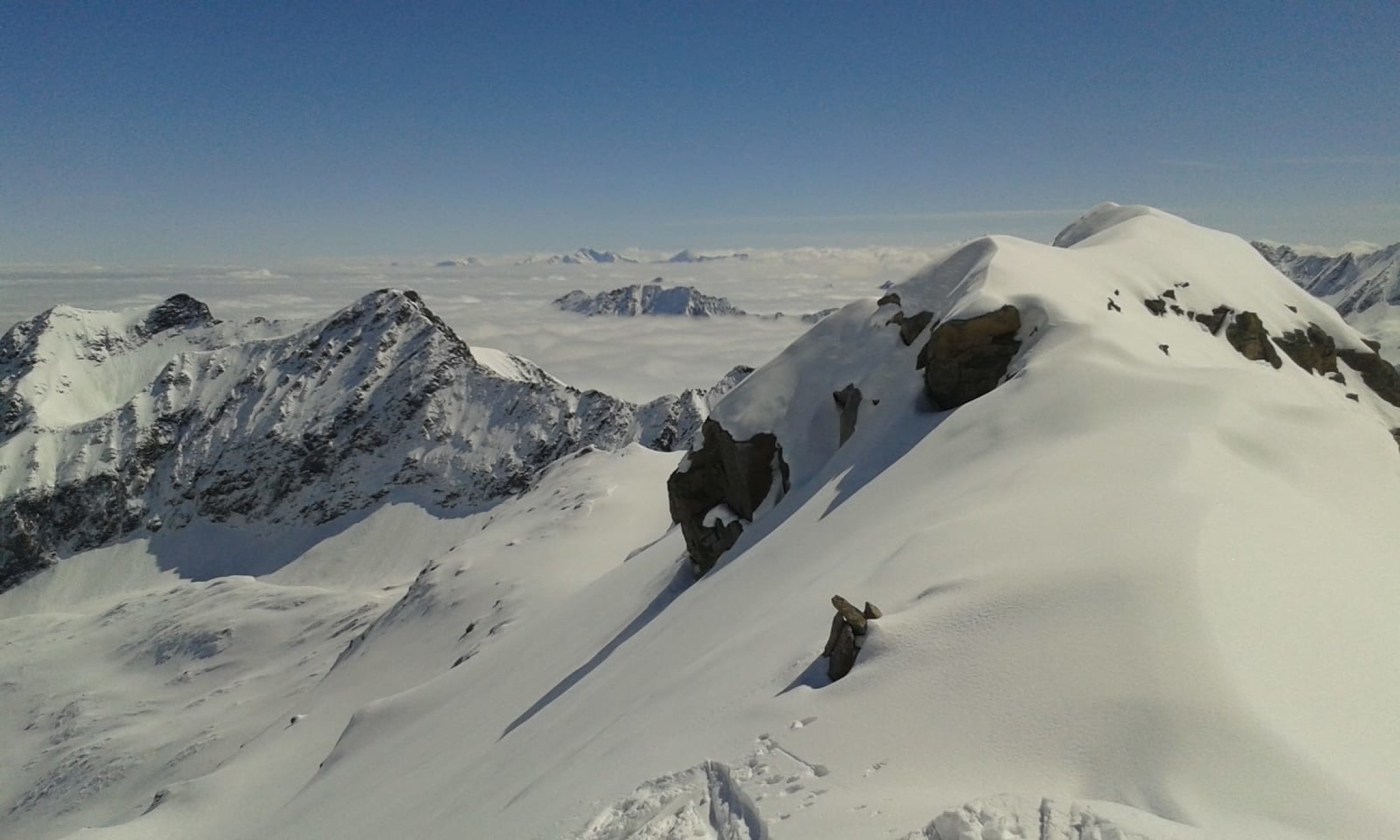 Gipfelgrat ohne Steigeisen möglich. Vorsicht auf Wechten