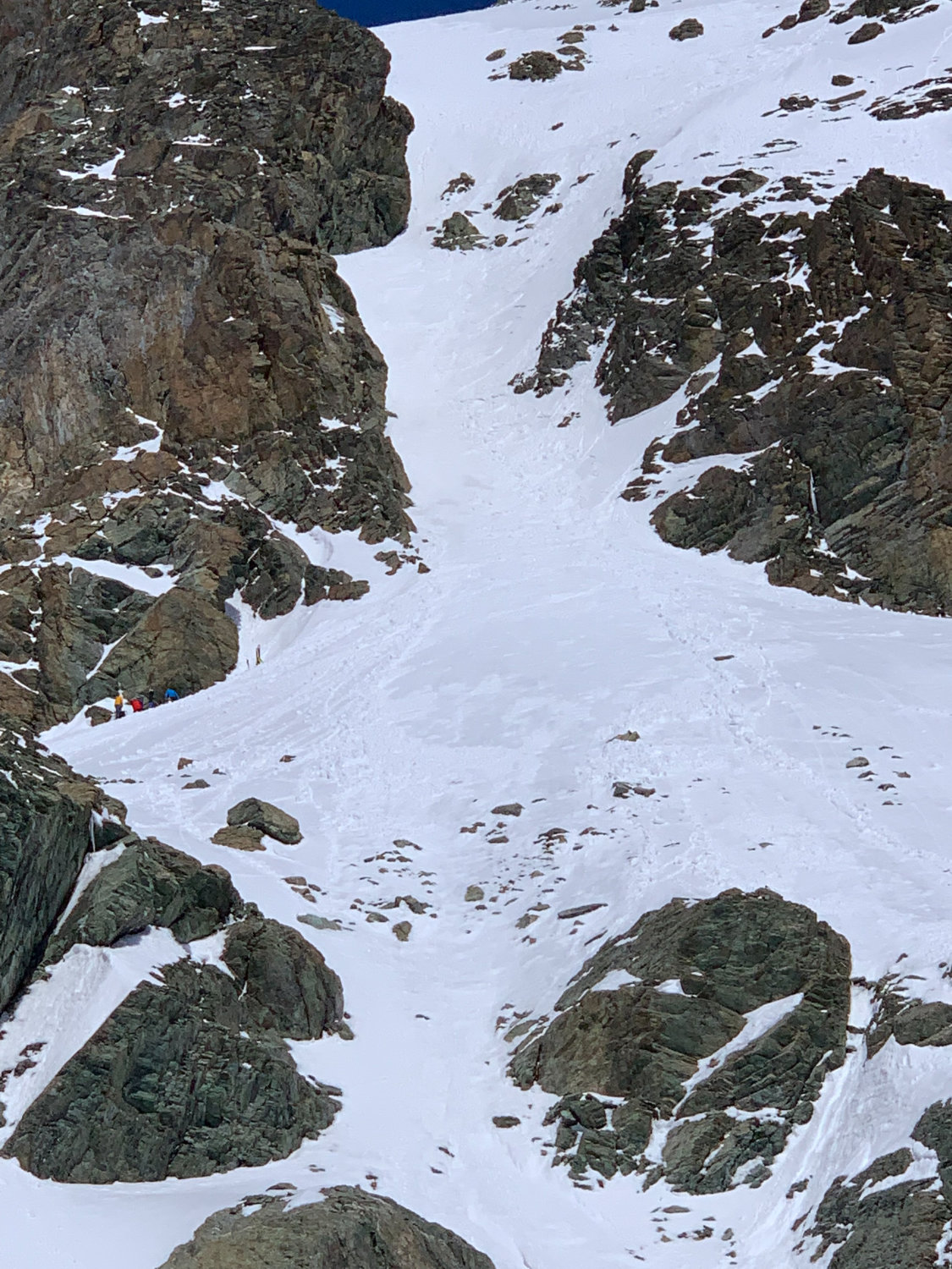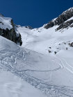 Im Gipfelcouloir sind Pickel und Steigeisen zwingend. Die Skiabfahrt durch das Gipfelcouloir ist momentan kaum möglich, da Lawinenbollen und unregelmässiger Pulver auf einer gefroren Schneeschicht, das Couloir sehr heterogen und instabil machen. Es lohnt sich die Skis durch das Couloir hoch zu tragen, da die obersten (flachen) 150m gut mit Skis begangen werden können und aufgrund des weichen Pulverschnees zu Fuss äusserst mühsam sind.