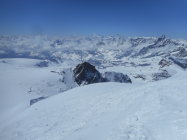 Vom Gipfel erblicken wir rund 62 Viertausender. Vom Mont-Blanc bis in die Bernina präsentiert sich ein Traumpanorama. Besonders die Königskrone des Zermatter- und Saasertals mit seinen 34 Viertausendern fasziniert mich ganz besonders.