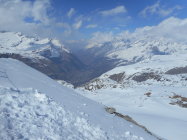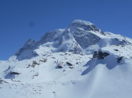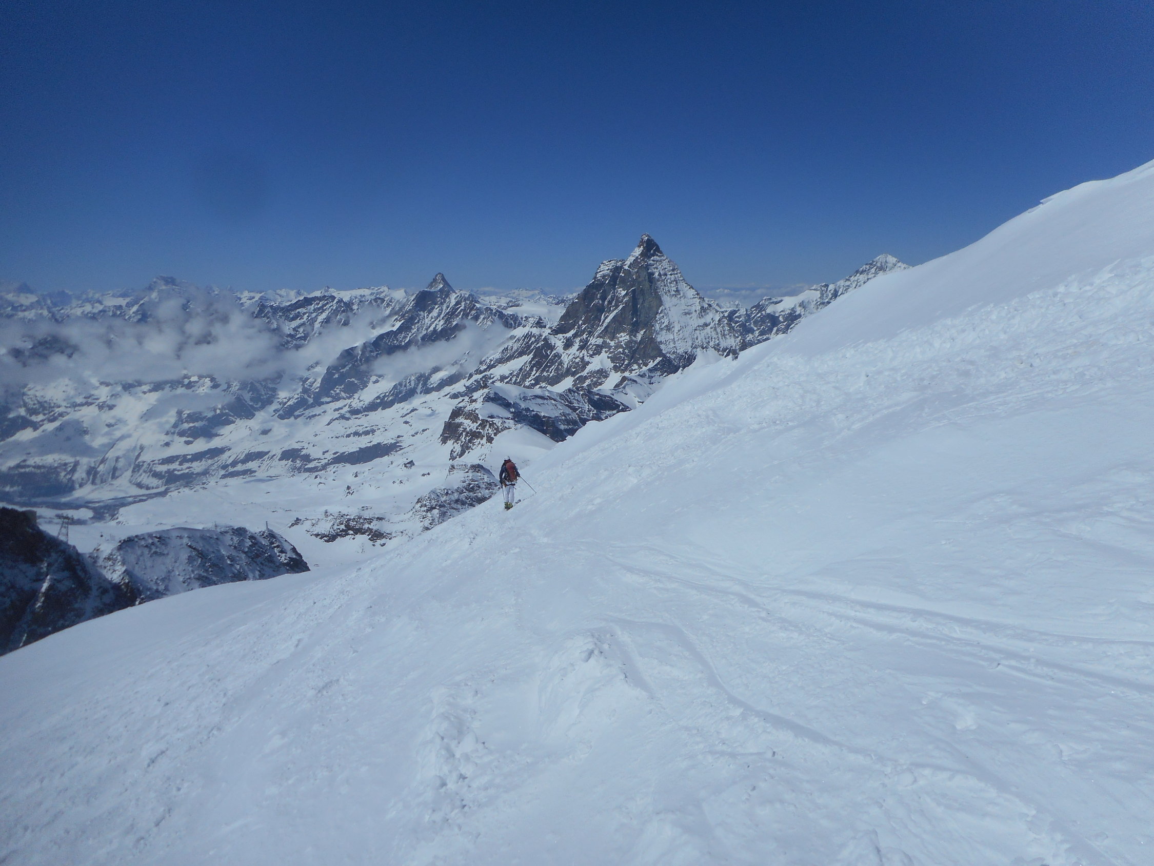 Aufstieg und Abfahrt: Wir waren bereits mehrmals auf dem Breithorn, aber heute konnten wir bei bestem Pulverschnee direkt vom Gipfel abfahren. Man kann selten direkt vom Gipfel abfahren. D.h. es hatte 30cm Pulverschnee auf harter und griffiger Unterlage. Teilweise hatte es kurze Eispassagen unter dem Pulverschnee, was jedoch problemlos zum Abfahren war. Oft werden die Skis beim obersten Bergschrund zurück gelassen. Die letzten Schneefälle wurden von weniger Windeinfluss begleitet.