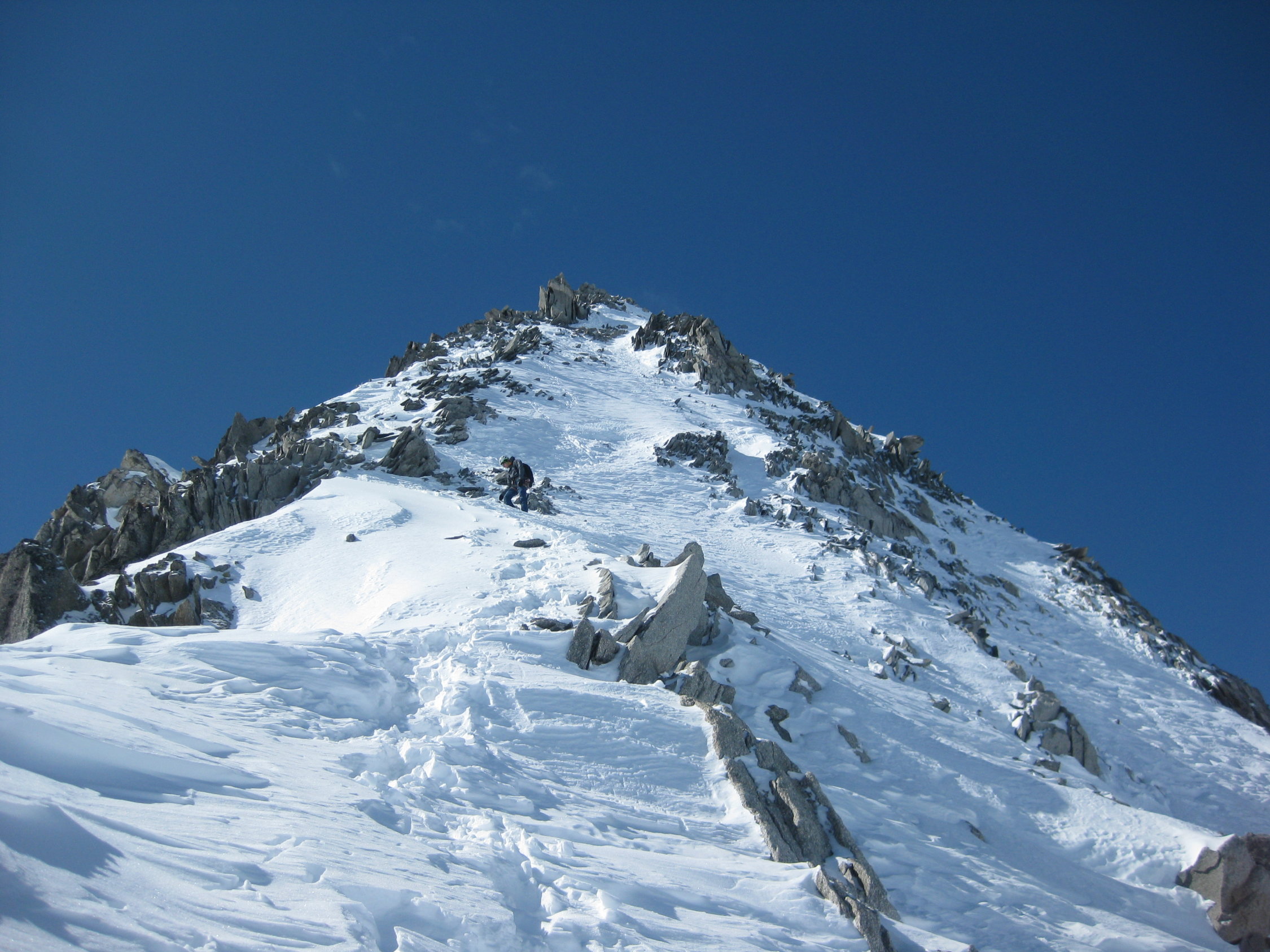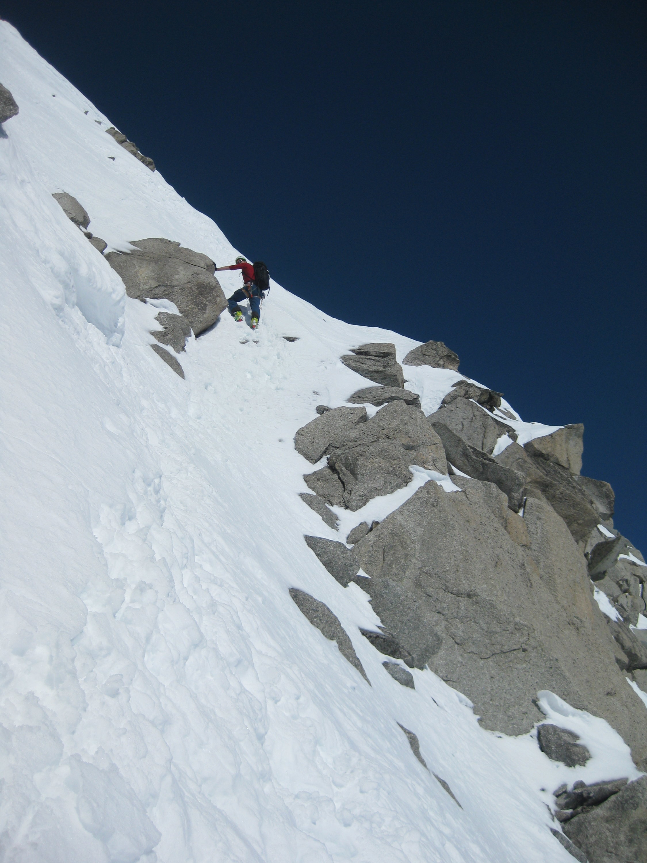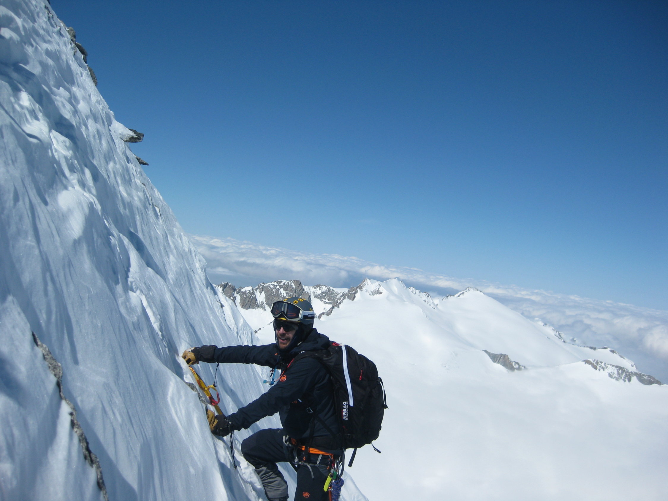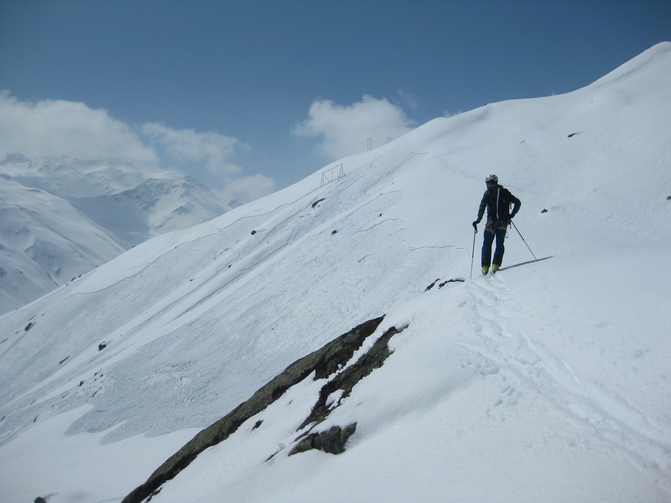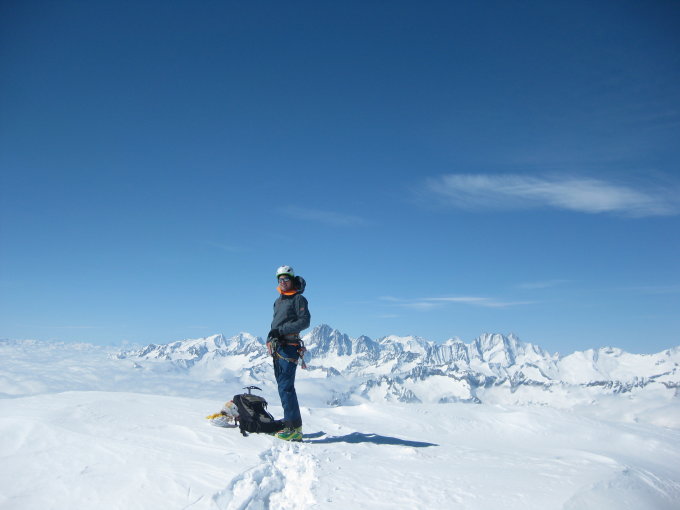Der Aufstieg hingegen hat Topverhältnisse. Ab Skidepot (Achtung Bergschrund!) gute Spur in zum Teil ausgetzter Kletterei zum Gipfel.(Bei Bedarf: es hat dort grosse Sicherungsstangen)