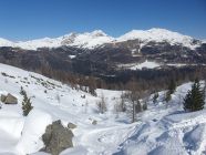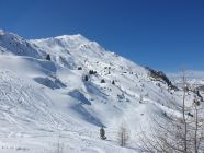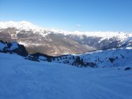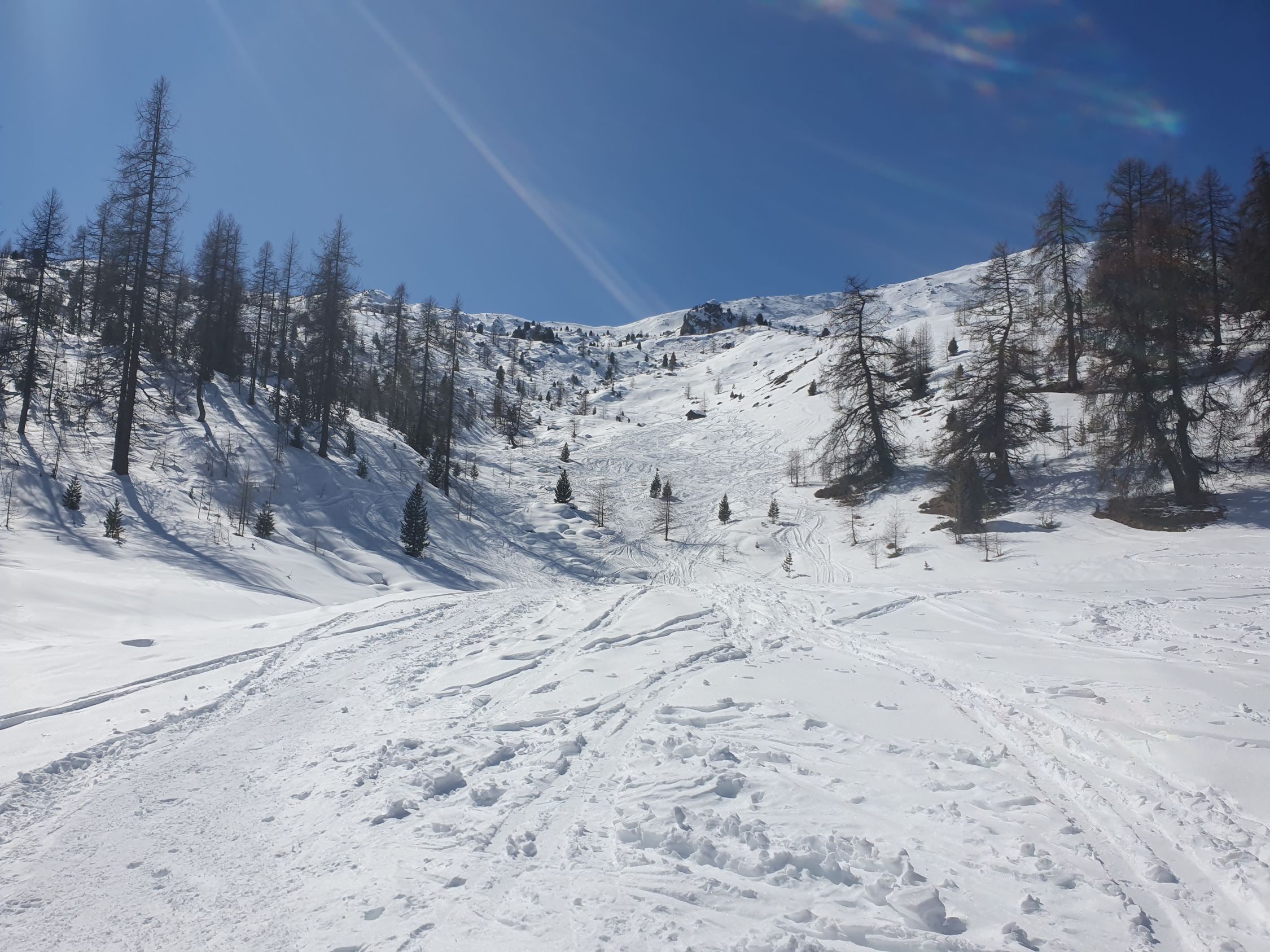 Die Abfahrt ist oben mit Bruchharst und windbearbeiteten Schnee unschön, danach in den Mulden jedoch genug Pulverschnee hinab zum Lai da Chazforà.
