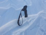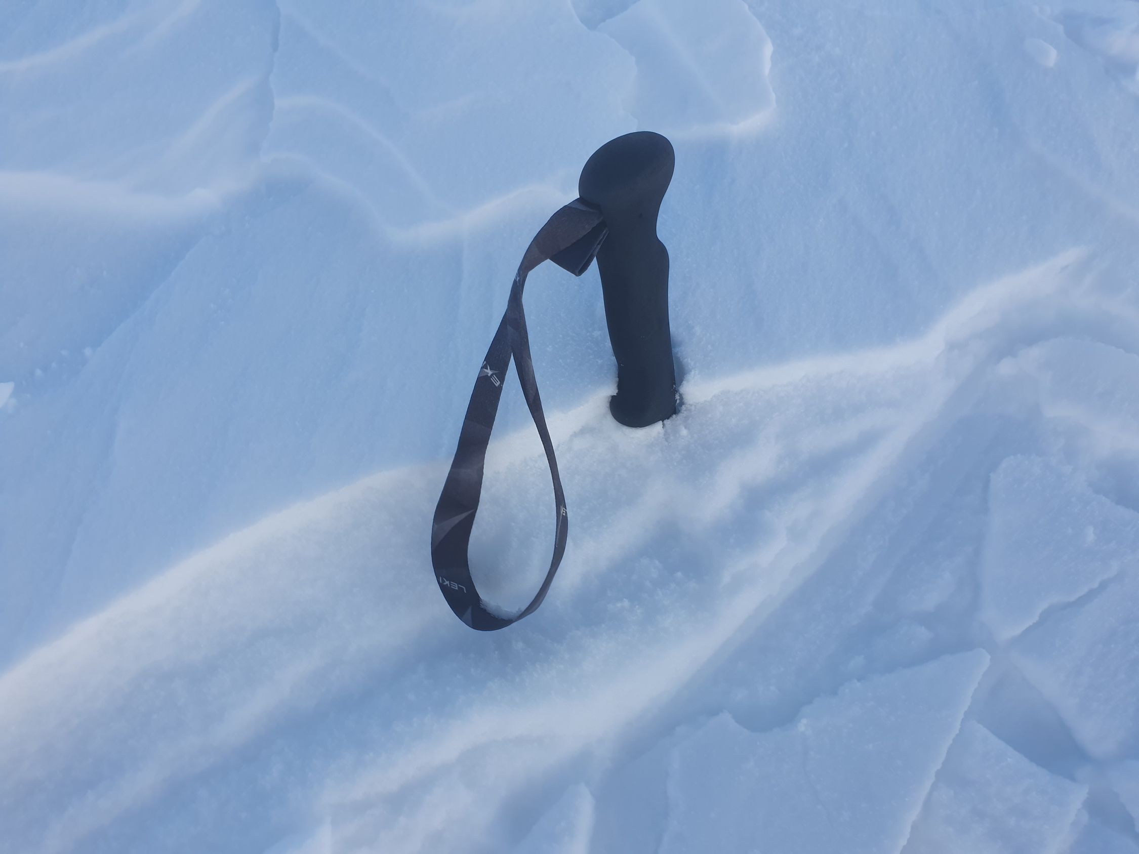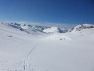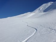 Kurze Fellabfahrt nach E und siehe da, eingeschneit sehe ich doch noch eine alte Spur in Richtung E, die sogar noch tragend ist. Hier ist der Schnee meist pulvrig, aber auch leicht windgepresst.