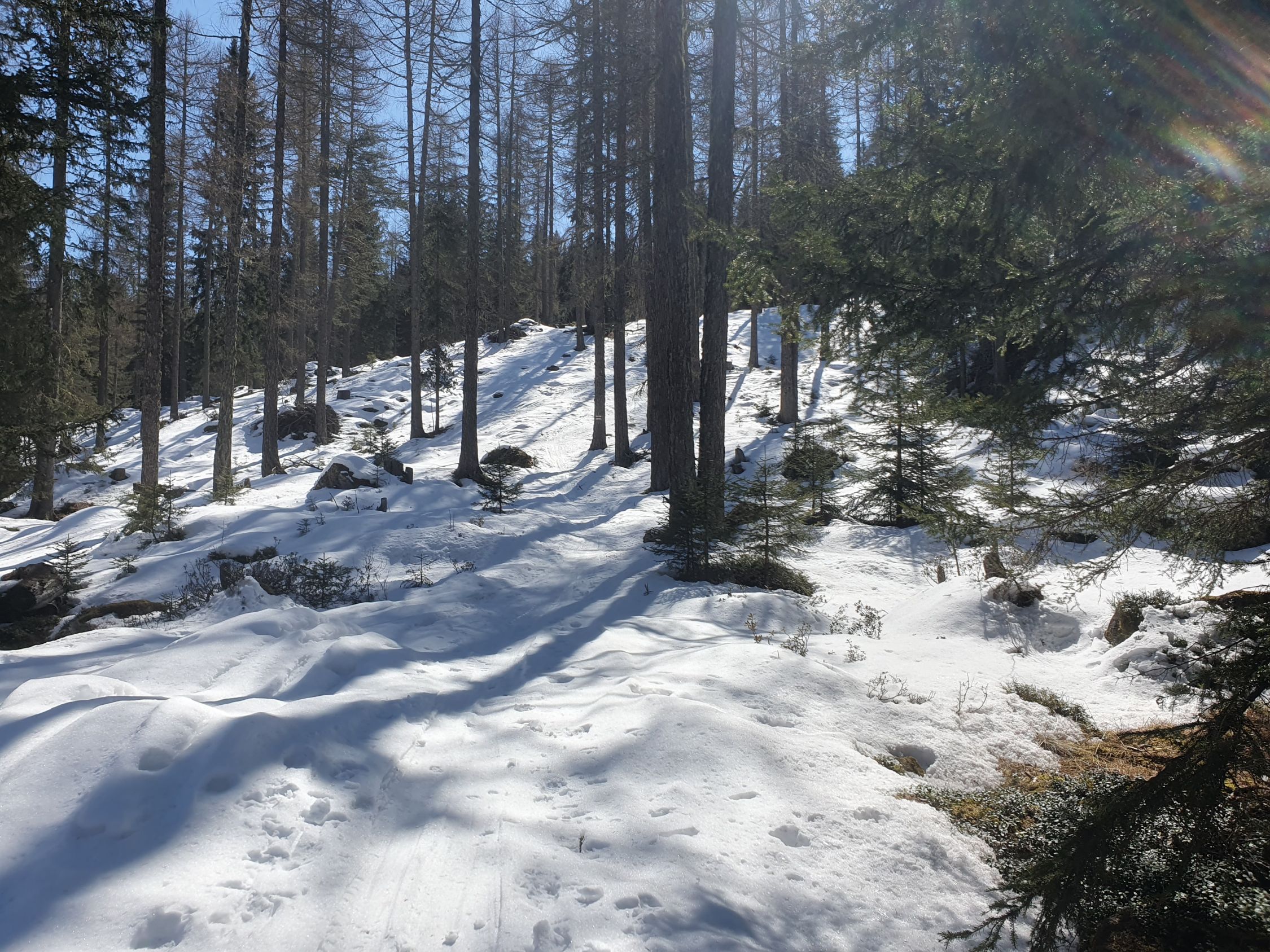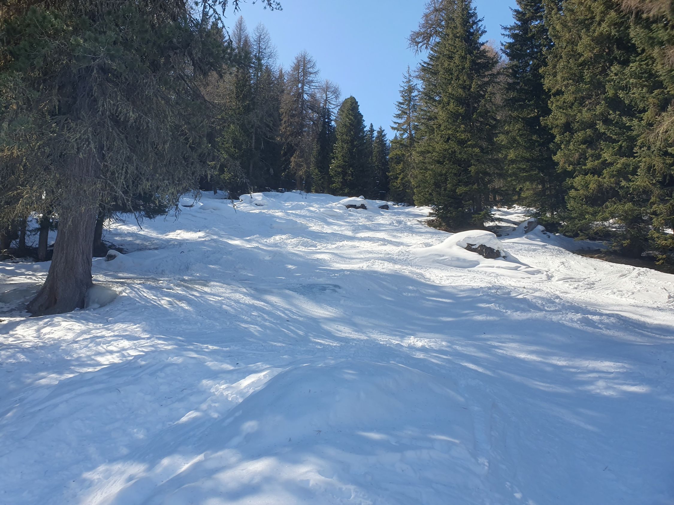 Von Tschierv erst um 12:00 auf einer sehr defensiven Spur durch den noch immer relativ gut eingeschneiten Wald zur Funtauna Grossa. Nun weiter auf pistenähnlichen Abfahrtsspuren, seitlich jedoch noch Pulverschnee vorhanden, weiter via Era da la Bescha einfach zum Lai da Chazforà und weiter den vielen Spuren zum Piz Chazforà. Von hier aus sehe ich auch viele Spuren beim Piz Dora, jedoch nur eine Schneeschuhspur bis zur Mitte der Mulde in Richtung Piz Turettas.