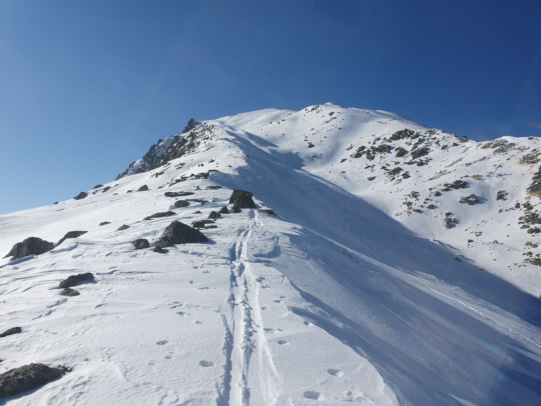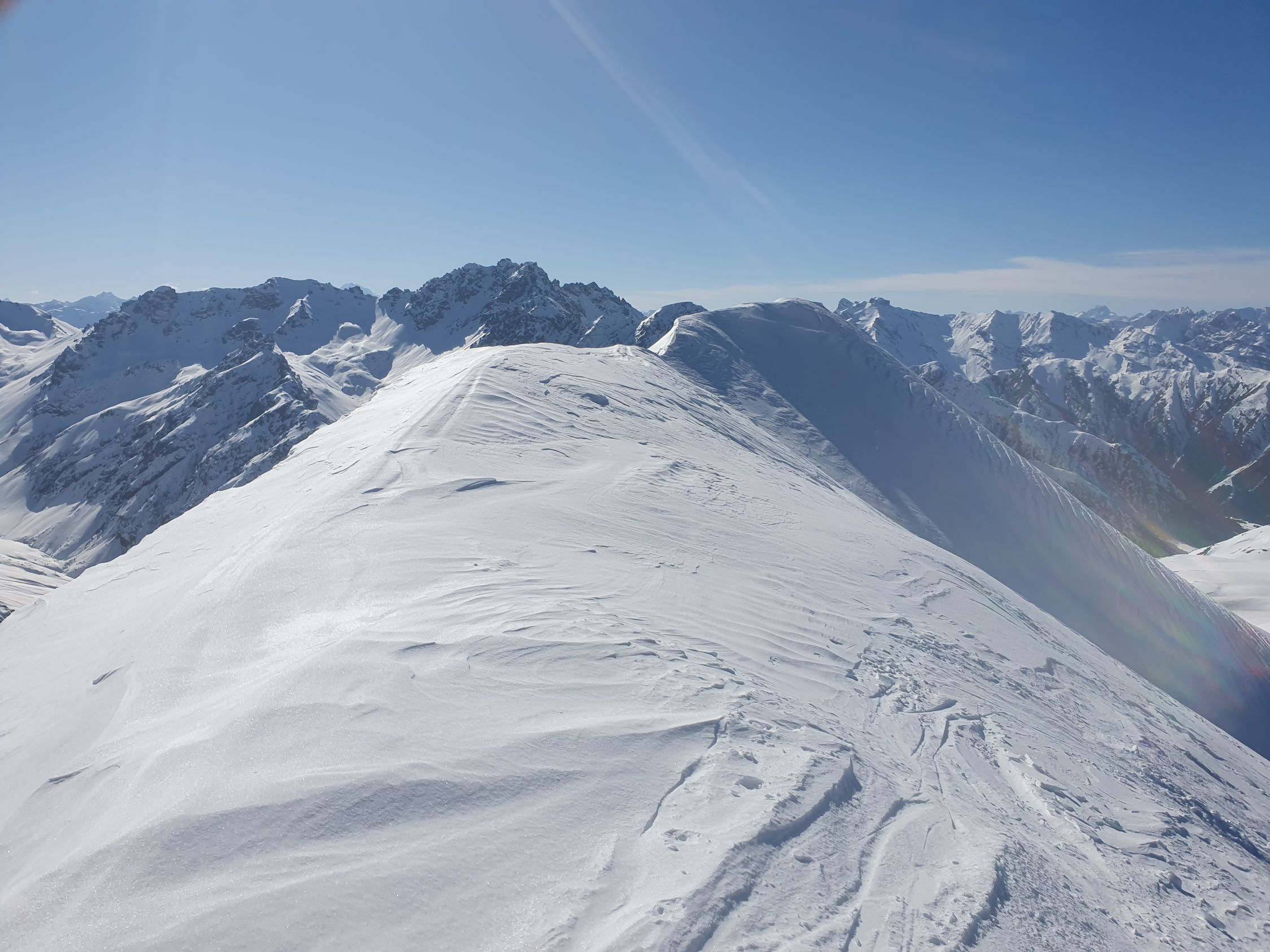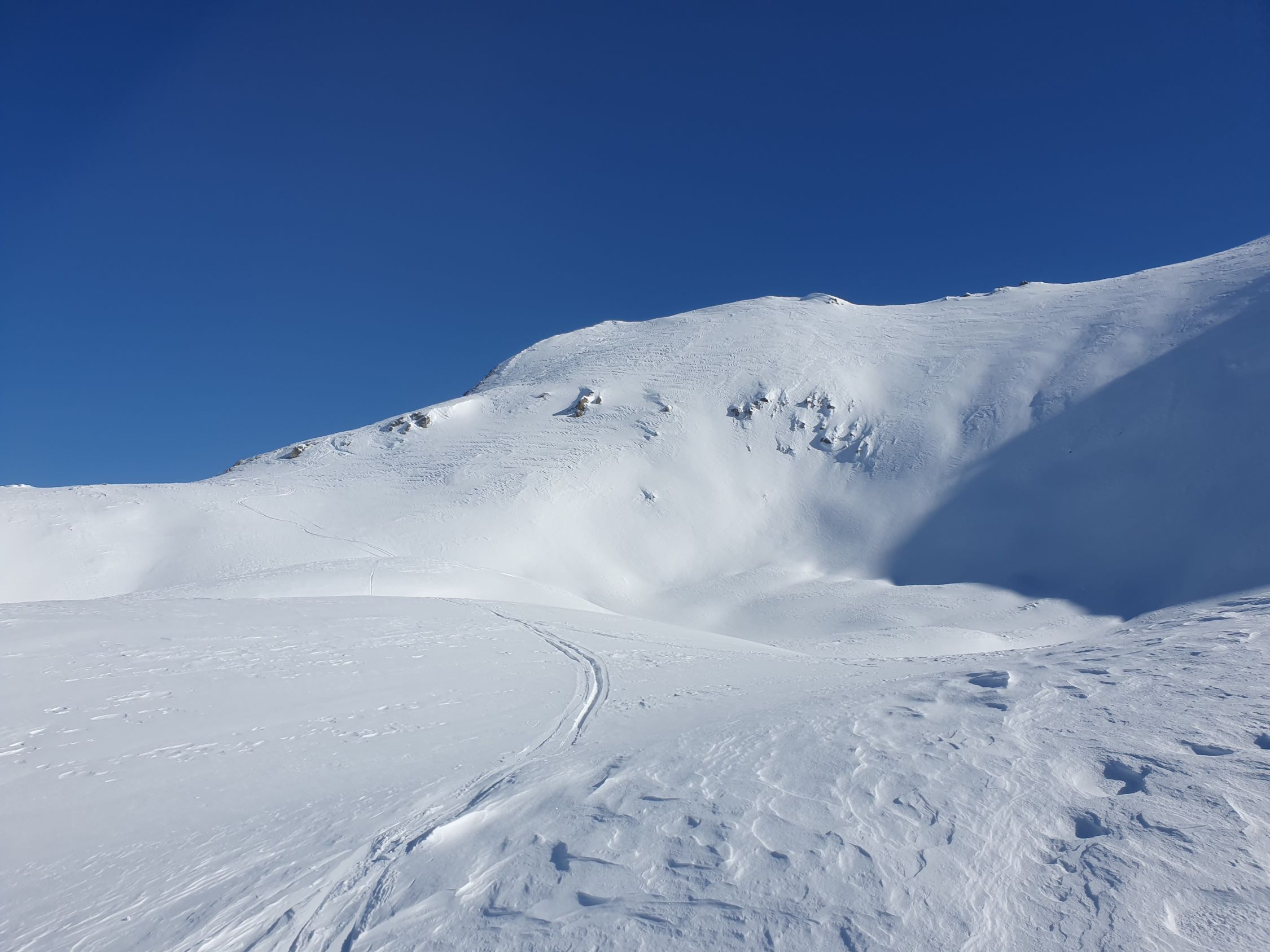 Ich versuche den Hauptgipfel direkt von N auf eine Rippe zu besteigen (ca. 35°), hier hat es eine windbearbeitete wellende harte, aber dennoch einsinkende Schicht mit viel Pulverschnee darunter, somit im Grunde aktuell kein sicheres Gehgelände. Und siehe da; ich löse bereits nach 20 Hm einen 10 Meter Riss um mich herum und ich habe Glück, dass der Rutsch bereits nach ein paar cm zu stehen bleibt. Oben wird es noch steiler, somit auf leisen Fellen steige ich wieder schnell zurück und folge dem Sommerwanderweg hoch zum Vorgipfel bei P2958, wobei auch hier das Gelände zuletzt (wenig über ca. 30°) mir nicht wirklich sicher erscheint, da der Schnee dort genau gleich wie vorhin beim Riss war, nur etwas weniger steil. Der Übergang von P2958 zum Hauptgipfel bei P2963 ist aktuell wegen zu viel Triebschnee besser zu unterlassen.