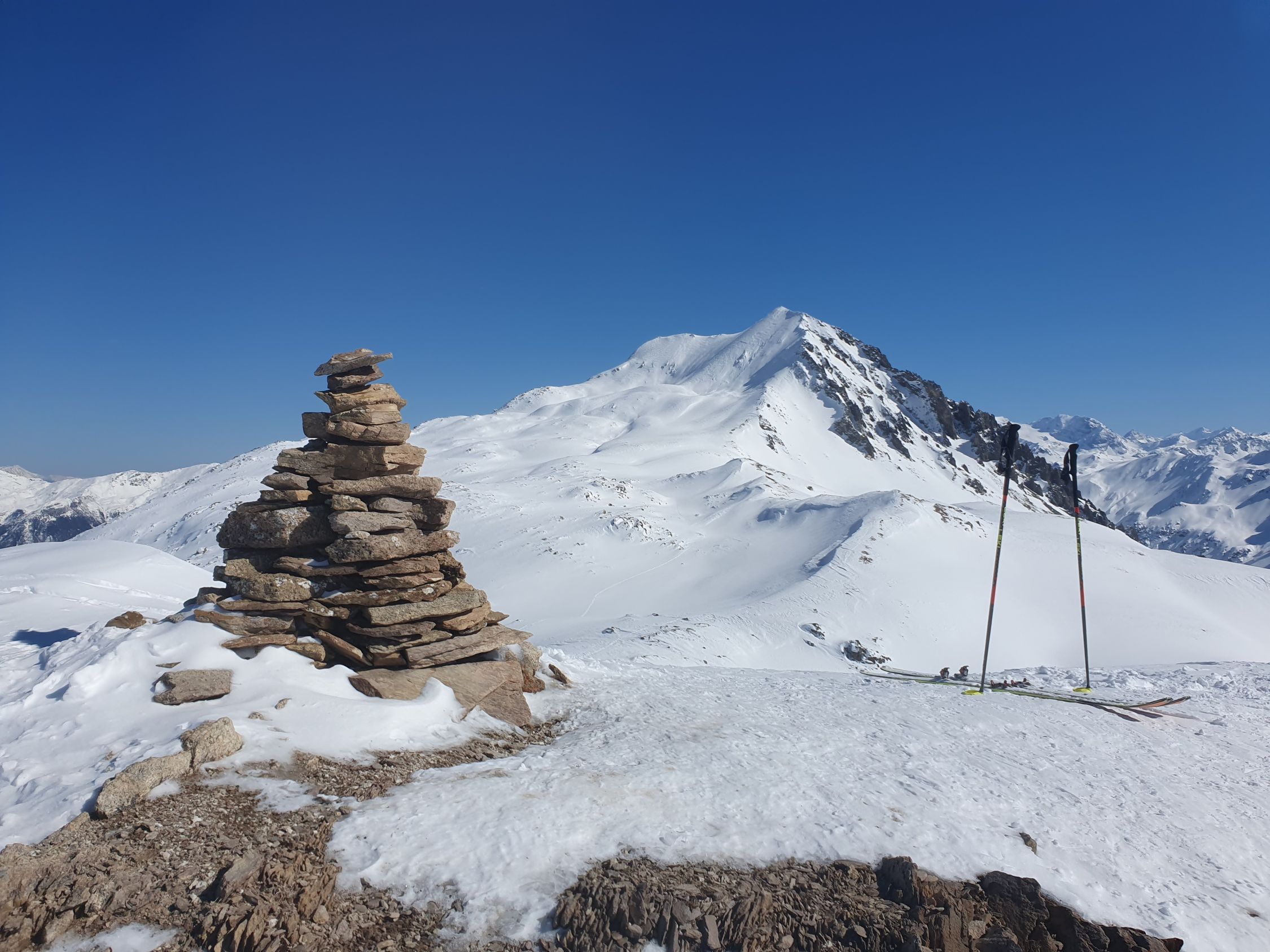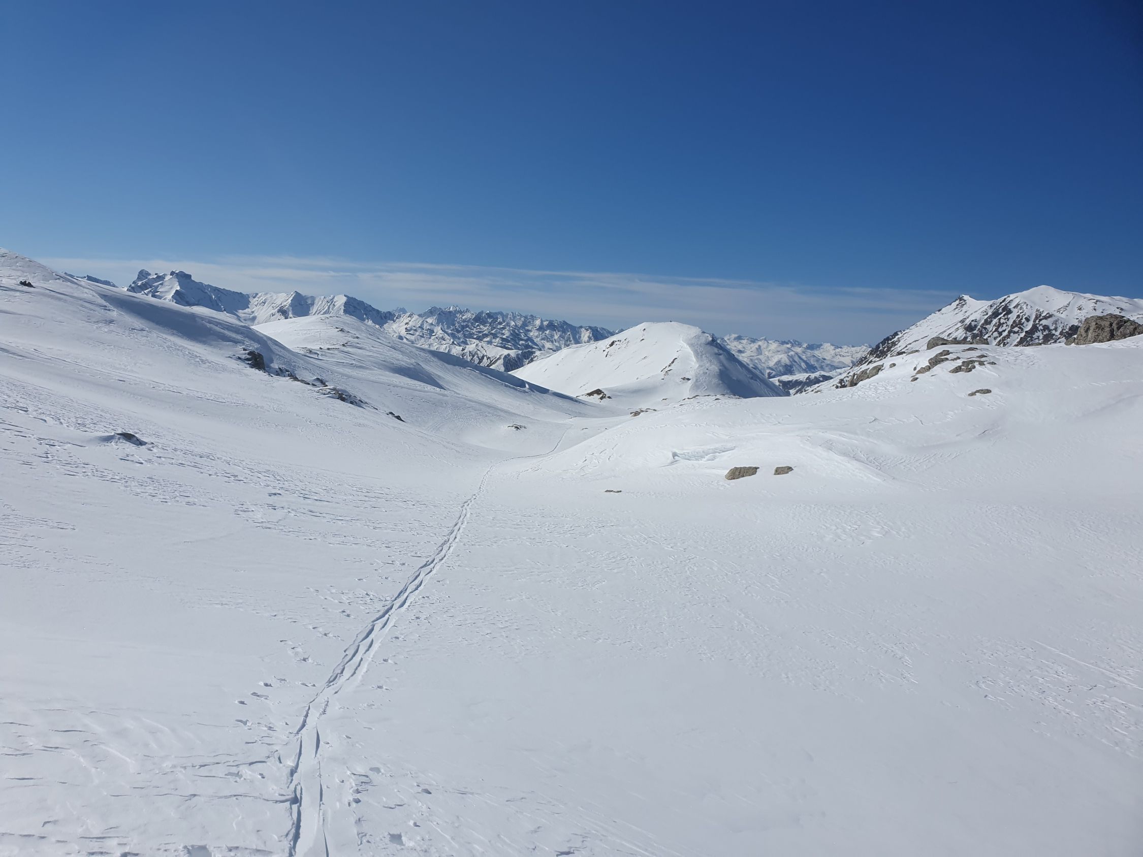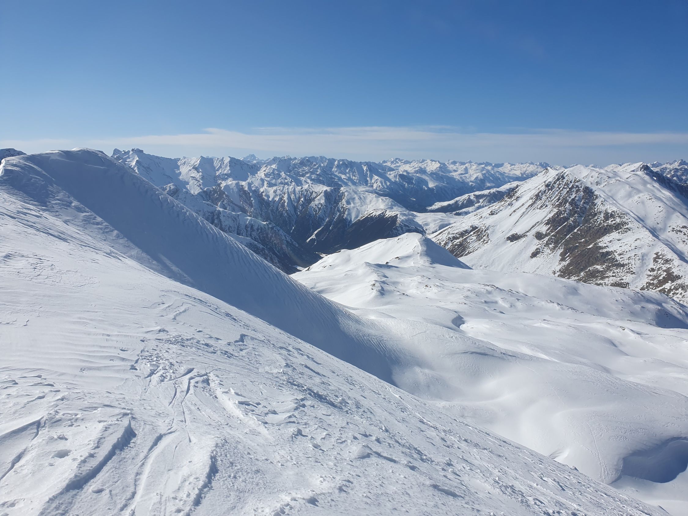 Ich versuche den Hauptgipfel direkt von N auf eine Rippe zu besteigen (ca. 35°), hier hat es eine windbearbeitete wellende harte, aber dennoch einsinkende Schicht mit viel Pulverschnee darunter, somit im Grunde aktuell kein sicheres Gehgelände. Und siehe da; ich löse bereits nach 20 Hm einen 10 Meter Riss um mich herum und ich habe Glück, dass der Rutsch bereits nach ein paar cm zu stehen bleibt. Oben wird es noch steiler, somit auf leisen Fellen steige ich wieder schnell zurück und folge dem Sommerwanderweg hoch zum Vorgipfel bei P2958, wobei auch hier das Gelände zuletzt (wenig über ca. 30°) mir nicht wirklich sicher erscheint, da der Schnee dort genau gleich wie vorhin beim Riss war, nur etwas weniger steil. Der Übergang von P2958 zum Hauptgipfel bei P2963 ist aktuell wegen zu viel Triebschnee besser zu unterlassen.