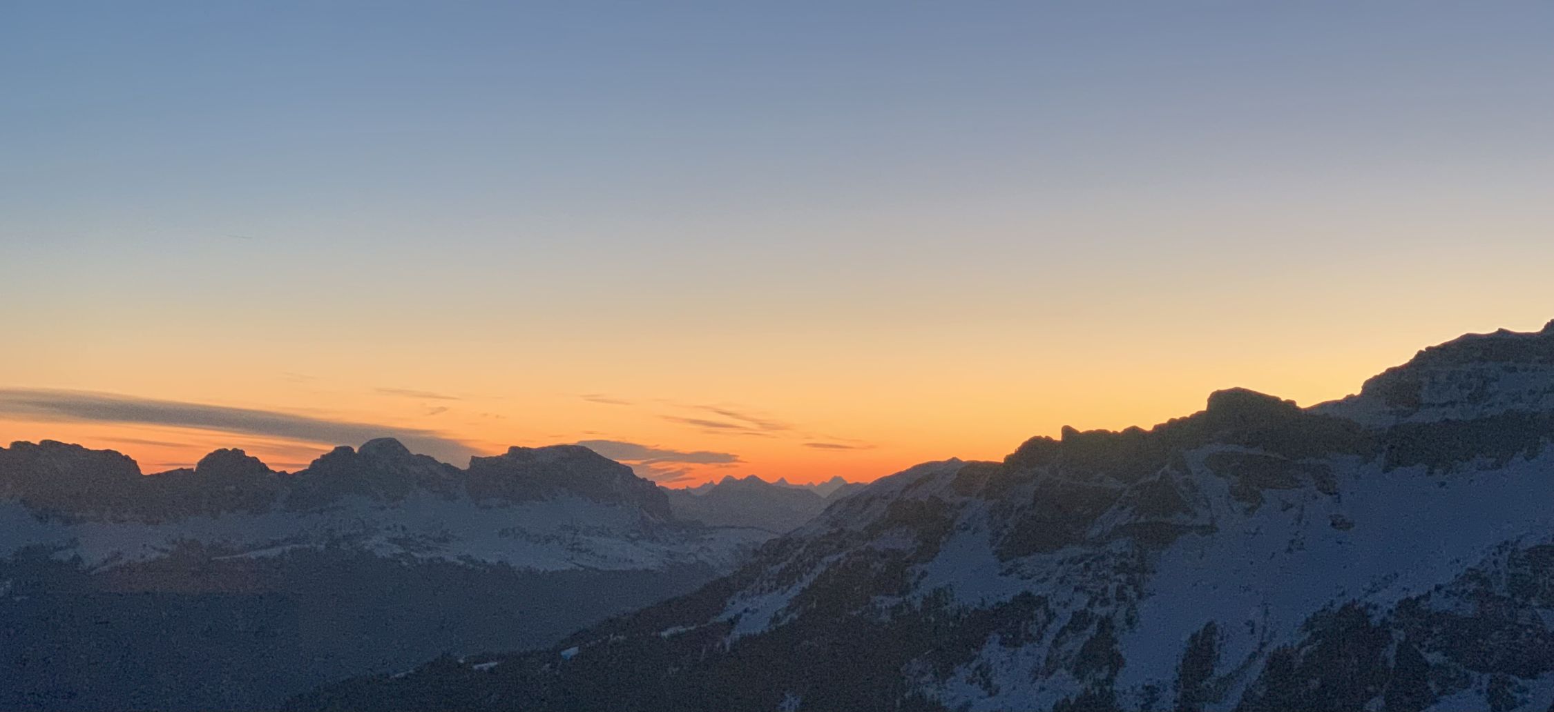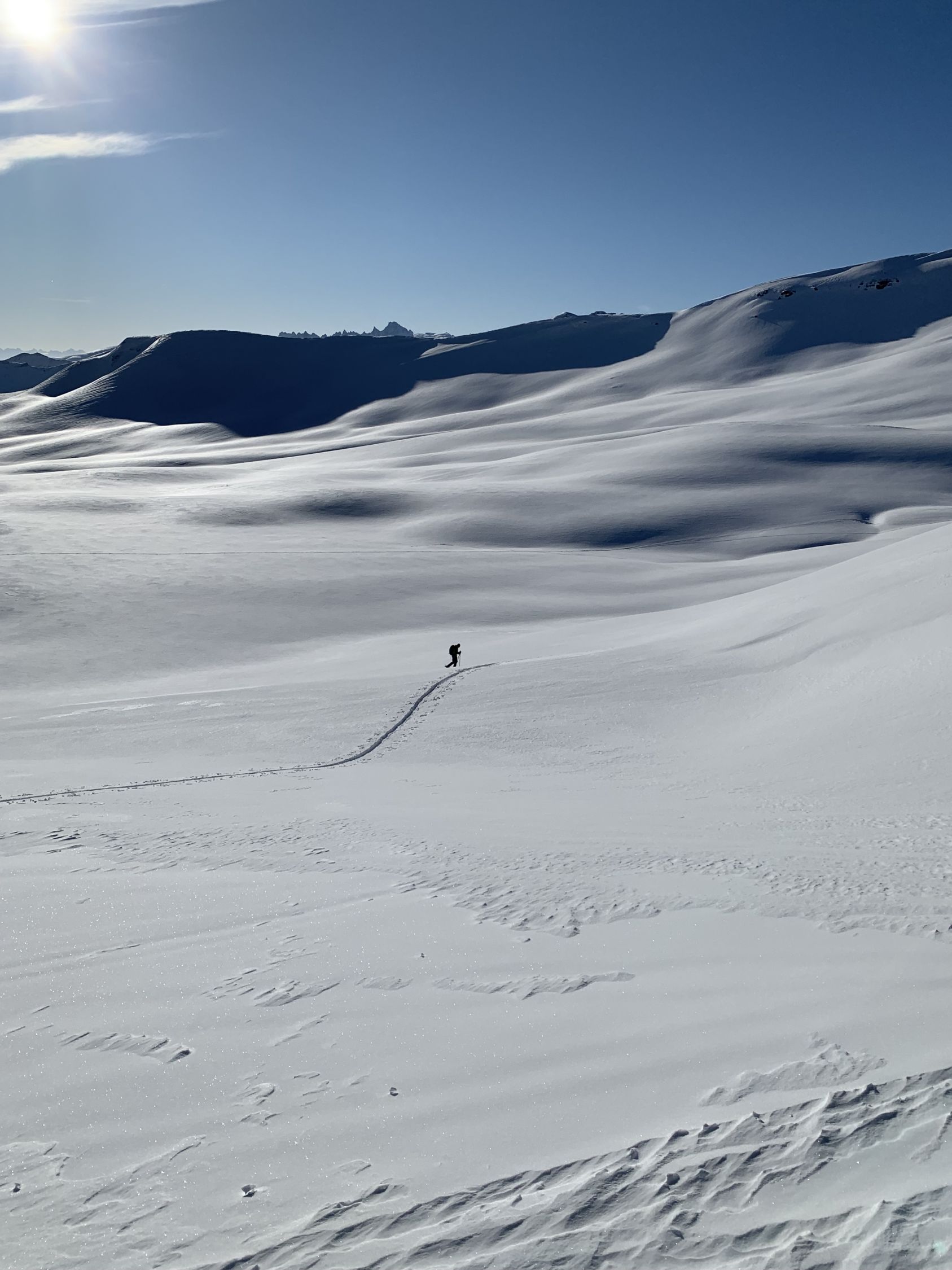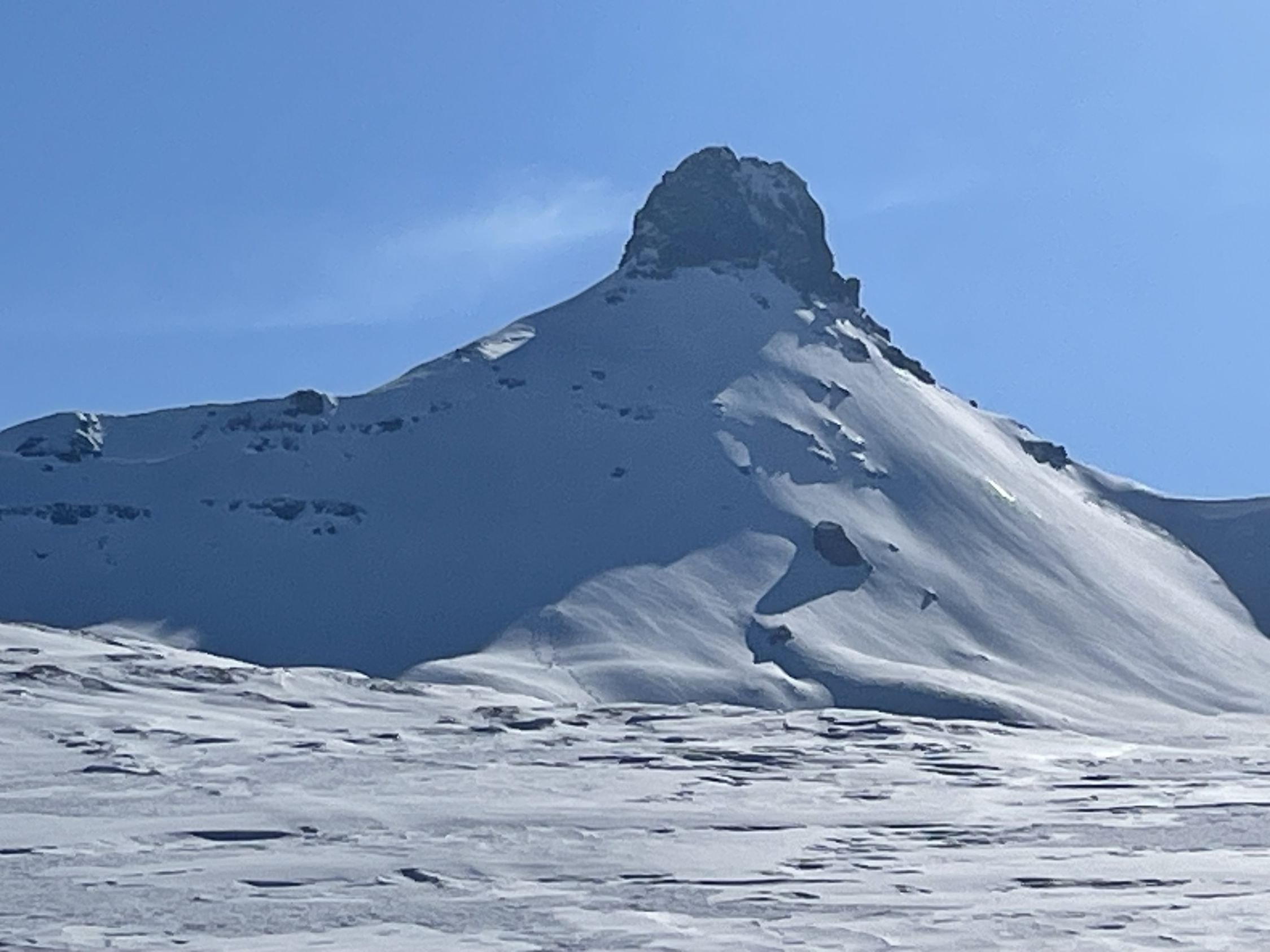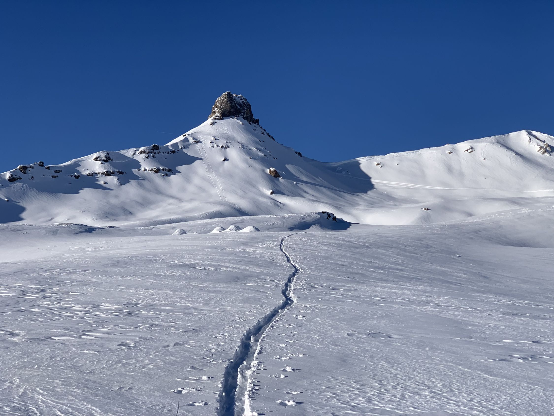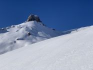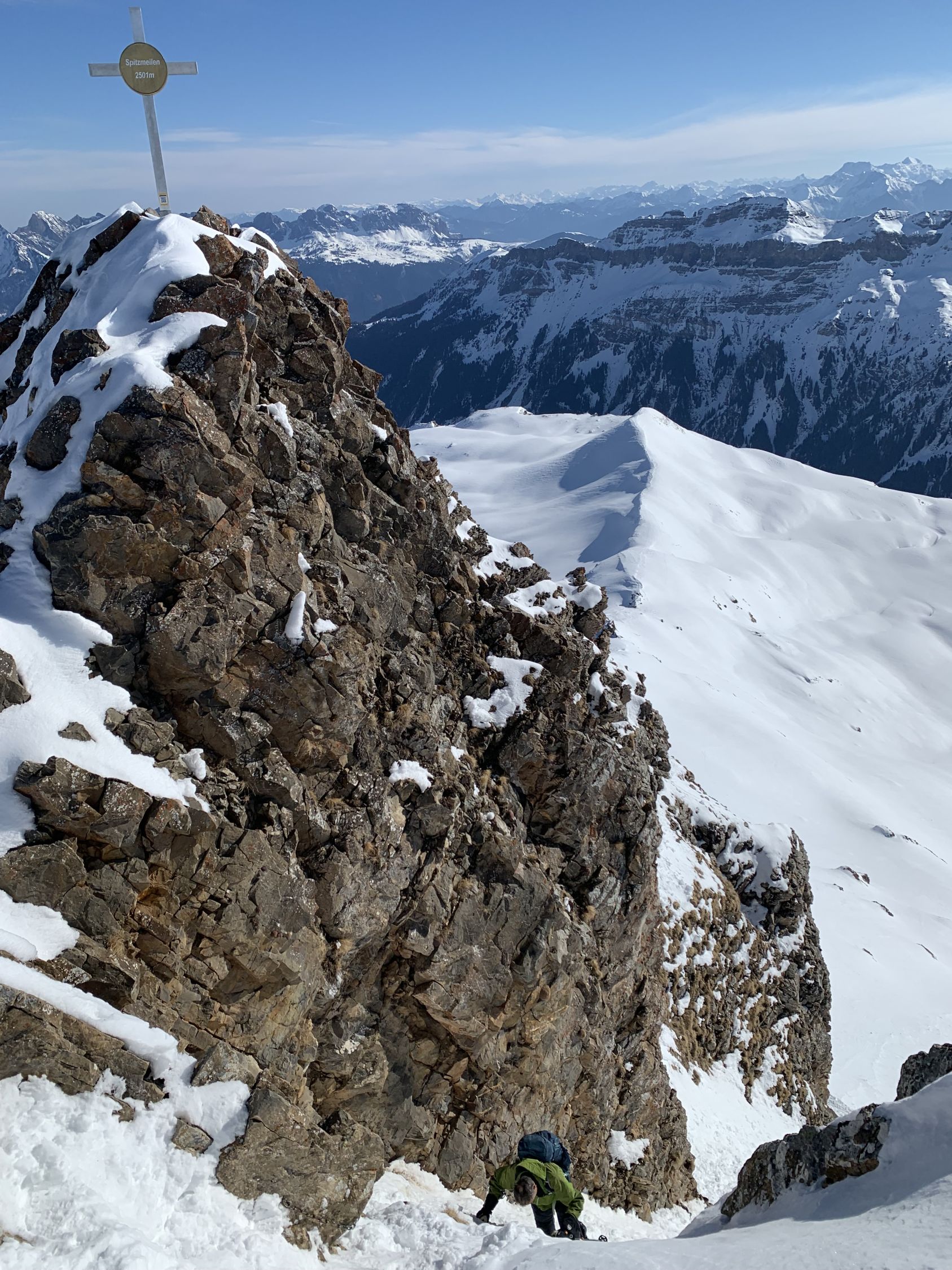 Ausgezeichnete Verhältnisse heute - wolkenlos schön (erst am Nachmittag ein paar Schleierwolken), überraschend windstill und ein ebenfalls überraschend schöner Pulverschnee, nur vereinzelt leicht gedeckelt und weiter unten etwas schwer. Der Gipfelaufstieg ebenfalls bestens eingeschneit, Kette frei. Es gab schlicht nichts zu meckern heute ..